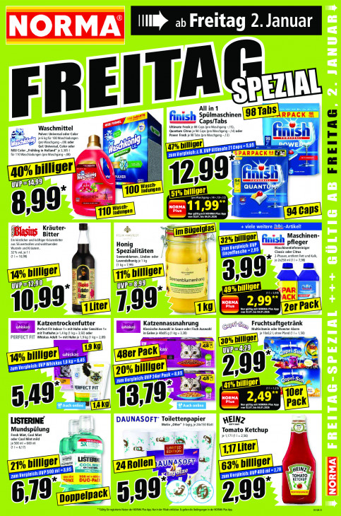 Bitte beachten Sie, dass dieser Text automatisch generiert wird und möglicherweise Fehler enthältIBD 2» Freitag 2. Januar ITA All in 1 enden ene) FRE Spülmaschinen finis Ultimate Fresh je 88 Caps (pro Waschgang —15) Caps/Tabs Waschmittel Quantum Citrus je 94 Caps (pro Waschgang -,14) oder Pulver: Universal oder Color Ber Power Fresh je 98 Tabs (pro Waschgang —13) je 6 kg für 100 Waschladungen (pro Waschgang 09) oder 98 Ge) Gel: Universal, Color oder Cé 2 WE NEU Color „Frühling in Holland” je 3,305 | 77% billige B. up Uitimat Te für 110 Waschladungen (pro Waschgang —08) PRT LL L Z el (2 ger FREITAG ape pill Uk 2,99 asch- QUANT We 00% dungen 110 ien 11,99“ 8.99. € OE adungen = von 0201. bis 04.01.2026 DATE A 5 Kräuter- es = PAC CO Fn Sh Va U o Bitter al im Bugeldes) Maschinen- Ein köstlicher und kräftiger Kräuterbitter 37% nilliger| finish aus 56 wertvollen und wohltuenden Honi De id pfleger Wurzeln und Kräutem. 32% vol, je 1 | Spezialitäten um Vergleich: ij 95 Classic oder Citrus Maschinentiefenreiniger (11= 10,99) Sonnenblumen-, Linden- oder ALT e= fg 2-Phasen, entfemt Fett und Kalk, lavendehonig jet kg je 2x250 ml (1 1= 7,98) 2% billiger 3,9 WVP= 82 4 49% billiger 1=598) E Ar 10 gg er le 199: Nur gütig mit NORMA Plus App er Pac von 02.01. bis 04.01.2026 Katzentrockenfutter Katzennassnahrung ee Perfect Fit Indoor 14 mit Huhn oder Sensitive 1+ Klassische Auswahl in Sauce oder Fisch Auswahl Gr #7 Muitivitamin oder Monster Alarm mit Truthahn je 1,4 kg (1 kg = 3,92) oder in Gelee je 48x85 g (1 kg PERFECT FIT Whiskas Adult 1+ mit Huhn je 1,9 kg (1 kg = 2,89) A m a a me 3 0% billiger UVPE eld ” his ee Ce 4% billiger A to AC uvpWhiska ETI held Be hi PANEL 20% pinigers 99! (es 8,65 2, > el Cu EU SA & LT, FERFECT FIT re ard ard LE Oer 19e nd TES 2,49" 549: ; Sa 13, = von 02.01. bis 04.01.2026 pack LISTERINE DAUNASOFT: Toilettenpapier Motiv „Otter 3-lagig, je 24x150 Blatt MEIN. wel 1868 = Fresh Mint, Cool Mint Mundspülung je 1171(11= 2,56) Tomato Ketchup oder Cool Mint mild 1% we je 500 ml + 600 mi A (1=617) 3 CEL LISTERIN RAC a COOLMIN AUNASOE pn 7% billiger 3,95 9* di, TL MEINZ, PT EI U ML niche PT U TOMATO // KETCHUP VEK Ik 19 ipack -© 99 = 6, Dope 599 2 "Güg für registrierte Nutzer der NORMA Pls App. Nurin.der lie einlösbar Es gelten die Bedingungen in der NORMA Plus App. 01260
