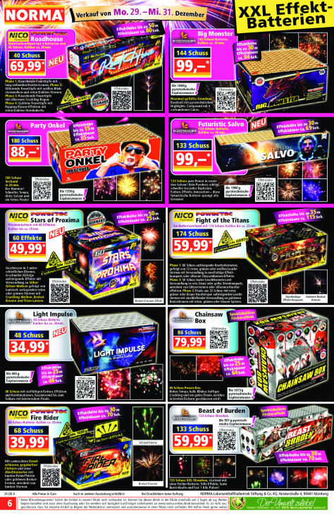 Bitte beachten Sie, dass dieser Text automatisch generiert wird und möglicherweise Fehler enthältar = = wei u a) on Mo. 29.-Mi. 31.0 Eff ekt- XX — ezembe veren! vi D 7. ü es 4 N 50m Ba tterien AZ bis z! 80 A NICO Effektdauer a: - Big Monster k Roadhouse = = Ee en 2 144-Schuss-Batteri NS = SILVESTERZAU EN ès Mehrfachverbund mit 4 Batterien und ET 2 Éffekthôhe CHE TELE ETUIS ‘y bis zu et .. En 144 Schuss ktdauer = 40 Schuss PLUS ca.84sek = = LA meo ZX =, = = = = 2 Fr ca ur SE + Zt ee EEEN -7 sa 99, RESETTEN kh lang-ziehenden Knister-Lanzen. Phase is 18009 OTT Glitzernde Feuertöpfe mit weißen Blink- Effe deo pyrot hnisch Effe deo sternwolken und roten Dahlien-Sternen. GE M Explosivmasse Phase 3: Rauschende Feuertöpfe 2 =; N FF PIERRE Te “zZ 10009 PRE Maximal gefüllte Eventbox.\ Ÿ IN u Phase 4: Goldene Feuertöpfe mit Randvoll mit pyrotechnischen À GERMANY ze À ERLE eh TON TS Highlights. Compound mit 4 El + (LH roten Dahlien-Sternbuketts. Pd Futuristic Salvo "EU 17 Party Onkel = Ja 133-Schuss-Batterie. PL 69sek. LL 15m = = SILVES) u IKE ned Effektdauer Ca. Effektdauer == = = ei = = ==: 180 Schuss N N =: = ENS _ a == Ze = k N = er es Ian iel 133 Schuss Gute # 8 RU K Er cs x ON a 99,— Nauschuss 180 Schuss Effe ideo È1 U Eifel Verbund 133 Schuss pure Power in rasen- KS in 20mm. Eli PA den Salven! Dein Pyroherz schlägt Der Hammer! Tjen rt schneller bei jeder Explosion. Bis 1900 g We FC Bis 1350; vn CL Farben, Effekte, Innovation - diese pyrotechnische N de Le CETTE) ESS # LA pyrotechnische N Eg Explosivmasse 0) El Explosi se Grenzen! futuristische Batterie sprengt alle tt ein fettes Finale! [Al ER] En rowerrec Reh FELL Nico Pewerrec Effekthôhe bis NI =“ Stars of Proxima ge WE “ Fight of the Titans „115 sek. aman) Effektdauer € hi Premiumbatterie mit 60 Effekten. Ser-Batterieverbund mit 174 Schuss. Kaliber bis ca. 25 mt Kaliber bis ca. 29 mm. A D STe => re > 4 A ss 2 & Ce ji Dj =. à * bi 10004 er em Le A val PR 49,99 me | 5 Sa De D [2 rr Na) er Sn is 5! 009! Phase 1:80 Schuss aufsteigende Knatterkometen, Pas Geschossen in 2 unter- schiedlichen Ebenen, EE GE, 3 gefolgt von 12 roten, grünen oder weißen Leucht- ne PM sternen mit Verwandlung in zweifarbige Effekt- in schneller Abfolge bouguets oder silberne Chrysanthemen-Effekte. aufsteigende Effekte mit Effe eo Phase 2: 50 Schuss bunte Leuchtkometen mit Effe deo Verwandlung zu Silber- ‚za med Verwandlung in rote, blaue oder gelbe Sternbouquets, ITS RITTER OEL) OM umrahmt von Glitzersternen oder silbernen Knatter- lautstark zerlegenden roten effekten. Phase 3: Finale aus 32 Schuss mit roter, oder grünen Sternen mit Crackling-Wolken, Brokat- vra grüner oder blauer Knatterspur aufsteigenden Leucht. farbige Goldene Brokat- Kronen und Titan-Lanzen. EIER ER Broka nen-Effekt sternen mit anschließender Verwandlung zu goldenen Effekt-Bouguets Kronen Brokatkronen mit roten, grünen oder blauen Spitzen. Light Impulse Chainsaw ‚ektakulärer CSD RER 48-Schuss-Batterie. EU eedst = TENTE Box = = EEE Kaliber bis ca. 26mm. ES VAN Pee Effe hi k ETS 4 jo ®) 9 m 7 2 ri Lif LSE £ nde T4 Ju ieh rar N A Pr El Ee LU A Effekthöhe EE Sad 7 bis zu N is 4859 he EL rl yrotech Effektdauer Effek deo ti LÉ Explosi se ca. Sek. D CA SA Care & er de “+ 86 Schuss Power-Box. AN 48 Schuss mit vielfältigen Farben, Effekten 14 Hohes Tempo, helle Blinker, heftiges Bis 1073g SN und Kombinationen. Faszinierend bis zum Crackling und ein geiles Finale, welches pyrotechnische Schluss mit knisterndem Finale. ei in breiten Fächern geschlossen wird! Explosivmasse ©) RN POWwWerTec u30m Beast of Burden ektakulärer BEL Fächereffekt NICO Effektdauer ca. LES 133-Schuss-Showbox. Fire Rider | Bis 931 9 pyrotech- = 68-Schuss-Batteri Kaliber ca. 20mm. nische Explosivmasse, 12 ed A Ef ae, ” js 5004 Là kt mise ke CCR Pike & Ci ar or ache re ps VE À Les = Sr si a 684 % Effekthôhe bis zu 30m L' Ts, ze Sek. Mit senkrechten Einzel- {6 Effektdauer ca. schüssen, gegabelten Effekt EN. Fächern und einer U CA a ‚Abschlusssalve mit El ÿ bunten Palmeffekten oder goldenen Brokat- BR 133 Schuss XXL-Showbox, startend mit %, p kronen, umrahmt von vw Brokat-Kronen einer Fächer-Batterie. Tolle Effekte, laute 2 bunten Sternen. Burst-Knalle und fast 1 Kilo Pulver! H 01/26 0 Alle Preise in Euro Auch in anderer Ausstattung erhältlich Bei Druckfehlern keine Haftung NORMA Henin neten Stiftung & Co. KG, HeisterstraBe 4, 90441 Nürnberg * Keine M ahmegara el m der in ı er Filiale nic orhanden i können di en direk n der Filiale innerhalb von 2 Tagen ab Werbe b inn bi len und r ohne Ka ang oder nden h be glich ku er Li rbarkei n norma-online.d ar 1 icht aus geschl n, inzelne el zu Beginn der erbeak on uner und ausnahn e in einer Filiale nich LE g finden. Wir helfen Ihnen gene