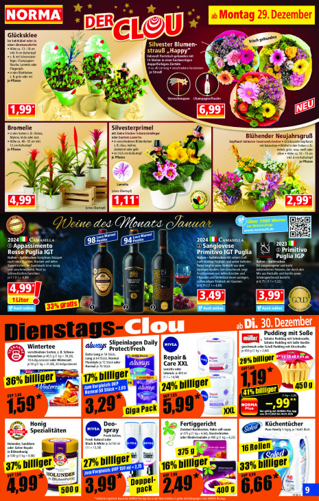 Bitte beachten Sie, dass dieser Text automatisch generiert wird und möglicherweise Fehler enthältNORMA mn DE Glücksklee U CLS, im Sektkübel oder in — frisch gebunde einer Ziermanschette ester Blumen- « Höhe ca. 13-18 an #4 es inkl.9-cm-Kulturtopf WZ uß „Happy ie 2. B. mit Schornstein- N liebevoll floristisch gebunden mit 5 : feger, Champagner- 14 Stielen in einer hochwertigen 7 al flasche, Lametta oder EEE PR TEN EREA Flegenpilz Si | + in den Blattfarben je StrauB LS 2. B.grün oder rot je Pflanze me, De Tab, 4 er a re N ma ER ETT Champagnerfiasche }. | en LEE à Bromelie Silvesterprimel Zn « in den Sorten z. B: Ostara, mit Deko-Stecker Schornsteinfeger Mylena, Voila oder Jazz oder buntem Lametta Blühender Net gruß « Höhe ca. 40-55 am inkl. * in verschiedenen Blütenfarben bepflanzt inklusive Feuerwerkste ückswürfel bepflanzt 12-cm-Kulturtopf 2.B.:blau, hellrot, mit fel in den Farben z. je Pflanze dunkelrot oder gelb | NN violett, grün, rosa, weiß oder silber « Höhe ca. 10-15 an « im 105-cm-Kulturtopf je Pflanze Mu inkl. 6-cm-Kulturtopf 5 WW je Pflanze 2 A \ j) me Fi; LAN D à 6 jetta Er (ohne Übertopf) arg, eq Ed 3 F 4,99} {ohne Übertopf) «1 LS RG [a] im Onlineshop Tr: 772 ea Monats Jam Ir . . a u Er LUZ BROS ACEA hes IE | © Appassimento or @ Primitivo Rosso Puglia IGT + Dn ES a Italien - halbtrocken Komplexes Bouquet le. x mf Ibtroch ge Mit seinem Duft Puglia IGP BEEN IEC nd seiner tiefroten Italien- halbtrocken Sauerkirschenlm Geschmack ist er rassig, ft aus dem Ein ausgewogener und leicht und umschmeichelnd. Passt zu 4 jeschmack zeigt bekömmlicher Rotwein, der durch den schmackhaften Gerichten u vo HOTTE) Mix aus Restsüße und Vanille sowie 6 di je 1 (1 1= 4,99) u ET se um isst einen samtigen, ER A UT À TS Eindruck am Gaumen. je075 (115,32) pn nr 1= 4,65) 4,99° SE | Nn hi 3,49 LS 3,99° fl # „a Fi Où CU AUE A Clou Pudding mit SoBe Schoko Pudding mit Schokosoße, Schoko Pudding mit Soße Vanille- Wintertee a Js Slipeinlagen Dail geschmack oder Grieß Pudding mit KirschsoBe A, Prötect/Fresh je 450 g (1 k 64) 6 verschiedene Sorten, z.B. Schnee- Extra Long je 54 Stück El träumchen 40,59 (1 k 39,26), | Repair & 18 Aufgu oder Winterzeit Long je 64 Stück, Normal er 0 gt kg 31 ), 20 Aufgus Flexistyle je 72 Stück oder Care XXL Normal je 76 Stück sensitiv oder intensiv je 400 ml (11=14,98) LI | en (1 kg= 2,20) NORMA QT Nur gültig mit NORMA Plus App ‘von 29.122025 bis 04.01.2026 pe el Deo- Küchentücher EE Honig En Fertiggericht Spezialitäten spray Zwiebel-Hackbraten, Huhn süß-sauer Pure Family 3-Jagig, je 16x45 Blatt Fresh Active, e je 375 g (1 kg= 6,64), Kasslerbraten Ve Fresh Natural oder oder Rinderroulade je 400 (1 kg = 6,23) Holunder, Sanddorn Black & White j 0 ml DO oder Gelee Royale (11= 13,30) Mrs) in Blütenhonig mn IL k Black 1 je 500 g (1 kg = 98) Es u f Gri er a LEER HOLUNDER 16 in Blütenho llen un #*Gültig für registrierte Nutzer der NORMA Plus App. Nurin der Filiale einlösbar. Es gelten die Bedingungen in der NORMA Plus App.