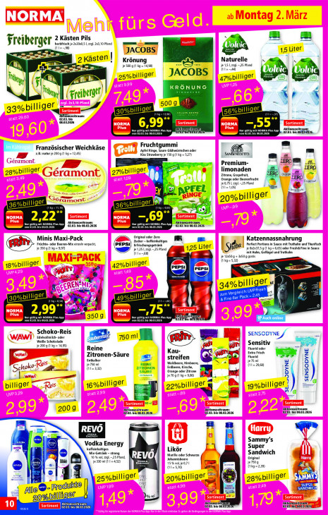 Bitte beachten Sie, dass dieser Text automatisch generiert wird und möglicherweise Fehler enthält2 Kästen Pils Freiben a | = herbfrisch je 2x20x0,5 I, zzgl. 2x3,10 Pfand 1=- JACOBS = 15 Liter ke Krönung Naturelle 2 Késten | je 500 g (1 kg = 14,98) je 1,5 ,zzgl. —…25 Pfand (tz, en 25%billiger JACOBS EN N (a 47billiger = (Fi all Im Freiberget Ár — $ 33%billiger = B a B 02.03. bis Tönszeitraum: eg ES 00g Le. = 08.03.2026 6,99" mm Bu hi Aktionszeitraumr: von 02.03. bis 08.03.2026 Nur gültig mit NORMA Plus App ET OL RUSS. 02.03. bis.081032026,, Französischer Weichkäse Fruchtgummi zB: natur je 2009 (1 kg =12,45) Apfel Ringe, Saure Glühwürmchen oder SANBENEDETTO GS, Kiss Strawberry je 150 g(1 kg = 5,27) Ne m Premium- 7‘ ZERO gescbiltiger gmabiliger limonaden Zitrone, Grapefruit, Orange je 0,75 I, zzgl. 25 Pfand Orange oder Beerenfrucht à (11=1,05) * Aline +. perel er 20%billiger a 10) 36% Il (1kg=4,60) ri Aktionszeitraum: 69“ von ET HIT Ya 02.03. bis 08.03.2026 voi Nur gül PERRET 02.03. bis 03.03.2026 Original oder Zero Minis Maxi-Pack Zucker - koffeinhaltiges ia Perfect Portions in Sauce mit Truthahn und Thunfisch Katzennassnahrung F je 350 g (1 kg = 9,97) Früchte- oder Beeren-Mix einzeln verpackt, PEPSI) erfrischungsgetränk je 8x2x37,5 g (1 kg = 6,65) oder Fresh& Fine in Sauce = je 1,25 I,zzgl.-,25 Pfand (1=-,68) g 125 Liter Sybe mit Huhn, Geflügel und Truthahn = je 12050 + 3x50g gratis. (1 kg= 5,32) 18% billiger Aen 42%billiger de NY] > =] AA 34% pilliger Ja NE ct zum Vergleich er A UT om 60) EHE fie FI 2,99 -,75” DT M3509 Nur gül LS Torre von AUT: RMA Plus App bis 08.0: 02.03. bis AUTO Schoko-Reis Edelvollmilch- oder SENSODYNE Le Weiße Schokolade =: or grütr Fr PO Sensitiv je 200 g (1 kg = 14,95) Fluorid oder sn = Reine Kau- gl Extra Frisch Zitronen-Säure streifen é = a Fluorid Entkalker 5 Waldbeere, Himbeere, = je 75 ml je 750 ml (11=3,32) REINE Erdbeere, Kirsche, (11= 29,60) 2 choke ARE Orange oder Zitrone ban enTenucer je 70 g (1 kg = 9,86) Bi. 3 = a billiger = 16%billiger |gxbiliger a zombie & LL Iso 1 Aktönszeitraum: 2009 Aktionszeitraum: (02.03. bis 08.03.2026 Aktionszeitraum: (02.03. bis 08.03.2026 (02103. bis 08.03.2026 u — # zn vern NIVEA Sammy's Vodka Energy Super Tan nld koffeinhaltiges Mix-Getränk - strong Likör Sandwich e 10 % vol, 2gl.-,25 Pfand, REVO Marille oder Schwarze Original ct je 330 ml (1 1=4,52) VoDKA Johannisbeere 15% vol, je 0,7 | je 750 g ) | a (11=5,70) (1kg=2,39) KS M 40 1 g 1) MY @ 25%billiger SE 20%billiger ee 28%billiger „Produkte KIT 7 E Ê = SANDWICH] SUPER %bi Ill er Do vi in Aktionszeitraum: Aktionszei Akuonszeitraumf CET) 02.03. bis 08.03.2026, 02103. bis 08. :02103N613/08037202618