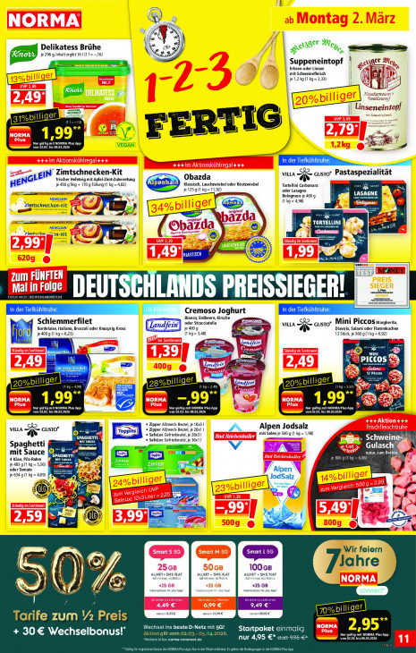 Bitte beachten Sie, dass dieser Text automatisch generiert wird und möglicherweise Fehler enthält© Delikatess Brühe je 296 g, Inhalt ergibt 16 1 (1 1= -,16) getger De, Ye, = SZ = rent pt Erbsen oder Linsen mit Schweinefleisch je 1,2 kg (1 kg= 2,33) Ee I lj ts 71 mil ORTE, Linseneintopf mt Schu ra a (up SN ul — Me el Ben) B. EEN Y. wan gf von 0203. bis 08.03.2026 Nur Pre NORMA Plus App [VEGAN] VEGAI me nn VILLA Se cusro’ Pastaspezialität EN Zimtschnecken-Kit frischer Hefeteig mit Apfel-Zimt-Zubereitung BI Obazda a A je 450 g Teig + 170 g Füllung (1 pen! h Lj Klassisch, Lauchzwiebel oder Röstzwiebel Tortellini Carbonara je1259 (1 kg=11,92) oder Lasagne he en vi Bolognese je 400 g LASAGNE | rien HENGLEIN (1 kg= 4,98) a2 Zimts mf a 1$ mr el al | a zen == ww À TORTELLINI HT HENGLEN u NEN oh Timterhn Sr on-Kit 5 8 u = | sen Ks A COEN = ) à CE man: MNEY id 1] | 2 pee nalın DEUTSG HLANDS PREISSIEGER! Foc: OEE NAA In der Tiefkühltruh In der Tiefkühltruhe: Cremoso Joghurt Schlemmerfilet oder Stracciatella Bianco, Erdbeere, Kirsche je 400 A = VILLA cusror Mini PiccOS margherta, Diavolo, Salami oder Flammkuchen Bordelaise, Italiano, Broccoli oder Knusprig Kross (1 kg= 3,48) je 400g (1 kg=6,23) 12 Stück, je 360 9 (1 kg = 6,92) um RZ nd fe: ji Pit Ä 2577) us ile pICCOS » een ge es à 12 Piccos Dr illiger ET fa Fan A (kg = 248) 2 lem 20%billige! akg Be PEN 99“ a 1,99" Nur gül NORMA Plus App ee A RRA / Nur gültig NORMA Plus App von 024 08.03.2026 ETES von 02.03. bis 08.032026 jpper Allzweck-Beutel, je 18x3 I VILLA GUSTO x jpper Allzweck-Beutel, je 28x1 | Alpen Jodsalz SPAGHETTI feLoc Gefrierbeutel je 28x3 | mit Selen je 500 g (1 kg = 1,98) + SafeLoc Gefrierbeutel, je 36x1 | Schwe Te Spaghetti Gut Gulasch. mit Sauce © à INKE natur, zum Brai 4 Käse, Pilz-Rahm SPAGHETTI MIT SAUCE El le PET ‚86) je 483 g (1 kg = 5,36) A ZIPPER oder Tomate = je 634 g (1 kg = 4,09) Alpen N \ 5) JodSalz au on. Graine & ren cort, RE m rs IS) = a Ä DIG | Nes” di Wir feiern 100cs Jahre w ALINET + SMS FLAT ALLNET + SMS FLAT AUNET » SMS HAT ‚Gt man. sort SG man, 50 MD ax, 102 A +25 GB 77 Oaterpolser für zes Tage Darenpolsier tu” 368 rage Datenpatster Fur 365 Tage” connect hd die ersten a x aWocten: CT danich 899€ 109€ danacn 1889 € Tarife zum 2 Preis Wechsel ins beste D-Netz mit 5. + 30 € Wechselbonus! Aktion gilt vom 02.03. 05.04.2026. Startpaket einmalig Nur gül 2.95” it NORMA Plas App jorma-connnect.de nur 4,95 €* statt 995€* LT ALLER) [m App Nur in dk bar n die Bedingun DRE A Pl App