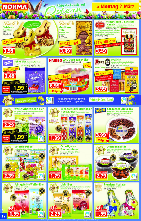 Bitte beachten Sie, dass dieser Text automatisch generiert wird und möglicherweise Fehler enthältnT \ EN Vorreude auf Ib: ty TA Ó > I | 7 À à À D dl NAN Sh “4 Mozart-Herz’l/-Schokis/ e weitere PA (A -Kugeln Herz' in Zartbitterschokolade, Goldhase 72/4 PAC) Jy Goldhase Lin 2) gefüllt mit Sahne-Trüffel &Pistazien G JASE jes0g(ikg=43,.63), Design Edition Ÿ Tafel UTTER Schokis in Zartbitterschokolade, gefüllt mit je 100 g æ = 3 Edelbitter oder Sahne-Trüffel & Pistazien oder Marzipan- Effi Her (1 kg =3990) N Vollmilch Û CE Kugeln in Zartbitterschokolade c— je1209 : je 100 g (1 kg = 34,90) ey 5 u À {1 kg = 29,08) Se œ 2 ge, So a 2 = 2 ‘1e re Ke y 1 à got ET ten aM Con A N 4 L A TOLDHAS 22 ) en ir O XXL-Dose Baiser Eier Pralinen Feine Eier aipenmilch, Marzipan, Sbach ‚Asbach zarte Fläschchen in Zartbitter Nougat-Creme, Karamellige Nougat Creme oder PRAUNEN oder Vollmilch, Edle Bohnen je 100 g mit Noisette je 90 g (1 kg =27,67) a 9,90) oder Verpoorten Eierlikör Pralinés je 120 g (1 kg = 33,25) ET ü ZARTE AN 1 © © 4 Am TOR Ne 12 Ba: EP 2 I 9 MI - | CIC 1,99" zeitraum: Nur gül fat 08.032026 UNE 510810312026; AB | —— = Alle schokolierten Artikel Fairtrade Cocoa Label QE NOR TC ge gts Cet WeiBe Schokoladen-Eier XXL Mandel/Nuss Box Lübecker Edel-Marzipan-/ mit Joghurt-Limetten- oder Joghurt-Heidelbeer- Nougat-Eier ciassic samaica rum, Mandel Box — Sesam, Klassisch, Kokos oder Geschmack je 150g (1 kg = 15,27) Orange oder Noisette Nougat Nuss Box - Mandeln, Erdnüsse, Cashews je 125 g (1 kg = 15,92) je 350 (1 kg =11,40) a qu? led 8 © ER cut @ de Schokolade! wei Acier F6 a RE Eier Pe Schokoladen-, an Ber [Se Le PA A) Eier A Ei ga gr Li) 8 Eg > en x fil XXL NUSS BOX DES OT A | U it A > LCR PR Nur gü UNE SDE: SDE von 02.03. bis 08.03.2026 Sl MAS | ro © Osterfigürchen Osterfiguren Osterspezialität Schoko-Glückskäfer, Häschen, Küken oder Ostereier Fondant/Gelee in der Dose - Jamaica Rum-,Kokos- oder je 125 g (1 kg 9,12) Hasen oder Dotter-Eier & Küken Marzipan Kakao-Eier ss un je 260 g (1 kg = 10,73) au je 225 g (1 kg = 7.96) Ö d Sn N Ö Se N Ai gn D Dé TN A® A és PER e Co En zE a = oe) re il 2 (D: D 7 Eu GO Da N al FAIRTRADE KP rasrraoe |) Likör Eier Premium Sitzhase Vollmilch oder Zartbitter Fein gefüllte Waffel-Eier Eierlikör, Weinbrand oder Kirschlikör in Zartbitter- Edelvollmilch oder Zartbitter schokolade je 150 g (1 kg= 15,27) Fast 4 je 250 g (1 kg = 7,96) sd Ë Fr je I ac. get bt QUE 5 Feingefune galder glued Likör-Eier À \ af ffel & a Like jer Kirschlikör Zerbiuer Eierlik © ei \ 2) ‘@ 3 x lj ä = [and Ro (Furrrane A T 12 v TEN iere Nutzer der NORMA Plus App. Nur in der Fille einlösbar Es gelten die Bedingungen in der NORMA Plus App.