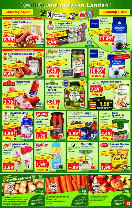 Bitte beachten Sie, dass dieser Text automatisch generiert wird und möglicherweise Fehler enthältQuallteit auiszumiseirenn Landen! te [tante | 1 Mecklenburg ( rpommern U Fark gu Se, Ganze ee Bohnen 10 Stück, Currywurst ohne arm Stangensalami : A, RONDO BATES) e je1kg Salami „Die Spitze”, Kräutersalami Pr ee (1 kg= 6,99) oder Pfeffersalami je 350 g (1 kg =11,40) RONDO ORIGINAL = NT = ee a He fneckentur: aram un En, = S jen Eh. Rouladen 2 Krautrouladen Pads Schinkenfleischknacker oder 100 Stück, XXL 2 Rinderrouladen je 7009 je 700 g 8 Stück, je 560 g #, & (1 kg =10,70) NL ER hal (kg 70) (1 kg =11,59) Vit | Eu ar RONDO al ORIGINAË 7 laden 190 2 Pozo Eek IC = ID Rouladen mit à viel Soße Sachsen = Thüringen CE ET Fleischwurst Hühner-Frikassee ER À je75091 kg=5,05) | könig je 400 g(1kg= 623) em ES Party-Gurken à Topf XXL zen) | hkönig Gewürzgurken mit frischem ar Dill und Zwiebeln 8 it je 970 9, Abtr-Gew. 530 g Pary-Gurken Yi L Hühner- einen Gene (1 kg= 4,70) fe Goroieh we bok. 33% pilliger TEE) À, 4 teck Vorpommern A mb. 1,99" > OEE EL Nur gül NORMA Plus App Vorpommern ‚Brandenburg MEL TE Sachsen-Anhalt VS Likör Wurst- 9 Thüringer Stifte sun) St. Hubertustropfen ewu 54 XXL nach art Kräuterlikör 30 % vol oder Pfefferminzlikör 18% vol, einer Thüringer je 24x0,02 | (1 1=12,48) Th üringer Spezialität Leberwurst, Rotwurst Knackwurst Currywurst oder Jagdwurst 8 Stück, je 400 g (1 kg = 12,48) je 300 g Sauce Zi = = (1 kg =8,30) je 500 g (1 kg = 3,58) Pf Eg ai eh” Ye Cerises 10 A % A Brandenburg Thüringen Schaumzucker- Meerrettich 3 Knusper Flocken figuren EEE oder Gemüsemeerrettich Sahne-, Tafel, Party- Eu 59 Zartbitter oder Klassik je 130 gl? kg = 15,31) Riesenmäuse, Minimäuse Senf je 100 g oder Heidelbeer- {1 kg = 9,90) ra mäuse je 140 g mittelscharf u (1 kg= 19,21) je 500 ml(11= 3,18) ruspen eit ar El 15) NEERRETTICH A 4 Er EE MN Qualtät und D 4 E 4 UN! D FRISCHE AUS NDEN [HO of pi SDL Se ws © KA | Ds. au me, eutschiand de] \ ww. herkun eut sc Peutschländ! 2kg wi herkunftk AS u 2 K u 4 z zum en Börde zum sische Âpfel zum Speisezwiebeln aus unseren Landen Mecklenburg-Vorpommern — Lübesse, Karotten dn rthener Obst e.G. Betrieb AGP Lübesse/Sachsen — Lo: Pt N 4, Bö legarten Gemüse Luc AL Kl. 1, ausgewählte Sorten, rc ılkenhain/Thüri KL. je 2 kg je2 Heichihim Betrieb Kaland Kl. 2 kg Ti efprels LC Tiefpreis EET CAE EEE ET CE Cr ITS