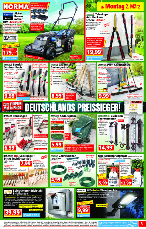 Bitte beachten Sie, dass dieser Text automatisch generiert wird und möglicherweise Fehler enthältInklusive UT 4x 20V/2.0 Ah Akku und Doppelladegerät* NORMA p Montag 2. März d Akku- powers: & Teleskol AT CT Rasen- Ast-/Hecken- Germany mäher Tp schere „Titan | 40V „brushless (*2 Akkus werden zum Betrieb benötigt) « Hochwertige Stahlklinge BC-MP380-X — SET 54 RATE mit Titanbeschichtung je Für Rasenflächen bis 500 me « Rutschfeste, ergo- e Komfortabler Elektro-Start für lange Akku- nomische Griffe = e Zentrale 6-fach Schnitthôhe: an) > je Ausführung hohe Effizienz MM verstellung 25-70 mm Eid Heckenschere wi 0 JAHRE GARANTIE ca. 68-84x23 an I 2 ie 5. Si Klingen mit Titanbe- 7 lbs schichtung für hohe Korrosionsbestän- E. Ol =. a | digkeit und lange 50 %billiger Lebensdauer — I UVP 359,99 b à LS 2 * , Lo = Bi nr we, “ zi Extra große Bypass- RATE ul 5 Liter Fangbox } Astschere HN Fe EU BR Bi zn = an 96x20 cm FE ee : Mit Durch- | Mit Säge- porn Gpezial- brüchen in rücken und 3 Japanis SE Pro Sp TR n Outdoor-Tools der Klinge | Widerhaken Gartengeräte aus à FSC an jertem Holz p ;C®.N001587) “ 3 Jahre Garantie je Ausführung Klingen oder Blatt aus hochfe: stem, 7 je Ausführung A | 3 Jahre Garantie handgeschmiedetem Stahl @ Gartenaxt «ca. 370mm ie je Ausführung À @ Pflasterbesen BS se ei + Kehrbreite ca-40 cm ie if En Gartenmachete © Gartenhacke RE Classic” e ca. 500mm @ 2in1 krallenfeger ss Be © Handsichel © Kehrbreite ca: 30 am A Mit eckiger Klinge oO io 6 © Spitzblatthacke © Hoch-Tief-Besen wi + ca. 500mm @ Breitblatthacke -_Æ + Kehrbreite ca. 40cm AN | pus Mit geschwungener / Klinge « ca. 560mm Mads @ Mit Widerhaken Me Se + ca. 500mm = ln Germany ere Griff aus FSC Pt} © Natur-Südharzer- Hand griff Besen mit Teleskopstiel it Widerhaken und Durch- Hol (FSC® 19,99" « Kehrbreite ca. 40cm brüchen in der Klinge LEE] Zum FÜNFTEN Mal in Folge vonken Pe DEUTSC $ PREISSIEGER! OCUS 44/25 | DEUTSCHLANDTEST.DE den Time KKBAFT Handsägen Bügelsäge 3in 1 CHE power & Abdeckplane. GIARDESSAI GuBeisen- « Einstellbarer Omament teilweise mit austauschbarem Sägeblatt Winkel 45°/90°/ mie sen nk. Befestigungskordel-jg, € Thermometer 3 Jahre Garantie Japarzugsäge 135°/180° « Mit Randverstärkung Wetterbeständig. ca. 30x9x5 am Handsägen- mit 2 Klingen © leichtes EL je Aus- „EEn «Mit Sägeblatt führung « Temperaturskala Set 2-tlg wechsel. Wechsel 5, in Fahrenheit EN ‘oder Celsius I barer, system = « Auch als 5 Kling Fensterrahmen- in L Ë Thermometer Für Gartenmöbel geeignet & Inkl. olzsägeblatt DATES N je Ausführung „pin und Metall EE geblatt ng Grün/ ‘ | mi Blau Feinsäge 350 mm 2 + Sägeblatt aus hoch- Vogel | Am, wertigem Karbonstah| Softtouch-Handgriff In 3 Größen erhältlich: Abdeckplane ca.3x4m (1m2=-50), 2er-Set Abdeckplanen N ee ca. 2x2m und ca.2x3m (1 lan oder 6x1,5m (1m: Eu) 19) Katze 7 Pflanzenclip- IKKBAFT MAL-Säbelsäge- RS ln Set 71-tlg. amal Drucksprühgeräte » sea zur pianzen- una Germany Stichsägeblätter-Set Fahre G are Garantie Blumenbewässerung sowie zum Pflanzenschutz Säbelsäge- je Ausführung 5 JAHRE GARANTIE 3 Jahre Garantie GDS15 1,5 Liter je Set blätter-Set 8-tlg + Universalschnitt Bindedraht auf Rolle 40m (Im=-12) u « Hochwertige GDS50 5 Liter Stichsägeblätter- LAI geeignet für Holz, Präzisionspump « leistungsstarke Set 45-tlg. Metall, Aluminium ÿ + Feine Zer- Druckpumpe F7 geeignet für Schnitte in und Kunststoff gie stäubung (max. 2,5 bar) 7 Holz, Metall, Aluminium und Kunststoff spanner- + Verstellbare « Sprühlanze Set 4-tlg. vl d Messingdüsel « Anpassbares ze Sprühbild ‚df fs 53% [ mr” fe 6 4 kx billiger 48 %billiger = pr UVP 1299 eco UVP 24,99 = x 5 Spanndraht uw Î Lp auf Rolle 40m 12,99 Ÿ (im=-,12) En —— == ——— Beleuchteter Edelstahl- LED-Solar- Wandieuch CET ETES Briefkasten Pf gehäuse IP65 Winkelverstellbare Wandhalte ne H « Mit Solarpanel ca. 13x4 cm zur LED-Beleuchtung des Haus ur] « Automatischer Dämmerungssensor « 3-5 m Erfassän nummernfeldes « Inkl iederaufladbarer Akku-Batterie « 120° Erfassungswinkel « Bis zu 6h Betriebszeit Ar NiMH 1200mAh « Hausnummernfeld aus Glas ca. 17 x9 cm «ca. 36x11cm a fs mit Aufklebern « Inkl. Montagematerial und 2 Schlüsseln 2 « Satinierte Oberfläche mit Schutzbeschichtung er + ca. 38x11,5x40cm 7%bill UVP 18,99 ih 500 Lumen 1/5 EN VE fe GroBes Zeitungstach im UL Kk A DER a" af * Keine Mitnahmegarantie! Sofem der Artikel in unserer Filiale nicht vorhanden ist, können Sie diesen direkt in der Filiale innerhalb von 2 Tagen ab Werbe- beginn bestellen und zwar ohne Kaufzwang oder Sie wenden sich bezi lich kurzfristiger Lieferbarkeit an www.norma-online.de/aktionsartike Es ist nicht au ‚geschlossen, dass Sie einzelne Artikel zu Beginn der Werbeaktion unerwartet und ausnahmsweise in einer Filiale nicht vorfindeı ir helfen Ihnen geme weit