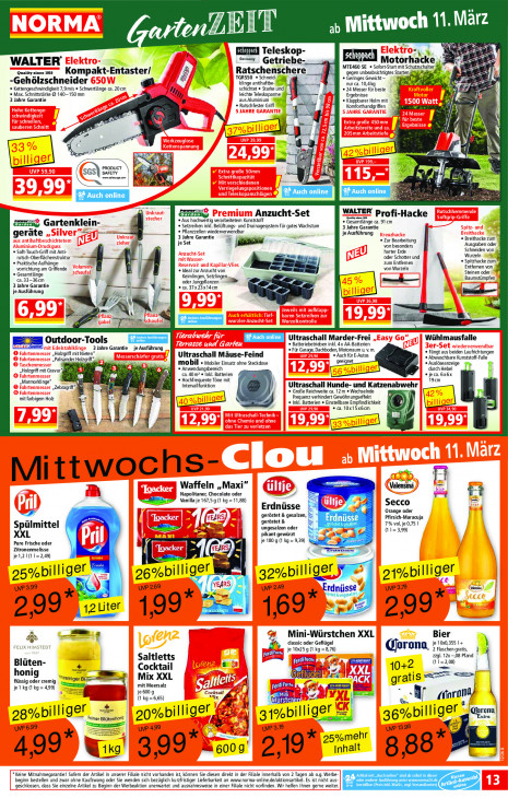 Bitte beachten Sie, dass dieser Text automatisch generiert wird und möglicherweise Fehler enthältttwoch 11. März M DIT YA 2 Ex Teleskop- WALTER | Germany ! Getriebe- ET Motor! hacke 2 MTE460 SE © Sofort-Start mit Schutzschalter mo Kompakt-Entaster/ 1 Ratschenschere ‚gegen unbeabsichtigtes Starten TGRS50 « Schneid- 8 « Geringes Gewicht — „Geh zschneider klinge antihaftbe- N nur ca. 10,4 A re 2 « Kettengeschwindigkeit 7,9m/s « Schwertlänge ca. 20cm schichtet e Starke und « 24 Messer für beste TS es + Max. Schnittstärke © 140-150 mm Um leichte Teleskoparme 1 Ergebnisse 3 Jahre Garantie aus Aluminium « Klappbarer Holm mit © Rutschfester Griff Komforthandgriffen M 4 el. „0 N re à sl ze té | : 5 PRODUCT dn x SGS) SAFETY wssn hd Cl LÉ AE Anzucht-Set WALTER Profi-Hacke + Aus hochwertig verarbeitetem Kunststoff Gartenklein- « Setzreihen inkl. Belüftungs- und Drainagesystem für gutes Wachstum 3 Jahre Garantie « Gesamtlänge ca. 91 cm = 2 « Pflanzzellen wiederverwendbar geräte 3 Jahre Garantie > je Ausführung + Breithacke zum je Set + Zur Bearbeitung "as = von besonders Ausgraben oder Schneiden von Soft-Touch-Griff mit Anti- harter Erde Wurzeln rutsch-Oberflächenstruktur —— ‚oder Schotter und « Praktische Aufhänge- zum Entfernen « Spitzhacke zum Entfernen von vorrichtung am Griffende Ideal zur Anzucht von von Wurzeln Steinen oder * Gesamtlänge Keimingen, Sezingen @.33-36cm oder Jungpflanzen [en Baumstümpfen 3 Jahre Garantie _# 4 @.37x233x14cm je Ausführung “ | y = 2 b LES L LT | Ultraschall Marder-Frei Wühlmausfalle Outdoor-Tools ea « Batteriebetrieben inkl.4x AA-Batterien 3 Jahre Garantie je Ausführung # Für Garage, Dachboden, Motorraum u. u m. „Hotzgrff mit Nieten” Ultraschall Mäuse-Feind Auch für E-Autos « Fängt aus beiden Laufrichtungen „Palsander ob geeignet + Abwaschbare Kunststoff-Falle mobil + Mobiler Einsatz one Steckdose « Auslöseanzeige f Holzgrff mit Gravur’ « Anwendungsbereich durch Hebel N ca. 40m? ® Inkl. Batterien je ca. 6x6x Marmorklinge’ = + Hochfrequente Töne mit 19cm Zebragnif B: Intervallfunktion Ultraschall Hunde- und Katzenabwehr + GroBe Reichweite ca. m e Wechselnde mit farbigem Holz Frequenz verhindert Gewöhnungseffekt a med 8 © inkl. Batterien « Einstellbare Empfindlichkeit 10x15x6cm = an Mittwochs- Î Val Waffeln , Maxi” ce Napolitaner, Chocolate oder fot Secco SEL nil je 167,5 kg= 11,88) Erdnüsse | hl 2 Tr Orange oder geröstet & gesalzen, >. Erdnüsse Pfirsich-Maracuja Ee geröstet & af Ei 7% vol, je 0,75 | Spülmittel == ungesalzen oder (1 1= 3,99) XXL LE À pikant gewürzt 4 je 180 g (1 kg = 9,39) nee Pure Frische oder EE Zitronenmelisse je1,21(11=2,49) Teiche ai, lige 25%billig 26%b! 32%billiger 21%billiger N we 399 uvP 269 \ 5 UVP 249 Arr up 32 *:- x etre er CARTES re 5 | 12 Liter 199 1,6 299* 299 N Mini-Würstchen XXL Bier dassic oder Geflügel je 10x0,355 | + FELIX HIMSTEDT B je 10125 g (1 kg = 8,76) Corona, 2 Flaschen gratis, Saltletts Celen zagl. 12x -,08 Pfand Blüten- (11=2,08) 0] must Cocktail A {XI 10+2 — honig Mix XXL Gell flüssig oder cremig 'emiger Bi. ak ACK Br je 1 kg (1 kg = 4,99) mit Meersalz | ps Br je 600 'ocktai Bf 8 fi ee 2 (1 kg=6,65) ix 4 IE Nr (faro I fj aen hl ronal ger A xtra | 28%bil li Feiner Blütenhen 20%billiger 31%bill iger 36%billiger 3, à as UVP 699 uw 499 fi we 39 up 1398 mi eer * 25% mehr 1908 w 3,99": ma GOO 2,19 Inhalt 688 * Keine Mitnahmegarantie! Sofem der Artikel in unserer Filiale nicht vorhanden ist, können Sie diesen direkt in der Filiale innerhalb von 2 Tagen ab 0.9. Werbe- En RN beginn bestellen und zwar ohne Kaufzwang oder Sie wenden sich bezüglich kurzfristiger Lieferbarkeit an www.norma-online.de/aktionsartikel. Es ist nicht aus- En geschlossen, dass Sie einzelne Artikel zu Beginn der Werbeaktion unerwartet und ausnahmsweise in einer Filiale nicht vorfinden. Wir helfen Ihnen gere weiter. iS