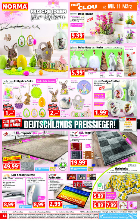 Bitte beachten Sie, dass dieser Text automatisch generiert wird und möglicherweise Fehler enthält"à e Jm” — L N DE „» Mi. 11.März K LOU \ æ N bella casa Deko-Blume im Weidenkorb Gesamthöhe ca. 33cm = 2% IE ub + Korb ca. 18x10x9cm 5 D I ni à je Ausführung pe je Natur- DEA Ke A CET u le rn Dail %, ri (Modelbeispile) - % A 2 6 ie FT Ü N A 9,99 f u ÿ ie FI a PTS or EN RE bella casa Deko-Hase oder ‚Huhn Aus Polyresin Je Ausführung Kantenhocker- Hase In Ei lt Fedem 3) 18] Huhn ca. 38cm jm 4 fi a \ el k. #4 …e hi wi a, L « N’ an A Le À Rte + Ex + — Fu (C2 ù ter Ed re Hase mit Hase mit Hase mit = Feder cm Kranz Jungem u hs Jungem Braun, ca.20cm Weiß, ca. 22cm ca.22cm GroBe Deko-Auswahl [/ Dekoteller _ bella casa Frühjahrs-Deko @ ca. 25cm 5 la casa Design-Stoffei Mangoholz- &} Filz-Deckchen ıs Kunststoff und Polyester à % Ee Hase 7 i 9 a.25cm ae 9 £ je Ausführung Holz Hase ca.10cm Hase Hase @.13cm | ca.11an auf Sockel ee } À Nt N 4 er u Ei er le & #8 Ki 2er-Set 5 cm oder = QE À L Gr 2cm N Eier Ber-Set j I Ei mit pen je ca.4cm Punkten “ D ca. Tom m: Im: Filz-Tasche Gede 1€ cm rs 8 7 Artikel Bal” Henne kl ca.9cm 1,— 3er-Set Hänge-Ei pn € Ne Holz-Schriftzug jea.sm cm sie Em 1) KEREN Zum FÜNFTEN Mal in Folge 2 te GITE U an DEUTSCHLANDS PREISSI | y» ren = 1 XL -Tep, on en 2 Lifetge® ZSL-Teppi cl za > ultiracıt je 100% Polyproy nn Qualität aus leicht reflektierendem G; läufer „Aspen” ca. 67x300cm = x 2300 + Hoher Gehkomfort « 100 % Polyamid KC je Ausführung yo pe ij ve À A Ki = u is TEE ze _ Eeen ze Zar an Zn —_ NN | > = = RS IKE A on A Schwarz Ë “ei ER %billig er XL Sensor-LED-Lichtleiste farbe Warmweiß Leuchtenkopf + 100% Polyamid Te a5 © In Silber oder Weiß drehbar « 100 Lumen © Rückseite mit Anti- a. 27x2em rutsch-Beschichtung + Lichtfarbe KaltweiB Für den Innen- und) ! À “ + 180 Lumen hützten Aufen- N son reich geeignet 4 & \ s ) À” je Austin CES einfach mit ee En abwischen feuchtem a € = Modellbeispiek) ER a CE 2,99") ? En an CE il 16,99°|7,99° zu ze 1126 0 Alle Preise in Euro Auch in anderer Ausstattung erhäktlich Bei Druckfehlern keine Haftung NORMA Lebensmittelfilialbetrieb Stiftung & Co. KG, Manfred-Roth-Straße 7, 90766 Fürth Keine Mitnahmegarantie! Sofern der Artikel in unserer Filiale nicht vorhanden ist, nen Sie diesen direkt in der Ailiale innerhalb von 2 Tagen ab 0.g. Werbe- ‚Auch online“ sind ab sofort in di ‚wahl, beginn bestellen und zwar ohne Kaufzwang oder Sie wenden sich bezüglich kurzfristiger Lieferbarkeit an www. rma-online. /aktionsartikel. Es ist nicht aus EEn bestelle PU PT TE a ten) KE geschlossen, dass Sie einzelne Artikel zu Beginn der Werbeaktion unerwartet und ausnahmsweise in einer Flle nicht vorfi ir helfen Ihnen geme weiter