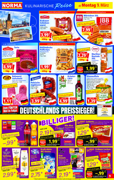 Bitte beachten Sie, dass dieser Text automatisch generiert wird und möglicherweise Fehler enthältKULINARISCHE Zeise or: Würstchen XXL be il 36 Stück, je 1,5 kg (1 kg= 5.33) Krakauer LA Schinken- N u Mail". wurst Gr bee Ss ea 5 Stück, je 450g a ed T. É (kg =887) ee sE E TA WÜRSTCHEN bi am us a er 2 LS In der Tiefkühltruhe: Torte Holländische | Lm Poffertjes dé Honigtorte Home Style Mini Pfannkuchen d Medovik” oder Blätter- ca. 50 Stück, vous Marillen teigtorte „Napoleon! Rue je 415 g x je 1 kg (1 kg = 8,99) EST CURE (1 kg=4,80) ER Roulade Et ® | Ne GE XXL MEDOVIK masse | 1e fruchtig &fein Es je 5209 m (1 kg=440) 8% 2 2%billiger | pe € À Ne nn AL 3 a LEE où von 09. MES NORMA Plus App 5.03.2026 > Rohwurst bé Kräuter- Käsewaffeln N Original oder mediterran gewürzt Aufschnitt Likör Jab Mit feiner Käsenote und mediterranen Salami oder Schinkensalami 8 30% vol, Kräutem passen die knusprigen je80g (1 kg =13,88) Polnische Le je 0,71 Waffel-Taler ideal zu Antipasti LC FLAMINGER (11=713) Käseplatte oder pur zu Jagdwurst | einem Glas Wein 4 Stück, je 360 9 oder Bier. je 100 g (1 kg= 11,08) gee (1 kg =13,90) Res 2 Tuan 5 ag & KASE 2 WAFFEL PS Aktions- LA zeitraum: 09.03. bis 15.03.2026 pp MNEY zum FÜNF [2 d za ER RUE DEUTSCHLANDS PREISSIEGER! Foc: El EL teilweise fe koffeinhaltiges IMS NA Saltletts sesam, voinorn je 175 gt kg= 7,37 Erfrischungs oder Gassic je 2509 (1 kg au getränk Mix Max 8125 1.2291. LF 5 Pfand statt 2,49 m) kleine Rührkuchen je 1035 g statt 2 19 74 Tr 01=-79 [J 26) (ai EL Pb / Sticks; if li ES I FIT akg E79 ff tt 1,59 | 1,99" LS szeitre Nur gül NORMA Plus App MENT NORMA Plus App eit: bisis'o von 09.03. bis 15.03.2026 von 09.03. bis 15.03.2026 Ca 1. Kraft-Aktiv Erdnuss Locken WC-Steine Lee Classic je 175 g (1 kg = 7,37) PANTENE KE Er PES Spülun Lemon oder Kau- PUR p; ze ENE Ozeanfrische DOUTE ú 1= 14,95) oder T RON Pr mit Ente oder Huhn a kg= 27,50) KP ART 1 Donut GröBe L oder statt 2. 19 Shampoo 2 Donuts Größe 5, je 300 ml (1 1= 9,97) mt je 100 g (1 kg = 21,90) ALT Z aù grotop = ‚Aktionszeitrau 09:03; (15103120; kg statt 3,95 statt 3,25 > statt 2,79 LE —99"" AktiOMBreit: Akti iu ‚Aktioı Iren CEE 09.03! 09. 09.03! Bi von 09.03. bis 15.03.2026 Gl für registrierte Nutzer der NORMA Plus App Nur in der Fale einösbar Es gelten die Bedingungen in der NORMA Plus App.