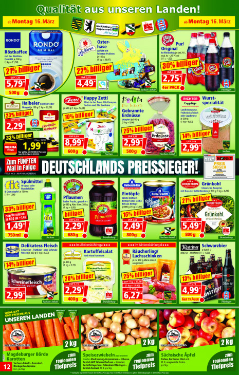 Bitte beachten Sie, dass dieser Text automatisch generiert wird und möglicherweise Fehler enthältaus unseren Landen! Qual SS à =! N Van RONDO Oster- U} RONDO Pur/ rat hase ON Röstkaffee ORIGINAL gefüllt mit pe G m. en koffeinhaltig je 4x0,75 | mit der Röstfein- feinsten Pralinen zagl. 4-25 Pfand Qualität je 500 g je145g Ü (1kg=11,58) ( kg = 30,97) a ik 0! 7) 912 A de LS 5 TT Anhalt Thüringen Happy Zetti Wurst- Minis in der Dose: 28x Knusper- Po4kta er Halbeier cicriikôr oder = flocken und 27x bambina Ooghe spezialität ougat je 100 g (1 kg = 22,90) je 600 g (1 kg= 14,98) Le Gebrannte Landleberwurst, Frühstücksfleisch 2 Erdnüsse oder Jagdwurst og mer a je 300 g aak ba ed LJ En dragiert je 500 g ( kg= 9,97) 2, En ep (1 kg=5,98) Fe AF” pede es en At] @: Er 33% 1 isse ig ER E ECN 1,99” Nur güiti JORMA PlusApp PS7 Sachsen von 16.03. bis 22.032026 DE Sachsen-Anhalt | aus: MNEY zum FÜNFTEN | Folge per ro EE HLANDTEST.DE AIN Raman CE, Spülmittel u ter 2 Grünkohl Mandelblüte Original oder klassische Rezeptur, & Granatapfel je 750 ml mit Kasseler & Mettenden je 800 g (1 kg = 686) (11= 1,99) Er Eintôpfe arm ) ud Pflaumen Weiße Bohnen halbe Frucht, gezuckert Eintopf oder Gelbe je 680 g, Abtr-Gew 385 g Erbsen-Eintopf I IX Pr; (kg =5,95) je 800 g (1 kg = 3,11) Lel) u Ss Grünkohl mt Kazen Menander del nd ns Is Brandenburg Sachsen-Anhalt Brandenburg PE Delikatess Fleisch Schwarzbier )) Schweine-, Truthahn- oder Schmalz- je 5051 Ed fleisch je 300 g (1 kg = 9,97) Kartoffelsalat Räucherling/ z2gl.6x Pfand (1 1,66) JU) nach Hausfrauenart Lachsschinken je ca. 350 g, Ware einzeln je 400 ausgepreist (kg =5,73) Kartoffolsalat FL 2.2 S Deli tess (EE pie) tie SCI na triger S U 3 a (ul A 3 Brande ES Thüringen CE Cl UND F RISCHE AUS {PLAN d 5 [NO un u en ERN (TS CE SS eh ve 1 Dan ww "za je) un herkun deutsch landde) 2Ky ain EIT Nah u er Börde zum Speisezwiebeln aus unseren LIL) Sächsische Äpfel zum A Karotten Landen Mecklenl Vorpommern - Lübesse, Dohna, Borthener Obst e.G. ‚Sachsen-Anhalt - Arensdorf, regionalen ‚Betrieb AGP Lübesse/Sachsen - Lossatal, regionalen Kl. Il, ausgewählte Sorten, regionalen Bördegarten Gemüse Kartoffellagerhaus Falkenhain/Thüringen je2 Kllije2kg Tiefpreis Betrieb Karland Kl. Il, je 2 kg Tiefpreis Tiefpreis Er 71 IT p. Nur in der File ein geten die Being, em TS