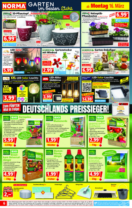 Bitte beachten Sie, dass dieser Text automatisch generiert wird und möglicherweise Fehler enthältGARTEN NORMA res 16. März pr @ 3D-Pflanzto, es ng SL DE EES Holzo; Su meet Kuno it dekorativen 2D-Hect AAN « Inkl. weißem Innentopf je Ausführung Toller Pflanzkasten : 4641701400 EE VA DORE 3D-Effekt Aus Kunststoff in Holzoptik « UV-stabilisiert für N en die Verwendung im Außenbereich NEU: u Füllvolumen ca. 9 Liter = Mii je Ausführung x Ze Es CET er ME es “ca Liter/ Sand (fe Ri ca. 29x14an ee % a Grau Braun-Gold. Me) Le je ca. 2,5 Liter/ 7 BL ie Ojeca.17x16cm 7 N SE pe. En iR 5 ÿ. 3 er \ L Grau 5 na Pa 2 heel Rot As < à as = 1" Br N VE © ca.5 Liter/ ‚Anthrazit N Dunkelbraun (Nicht alle Größen in allen farben erhältich) © ca. 22x20cm LED-Solar: Gi ARDESSAW Gartenstecker N GIARDESSA% Garten- -Dekofigur ı-aLow Heil luftballe on mit Windrad ae käfer aus hochwertiger Terrakotta u Ganslı Eule © ca. 10x38 m Frosch + UV-beständig für die fa, de witterungsbeständiger De Verwendung im Eich- 5 Ente 12 Flammen- js Kunststoff, mit ca. 45 cm ‚Außenbereich hömchen “| Effekt-LEDs Metallstecker e ca. 16 bis 22 an Es + Dämmerungssensot je Stecker je Ausführung + 1PAA spritzwasser- * 6 À RE geschützt 2in1-Wind (Modelbeispiele) Ze 3 Jahre Garantie Zi rad Jackelfi ber, Ma En nn gur einem 7 % je Ausführung Rot Bunt w N N Marien- ee käfer Libelle Blau ES (Modell eee Katze mit rötem Schnecke esp) Frosch Schmetterling ne XXL-LED-Solar-Leuchte LED-Akku- Mit praktischem |J LED-Solar-Leuchte al Lichtfarbe WarmweiB und Farbwechsel einstellbar APA Aufhängehaken 120° Erfassungswinkel, Reich veite 6-8Meter Glühbirne Produktvideo « Bewegungssensor e IPA4 spritzwassergeschützt « Höhe ca. 45cm « 2 Aufbauhöhen möglich, ca. 35 cm wiederaufladbar, 100 Lumen COTE CEE TR EUR ONE 3 Funktionen einstellbar: ‚Automatisierte Sensor- 100 %/50 %/25% « Inl UsB- ICE #5, dreht sich selbst: abel + Lichtfarbe Warmweiß Tagsüber Solarpanel zum Ei , LE pn ‚Aufladen, nachts Beleuchtung ee “Cracked je Ausführung Glaskugel I Farbwechsel | [DE 9 ca. 12cm 6) oder uvre ger if Warmweiß 20 % billi einstellbar rs u Lo ‚Auch erhältlich: Classic ec 10 LED-Magnet-Licht EE Kl ws TELE Mal in Folge zr Es LANDTESTDE UND LANDS PREISSIEGER ERST En Tease © natürlich La fe pu kraftvoll - in der Wirkung gleichmäßig und lang anhaltend für RD 9 eine kräftige und gesunde Pflanzen- + 100% torffreie Blumenerde aus 7 entwicklung nachwachsenden Rohstoffen R, « organischer NP-Dünger 14 - 0,5 unter m! © für alle Haus-, Garten- und Balkonpflanzen * Tomaten- und Gemüsedünger, Verwendung von tierischen Neben- « lockere Struktur für gute Durchlüftung 1 NPK 5-3-8 Ya produkten (Kat. 3 gemäB VO(EG) - Nr. 1069/2009 100 % und optimales Wurzelwachstum RN + Beerendünger, NPK 6-5-6,5, Hom und Hufe vom Rind) 5 je 16 (1 1= 12) wi « Kräuter- und Hochbeetdünger, 7 €} NPK 5-3,5-7,6 je 2.5 kg (1 kg = 240) = A jet kg li 2,99) fl | rf nn) ft 15,997 | Bee ne 11,997 } M ten em naer % hi I 2,5kg @ 16Liter @ En Ee = aj En FI à N Im KEN Di « Flüssigdünger für alle hd « organisch-mineralischer Dünger Pflanzen in Haus und Garten 7 Vi + organisch-mineralische ausreichend für 150 m2 « feiner Krümeldünger 5 En + Eisensalz 11. EG-Nummer: + Zusammensetzung: organisch- &) Er NPK-Düngerlösung 8-5-8 mineralischer NPK Dünger 5-2,5-6 mit Spurennährstoffen 231-753-5 11,5% Fe ausreichend für 60 m? Ra wa ? je1 11 1=1,99) wasserlösliches Eisen CUS ms Ho * je 3 kg (1 k ,66) ES | je 3kg (1 kg = 1,66) BIO Pd sigaar D a mal 1 ze ee ae un AE ET ET Me 14,997 | | eu pa 11,997 | ee, en, 14,997 | 3k we 3k 1Liter Feuchtwischbezug 2er Kleiderbügel Kehrgamitur Baueimer 12 Liter € Zimmerbesen Gewebereparatur- band 25m (Ancikell (lm=08) peel an “| u Keine Mitnahmegarantiel Sofern der Artikel in unserer Filiale nicht vor inden ist, können Sie diesen direkt in der Aliale innerhalb von 2 Tagen ab a.g. Werbe beginn bestellen und zwar ohne Kaufzwang oder Sie wenden sich bezi lich kurzfristiger Lieferbarkeit an www.norma-online.de/aktionsartikel. Es ist nicht aus- ‚geschlossen, dass Sie einzelne Artikel zu Beginn der Werbeaktion unerwartet und ausnahmsweise in einer Filiale nicht vorfinden. Wir helfen Ihnen gerne weite:
