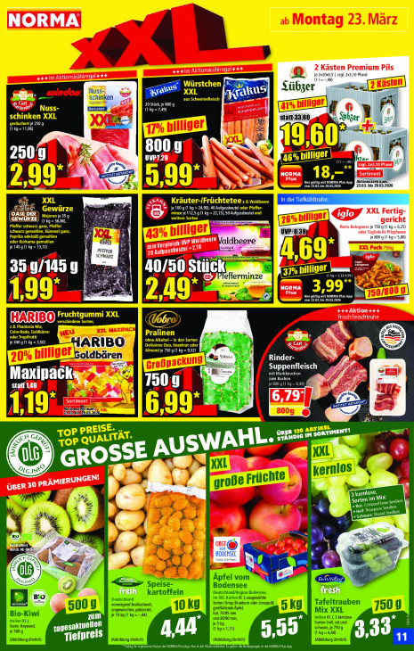 Bitte beachten Sie, dass dieser Text automatisch generiert wird und möglicherweise Fehler enthältNORMA > < d T 4 2 Kästen Premium Pils CII Aktionskühlregal+ ++ je 2x2 1.223,10 Pfand +++ Im Aktionskühlregal+ ++ Er (ls 00, qua Sübgzer mu, u mj A — CT ha 20 Stück, je 800 g A {1 kg = 7,49) MES y statt:33/60 u üb, ser EVE 2 ff ENT uw x > bec Ee GAN 8009”. 6 Alt pe u uup78 Zon rf # DE) ET 0 Pfand ie NORMA Bu Plus Nur gültig mit NORMA Plus App RSS raum: RK Da | von 23.03.bis 29.03.2026 2. ‚03.2026 wf Rade fx N Ka es je 100 g {1 kg = 24,90), 40 Aufgussbeutel OASE D = je35g (Sa je 112,5 g (1 kg = 22,13), 50 Aufgussbeutel XXL Fertig- GEWÜRZE (1 kg = 56,86) EI gericht Pasta Bolognese je 750 9 (1 k 25) j UWP!6!39) oder Tagliatelle P ne je 800 g (1 kg= 5,86) je 145 g (1 kg = 13,72) DE zumVergl eich:UV p Waldbeere aldbeere PFEFFER =11 fonts & SCHWARZ 20 Aufgus: sbeutel a iglo FES Ki EEE hi 40/50 Stg Prefferm 359/145 9 ag nze = NORMA Plus À PTT RUN À ‘von 23.03. bis 29.03.20 " = +++Aktion +++ HARIBO Frischfleischtruhe ws en ES je 340 g (1 kg = 3,50) ENTS EX —HARIBO KEN Er je 750 g (1 kg = 9,32) 18 @5 Rinder- Een # fe fe) Pi m mit Markknochen Suppenfleisch Maxin 5 zum Kochen LE" na je800,g (1 kg= 8,29) statf 149 RS 1909 Pr = Li DEN Sortiment |" | N Er rl ER _8009 ® Br cr Ge, 5 ee LE 2 SSE AUSWAHL: 7 GRO Ks 4 eb LE Luck > # .“ CE LL MIERUNGEN' à 7 1% Tann Am # ETC) ‚Flame Seedless mm ra. AAA ES L Eu AUS Be edt 53 [2 | 5 cz CCI. CO | oBsT @ 7 d ACH © 4 Ei dx di, Zer co ei a fresh fresh EREN zum 1226 0. tagesa ktuellen ug HE 3,39 ul fpreis *"Gulug für registrierte Nutzer der NORMA Plus App. Nur in der Flialeeinlosbar Es gelten die Bedingungen in der NORMA Plus App.