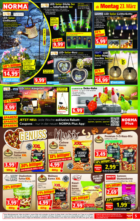 Bitte beachten Sie, dass dieser Text automatisch generiert wird und möglicherweise Fehler enthältLED- a it C3 A N ORMA EN oder Solarfackeln Gesamtlänge je ca. = QUEUE LE 34cm, © ca. 20mm FA Bus aufladbarer Akku-Batterie und Erdspieß \— 7 3 Jahre Garantie Er Q je Ausführung [| KDE -Lichterkett LO WIN Y TE SET ZT LE + 20 warmweiBe ned em LEDs + Gesamt- GieBkanne länge ca. 4,85m Ÿ Le à [2 = « Zuleitungs- À 4 länge ca. 2m 3 Jahre Garantie CEE 4 LEE 2 IRA si U QE ETS Ï zu 8 Stunden Ei rh a NRR br “rag B ; à ieBkanne: if ben Cr 4 ds UvP 8,99 Tropfen PAC 3 Jahre Garantie pr sos TD en T2 , 7 La 44 en 5,997 F4 N Bra Warmweiß, L 2 ze à )s DA! le Bon pe 1 nel = SEE el Là ichtfarbe Herz Warmweiß « Leuchtdauer bis zu LED. -Hän = 2 FR 8 Stunden + Ein-/Ausschalter « Dämmerungssensor « Spritzwasser- Garantie RERO ja N 2 leuchte DOTE IQ DETENTE À hi à 4 1 + je ca. 14x36 cm Ge EL je 2er-Set = — de # el Fr UVP 29,99 in Si N WEL QI 4. ij dj I 1 = _ is UVP 19,99 | u CR EPS N -Hängetiers GIARDESSAv Deko-Huhn Lo wi aus Metall « ca. 20cm Echte Handarbeit Rosi NEEN ENNE © Für innen und aufen Leuchtdauer bis zu 8 Stunden) ® Rostfrei und wetterfest 3 Jahre Garantie LTR 1 je Ausführung Mi © nm Gundi » UVP 18,99 = E ca. 23cm | | ca. 21m d > 2 Eichhörnchen ca.24cm = = I Jede Woche exklusive Rabatt- Jetzt herunterladen und Orc] NORMA Plus Coupons - nur in der neuen NORMA Plus App! Lu en ri 55) Premium 3-/5-Nuss-Mix NU WR je 2009 (1 kg =17,45) N GE Le & Cashew g Im ® “ a IN Kerne 22 ) 47 NI us Saut & en) Nase naturbelassen je 400 9 | ÉStändig im Sortiment JEUN] SA + (kg = 12,48) [SU Studenten STUDENTEN MERE & Ma en Futter XXL PR) R | KERNE A a I DS geröstet je 500 g (1 kg = 7,98) =2,89 ETR 2) m u Te LICE lins hi | PE E En = E (1kg=14,95) Is ” el EE 5 es hon 3,99) | 5 2009-2 NEE SCH, ER DT: NORMA zum Vergleie 4 Plus Nur gültigmit NORMA Plus App y 1 von 23.03. bis 29.032026 MARY Studenten- Walnuss & SR JETZT ri Sonnen- kei Ta blumenkerne SE Es Ÿ futterXXL Kerne XXL | Sl ch: Klassik je 450 g (1 kg = 8,87) & cor [N geröstet und gesalzen je 250 (1 kg = 10,76) naturbelassen Hasel- je4259 L nuss- 6 (1 kg= 11,74) kerne = fein gemahlen gl A N: "SUDENTEN he à a 4,95) LE 2 zum vergleich: © KERNE A a 5 A) Ps AE UVP 4,99 il à 2009 = EN re F eu! 1 2 Er, = ei statt 3,49 (4 = 199° = ol ins 2 Sorti Eus 3,99] I 5 NORMA Plus QE” iof Nur gültigmit NORMA Plus App _4509 @ _4259 @ ‚23.03. von 23.03. bis 29.03.20 13126 0 *Keine Mitnahmegaran 1 Sofem der tikel in unserer Filiale nicht ve vanden ist, können Sie diesen direkt in der Fi le innerhalb von 2 Tagen ab 0. jerbe DETTE STE beginn bestellen und ar ohne Kaufzwang oder Sie wenden sich bezüglich kurzfristiger Lieferbarkeit an wwwn.norma-onl de/aktionsartikel. Es ist nicht aus IT Per ef DEREN geschlossen, dass Sie einzelne Artikel zu Beginn der Werbeaktion unerwartet und ausnahmsweise in einer Filiale nicht vorfinden. Wir helfen Ihnen geme weiter. in der NORMA Plus App.