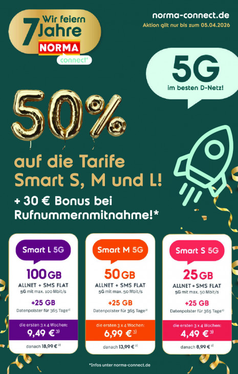 Bitte beachten Sie, dass dieser Text automatisch generiert wird und möglicherweise Fehler enthältnorma-connect.de NORMA 96 im besten D-Netz! u "u | 5 + 30 € Bonus bei ‘y, Rufnummernmitnahme!* a‘ Smart L 5G | ED | En 100c8 5068 2568 ALLNET + SMS FLAT ALLNET + SMS FLAT ALLNET + SMS FLAT 5G mit max. 100 Mbit/s 5G mit max. 50 Mbit/s 5G mit max. 50 Mbit/s +25 GB +25 GB +25 GB Datenpolster für 365 Tage? Datenpolster für 365 Tage? Datenpolster für 365 Tage”? die ersten 3x 4 Wochen: die ersten 3x 4 Wochen: die ersten 3x 4 Wochen: Na p 4 ARS 6,99 €° 4,49 €° danach 8,99 D ue À æ | nd + *Infos unter norma-connect.de % {