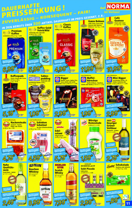 Bitte beachten Sie, dass dieser Text automatisch generiert wird und möglicherweise Fehler enthältNORMA Cafe Gustoso Ganze Bohnen Caff& Crema, Crema Gold, + Classic oder Crema 4 », Classic L Espresso oder Espresso je 1 kg (1 kg = 10,99) 4 Kaffee Intenso je 1 kg (1 kg = 11,99) = . Kaffee Gold/ kräftig je 500 g (1 kg = 9,98) SDE Premium X. Fein& Mild Nort, R vollmundig oder naturmild ‘ Kaffee as + aromatisch je 500 g (1 kg = 13,98) Je 500 g{1 kg CE re CAFFI N ed OA [39 RÖSTA ESPR INTENSO gl CR A co OSO | ej LASSIG Eu PREMIUM ee Ge Er @ LINE EST. LK 8 | Ses [7 fl # & Î arke wad 9 9 hatt billiger 9 9 haft billiger 9 haft billiger dälerhaft billiger 9 seit 09.03.2026 haft billiger seit: u 2026 seit: Du: 2026 seit: u 2026 1199 Ben: 2026 Im Kühlregal: Sahne- In der Tiefkühltruhe: In der Tiefkühltruhe: In der Tiefkühltruhe: Classic, Strong oder Crema Kaffeepads Waffel- d {40 Pads, je 280 g pudding Bigger Mini Bigger (1 kg= 18,54) Schokolade oder ® Mandel, Classic, Joghurt Him- 4 hörnchen Et SE Schoko Collection oder verschiedene Sorten, z.B. mit Bourbon-Vanille je 400 g 3 beere, dunkle oder weiße “ Vanille-Erdbeere, -Haselnuss, (1 kg=2,73) Schokolade 6 Stück, je 600 ml (1 1=4,98) -Schoko oder Vanille je 720 ml (1 1= 2,76) Mandel 12 Stück, je 600 ml (1 14,98) pe rn ES Ps (D: La A CAFFECIAO LA crc > re Lan. ®: es ne ë SCT Cet co onse, HNE (ITS D CS IC EN BIGGER/ 6%) CTET cn a Landfein en SAHNE D n PUDDING 8 ul © pl ER di haft billiger dauefhaft billiger haft billiger 9 haft billiger haft billiger SR seit 0803-2026 109 seit: er 02-2026 29 seit, 2802. 2026 9 seit 2602 2026 20e) seit 2602 2026 == In der Frischfleischtruhe: In der Frischfleischtruhe: tm Würzige 2025 m =“=_ Nackensteaks “=_ Schinken 0 Kl Remoulade mariniert — Paprika, Schnitzel S 7, je 500 mi (1 1= 3,18) Heuriger Pfeffer oder Kräuter aus dem Schweineschinken windau Grüner je 600 g (1 kg = 7.98) fi Veltliner je 500 g (1 kg = 9,18) Österreich — trocken Edel- e= je1l(11=2,79) an) salami (D DR u luftgetrocknet IE EN es en je 650 g il =891) ss re & Wenn = — i > > C7 IN > fat (ES Dane“ Es en Naf Am hatt billiger 9 hatt billiger © - ge ann 10212026 haft billige AT seit # ‚02.2026. 45 seit = .02.2026. 5 A 15 > DR Nahe HIGHLAND SCHLOSS Schokolade OLD FELLOW” HOHENLAUF Haselnuss oder Vollmilch Qualitäts- Sekt Piccolo Eels je 1009 (1 kg = 8,90) wein Bourbon Aug gar Scotch Deutschland - lieblich Whiskey halbtrocken je 11(11= 2,49) 40% vol je 0,7 | Whisky je 3200 mi (11-498) (11= 12,84) 40% vol je 0,7 | TE “ SR) N 1=11,41) ant, H. USS. a SE HE ES, set Tahe en SCHLOSS HOHENLAUF LDFELLON Sekt „ „KENTUCKY men WHISKEY ted Earl ie | Fo À rurrrae A dakrnarejbinigen, dau haft] ne daudthaft biliger 89 dauerhafbihiger 249 sei 00 SS Sera 7% Sera D) seit) Be ‚022026, sen 29019026