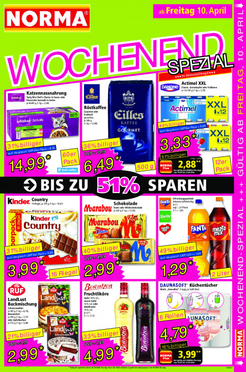 Bitte beachten Sie, dass dieser Text automatisch generiert wird und möglicherweise Fehler enthältPEA Actimel XXL Classic, Granatapfel oder Erdbeere TD je 12x100 g (1 kg = 2,78) Katzennassnahrung NL Tasty Mix Chef's Choice in Sauce oder Klassische Auswahl in Gelee CT ti je 60x85 g (1 kg = 2,94) x = Röstkaffee ctimel Kraftvoll Gourmet oder x1 gemahlen, | 11118 Ki je 500 g Tee ms ui {1 kg = 12,98) KAFFEE 12 eo Le] B GOURMET zum Vergl eich:UVP8er Pack =3 Je 86 =] OLA XXL bd2 75 3188 LA La zum Ver gleich: UVP UV 1019) %D CET) Nur gütig mit NORMA Plus App ATX 1459 SS DE CETTE OBIS ZU 596 SPAREN Count Erfrischungsgetränk 16 Riegel, je 376 g (1 kg = 10,61) Schokolade jez teihweise koffeinhaltig. MR Daim oder Milchschokolade zzgl.— 25 Pfand = je 220 g (1 kg = 13,59) (1=-,65) AN k os L\ A Mare J < Un Dai 1 FAND m? A il ll — 1 A 329 2 NGC Kie n:UvP ger LES u] 1251=159 DEA am MAC US BO en 299 129 DAUNASOFT: Küchentücher Motiv „Smoothie“ 3-agig, je 6x90 Blatt L Fruchtliköre Apfel 18% vol., S et) we LandLust saurer Apfel U ú Backmischung Waldfrucht 16% vol. oder KN Mi Schwarzwälder 16% vol. 2 je 365 g (1 kg = 8,19), Bienenstich je 071 KÜCHENTÜCHER je 395 g (1 kg = 7,57) (11=713) { oder Apfelkuchen a UNASOFT je 510 g (1 ko = 5,86) ms KL ó N N A) & MR ol > Den billiger 3,99" DOE) UN 4,99 von 10.04. bis 12.04.2026 Nur gültig mit NORMA Plus App **Gültig für registrierte Nutzer der NORMA Plus App. Nuri der Fale einläsbar.Es gelten die Bedingungen in der NORMA Plus App. 15260