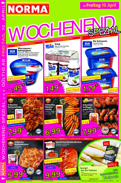 Bitte beachten Sie, dass dieser Text automatisch generiert wird und möglicherweise Fehler enthältDie Extrazarte Drink aus Butter &Rapsöl je 400 9 (1 kg = 4,48) Milk, Chocolate & Hazelnuts Mascarpone-/ je 4x95 mi (1 1= 3,92) EN ze Rahmjoghurt GB nern Weihenstephan Mascarpone - Erdbeere, Pfirsich-Aprikose, Ge Mango, Sauerkirsche oder Rahmjoghurt — Stracciatella, Kirsche, Pfirsich Maracuja je 1509 (1 kg =3,27) ie > EE RE EEL Weihenstephan aa Mascarpone Eee LU TT axe ; DRINK | Baul Keek al teld na carpo G er} phan mr QU MAN) Ei um iR UVRE Je Parts 219 (AO) 1 Te a F4 Là 5 La dB docs ER or, Schweine- EAU T-W Hähnchen Nackensteaks Rücken- : Geflügel- natur 8 Stück, rme paket XXL # AK EE steaks rt, pri pere Ober-, Unterkeulen (ko 8-10 St # ren und Flügel, A & {1 kg =6,99) gewürzt ë [2% = 4 I. Jl Nen or a Le AAC EAU 00 Pe 2 NS De EB fi nr urnes L ne 199 04, rhältlich 699 EL 6 erhältlich TO rhältl AUS Spanferkel-Krustenbraten Nackenbraten MARNE TES ER A Ed KOT Ware ei ausgepreist Pr 5 7 «| Lacs | SPA A bil CT RGEL* LE KE Ÿ > DV k te ws 2.B.8339 Spargel = aus der Toskana & 4 Ee Italien D KL. 1 weiß/vilett, feine Sortierung ellen (al. 16 mm +), je 600 g Et Où Di où 1kg=6,49 07.04 Ki d I TER] 07 ic (Abbildung. ähnlich) Alle Preise in Euro, ‚Auch in anderer Ausstattung erhäklich Bei Druckfehlem keine Haftung NORMA Lebensmittelfiialbetrieb Stiftung & Co.KG Manfred-Roth-Straße 7,90766 Fürth x Miefpne.s 15260
