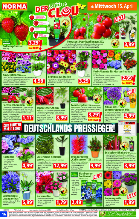 Bitte beachten Sie, dass dieser Text automatisch generiert wird und möglicherweise Fehler enthältenüune, x" FE A ER rn (8 Ne — — er 7 ohame, 5 A À 1 jk 7 LON A 4 I = re dw dd v D 4 4 +: £ Me, Tomaten-/Paprikapflanzen XXL v + in den Sorten z.B.: Strauchtomate, Datteltomate, Snacktomate gelb, À ': Snacktomate rot, Bullhornpaprika rot oder Bullhornpaprika gelb dbeerpflanzen « Höhe ca. 30-50 cm je nach Sorte inkl. 1,5-I-Kulturtopf je Pflanze je 6er Tray Y— LE Á rs u R Je ER Pen + ne Ee Li È zi Verbenen E- Zinnien PLZ Geranien [1 Tee a Petunien FF D fe 2 4, a 5 Im patiens NE Leberbalsam ed > a 1) le Sanvitalia Lobelia sd Farb-Akzente für Gartenfreunde F der f (ohne im Ger Tray Ampelpflanzen siinena in den Sorten z.B.: Celosia plumosa Federbusch, « mit ca. 20-30 cm langen Ranken « in verschiedenen Farben Blühmix aus Italien met Übertopf) Coleus Buntnessel, Zinnien, Ageratum + in den Sorten z.B.: Bidens, Minipetunie, Fuchsien + in den Sorten z.B; Felicia, Mesembryanthemum, houstonianum Leberbalsam, Tagetes hängend, Geranien hängend, Hängepetunien, Osteospermum, Dianthus oder Gazanie Studentenblume oder Impatiens walleriana Verbenen, Sanvitalia, Scaevola oder Lobelia © Höhe ca. 15-30 cm inkl. 14-cm-Kulturtopf in verschiedenen Farben « im weißen 25-cm-Ampeltopf je Pflanze je Pflanze « Höhe «@. 15 cm inkl. Tray je Ger Tray ne EN Al PET re a à A NL W- tr x: 5 LE EME JE a Er 4 Geranien D Se IG Y ? Eis Co Ks 2 er er 2 En ae. nt % STE ji un) ir (A ve k + ii * } COS Fuchsien ® & we RODEN] 2: 5 4 È er en ë E Fuchsien/Geranien Tomatenpflanzen cu: sie eigene Allium XXL J | stehende und hängende Geranien + in den Sorten z.B.: Japanischer Ahorn Ernte im Garten » je Tray: 3x runde Tomaten „Money- Geranien stehend , Pelargonium zonale” (rot, rosa, lila maker”, 1x Cherrystrauchtomate — Cocktail-Tomaten Sommerstauden Mix ‘oder apricot), Geranien hängend „Pelargonium peltatum” winterhart + auch für Balkon und Terasse geeignet „Gartenfreunde”, 1x Fleisch- (rot, lilafrosa oder rotweiB) oder Fuchsien „Fuchsia- « Fächerahorn „Acer palmatum”, „Acer palmatum tomate „Montfavet”, im Potcover « in den Sorten z.B. Allium, Rudbeckia, Emerald Lace”, „Acer palmatum Atropurpureum” Lupine, Campanula, Alcea oder Hybriden” (rot, rot-wei® oder oder Schlitzahorn „Acer 1x Eiertomate „Roma” Phlox « blütenstarker Garten- blau-weiß) « buschige Pflanzen « gut abgehärtete Pflanzen « Höhe ca. 20-25 cm je nach palmatum Garnet” « Höhe bis « benötigen einen sonnigen gigant « Höhe 20-30 cm ca. 70 cm inkl. 3-I-Kulturtopf Standort « Höhe ca. 20-25 cm inkl. 17-cm-Kulturtopf Sorte inkl. 10,5/11-cm-Kulturtopf je Pflanze je Pflanze aan: je Pflanze inkl. Tray je Ger Tray M°@NEY um ill (FI zadel LL EU ur Dig zer DEUTSCHLANDS PREISSIEGER! FOCUS 44125 | DEUTSCHLANDTESTDE Pr En neren hen sûr x Eine Raff 1 en eN REC 4% ps FO N +; he À = 2 = d' BR a 4 E Rx En k #12 Le à = EB BJ 6 Exklusiver Rhabarber winterhart + in den Sorten z.! rambozen Root tstielig mit Hortensie Chilenische Schmuck- 3 grünem Fruchtfleisch, hohe Erträge, hervorragende Koch- Zylinderputzer und Verwertungseigenschaften; Holsteiner Blut: die « 3-5 Blüten/Dolden tanne „araucaria araucana”, winterhart „Callistemon” XL der giicktang für « in den Farben blau, beste rotfleischige Sorte mit aromatischem Geschat rosa oder rot « immergrüner Baum mit Balkon, Terrasse und Garten Himbeer Rhabarber: rotstielig exotischem Erscheinungsbild + mediterraner Blütenstrauch mit gelbrotem Fruchtfleisch, « Höhe ca. 30-40 cm inkl. « Höhe ca. 20-25 cm über « rotblühend ® Höhe ca. besonders ertragreiche Sorte 13-an-Kulturtopf je Pflanze dem 2-I-Kulturtopf 45-55 cm inkl. 19-cm- « Höhe . 30-40 cm inkl. je Pflanze Kulturtopf je Pflanze 2--Kulturtopf je Pflanze = Mu LAN LS Blaubeeren- Je + RU GARDEN Ky, Sortiment Se Der ke ve N Bi in Faltschachtel ri = "+ 4 « in den Sorten SZ es ei wir Zn 4 28: Spartan, ; Duke, Chandler oder Lateblue « Höhe 4 Fa AR TN ER ” AT : Zi \% ca. 25-38 cm er A) IN Fa VE inkl. 9-am- LE + a: ER “ E Kulturtopf je Pflanze kak ah Schmucklilie Kaisernelke , id „Agapanthus” « in verschiedenen Farben z.B.: (ohne Übertopf) a Kapmargarite rot, rosa, zweifarbig oder la in verschiedenen Farben winterhart Höhe ca. 35-40 cm « Höhe ca. 15-20 cm inkl. inkl. 12-cm-Kulturtopf « Höhe . 18-28 cm inkl. je Pflanze 12-cm-Kulturtopf 12-cm-Kulturtopf je Pflanze je Pflanze 16/26 WIO Alle Preise in Euro Auch in anderer Ausstattung erhältlich Bei Druckfehlem keine Haftung NORMA Lebensmittelfilialbetrieb Stiftung & Co. KG, Manfred-Roth-StraBe 7, 90766 Fürth * Keine Mitnahmegarantiel Sofern der Artikel in unserer Filiale nicht vorhanden ist, können Sie diesen direkt in der Filiale innerhalb von 2 Tagen ab 0.9. Werbe- beginn bestellen und zwar ohne Kaufzwang oder Sie wenden sich bezüglich kurzfristiger Lieferbarkeit an wwn.norma-online.de/aktionsartikel. Es ist nicht aus- NES: ATEN MOTEUR ENT Tau En geschlossen, dass Sie einzelne Artikel zu Beginn der Werbeaktion unerwartet und ausnahmsweise in einer Filiale nicht vorfinden. Wir helfen Ihnen gerne weiter.