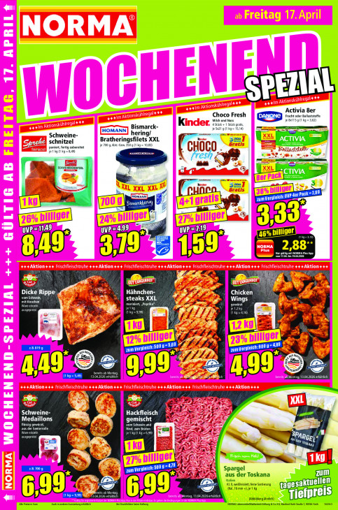 Bitte beachten Sie, dass dieser Text automatisch generiert wird und möglicherweise Fehler enthältActivia 8er Choco Fresh Frucht oder Ballaststoffe Milch und Nuss je 8x115 g (1 kg = 3,62) Bismarck- 4 Stück + 1 Stück gratis, je 521 g (1 kg= 15,14) = Schweine- HOMANN] pering/ eraenares zp Sam ACTIVIA ii A 4 schnitzel je 700 g, Abtr-Gew. 350 g (1 kg = 10,83) Bratheringsfilets XXL paniert, fertig zubereitet je 1 kg (1 kg = 8,49) em CHOCO AS . Kr Ne ar ITZEL zm CTIVIA = erraunases Fam En HOMANN ML 2,69 MTL ; ri gratis 5, en ál Ë RC Tre) ks (Te Fur ER ak à 2,88" D I von 17.04. bis 19.042026 DET JORMA Plus App 1° TE ad dE % u = 5 “hr Dicke Rippe Hähnchen- ? Ch en DEC steaks XXL CITANT UT LE ein LEE BR ZT gewürzt on preist je 1 kg er PAPAS) eu (1 kg = 9,99) (ik 1) rpm pr we 3! = 273 hels y zal Td g= 5,59 74 ELL TTT NIELS NN =: & AT Ld dns we à > = AR. Si ) 9 el = > 4 (1kg = 5,49) its ab Montag, 13.04. ältlich An Lt 13.04.2026 erhältlich ES Schweine- Hackfleisch 7 E > Medaillons gemischt E 4} flüssig gewürzt, ‚vom Schwein und aus der Semerrolle Rind, zum Braten > 5 5 US ln je 1 kg (1 kg = 6,99) ES ausg FI { N + es 4 ale ri iR LEA Ik en ai ; ji FE Frisch vom Feld Vergleich: 500 =4,19 rl) AN 24) £ Spargel ; ; aus der Toskana zum, PR D Italien her UT me ne | KI. I, weiBlviolett, feine Sortierung IE ktuellen ww (Kal.16mm +),je1 kg (1kg 9,99) te ntag, 3.04 20: ältlich tontag, 13.04.2026 erhältlich Tie fpreis All Preise in Euro ‚Auch in anderer Ausstattung erhäkich Bei Druckfehlem keine Haftung, NORMA Lebensmittelfilbetie Stiftung & Co.KG Ma (bling) à id sie 16 Fürth 16260
