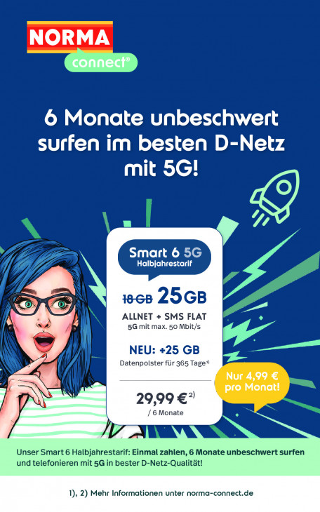 Bitte beachten Sie, dass dieser Text automatisch generiert wird und möglicherweise Fehler enthältNORMA connect® 6 Monate unbeschwert surfen im besten D-Netz mit 5G! / NI 7 @ N 68 25GB II ALLNET + SMS FLAT 5G mit max. 50 Mbit/s AE N) NEU: +25 GB y Datenpolster für 365 Tage” f Nur 4,99 € pro Monat! AN 29,99 €” / 6 Monate Unser Smart 6 Halbjahrestarif: Einmal zahlen, 6 Monate unbeschwert surfen und telefonieren mit 5G in bester D-Netz-Qualität! 1), 2) Mehr Informationen unter norma-connect.de