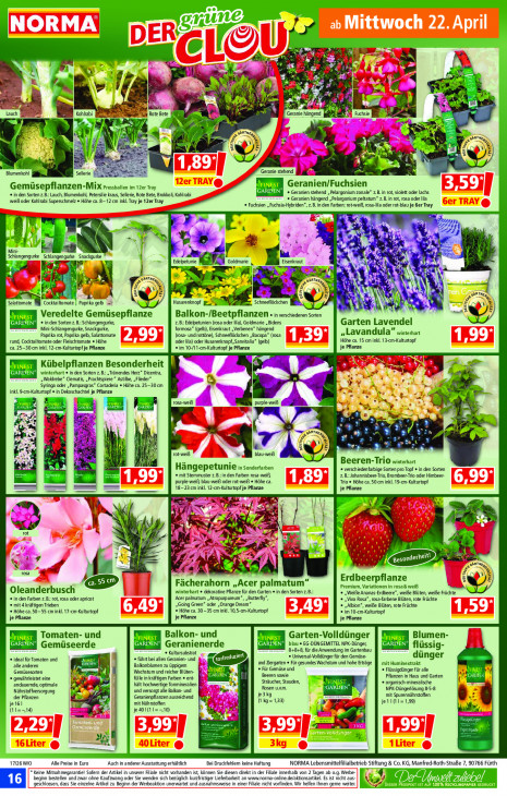 Bitte beachten Sie, dass dieser Text automatisch generiert wird und möglicherweise Fehler enthältNORMA nr a Ex le ee 3 % u ÿ ee: 3 je: + N a \ ex 4} Fe ++ Fe Les ja u te ES wo WA te en Lauch 34 Rote Bete Wi Geranie hängend 1 € Kohlrabi ENE Fuchsie x U. mp7: 9 chr 2 a à & ea EM na à jk 0 à À Pr a “gs à & LA EL SEE Blumenkohl selerie RES + Geranie stehend IR FINE: Geranien/Fuchsien Gemüsepflanzen-Mix pressbailen im 12er Tray REN + Geranien stehend , Pelargonium zonale” z.B. in rot, violett oder lachs in den Sorten. uch, Blumenkohl, Petersilie kraus, Sellerie, Rote Bete, Brokkoli, Kohlrabi weiß oder Kohlrabi Superschmelz « Höhe ca. 8-12 cm inkl. Tray je 12er Tray = e Geranien hängend „Pelargonium peltatum” z.B. in rot, rosa oder ia « Fuchsien „Fuchsia-Hybriden”, z.B.in den Farben: rot:weiß, rosa-Iila oder rot-blau je Ger Tray u of, sy, 5x u 2 ET LE N vs 3 9 RN 4 E re nn ee Hanse GE act Eisenkraut EN k Edepetunie BEE ve Sr ÿ 2 Re u Ne ARTE, À Rat Le Á Ve % À )', AN « E i E gl k bare, Salattomate Cocktailtomate | Paprika gelb = = Husarenknopf gd Schneeflôckchen g je hed \\ N 2 u ‘| D): M Veredelte Gemüsepflanze Balkon-/Beetpflanzen « vesciederensorten EN « in den Sorten z.B.:Schlangengurke, 2.B: Edelpetunien (rosa oder il), Goldmarie „Bidens Garten Lavendel Mini-Schlangengurke, Snackgurke, formosa” (gelb), Eisenkraut „Verbenen” hängend „Lavandula” winterhart Paprika rot, Paprika gelb, Salattomate (tosa- undrottöne), Schneeflöckchen „Bacopa” (rosa rund, Cocktailtomate oder Fleischtomate « Höhe oder la) oder Husarenknopf,Sanvitalia” (gelb) Höhe ca. 15 cm inkl. 13-cm-Kulturtopf ca. 25-30 cm inkl. 12-cm-Kulturtopf je Pflanze + im 10-A 1-cm-Kulturtopf je Pflanze je Pflanze ni L FINE: Kübelpflanzen Besonderheit ] & EN Ae LN winterhart » in den Sorten z. à Tränendes Herz” Dicentra, AEEA _„Waldrebe” Clematis, „Prachtspiere ” Astilbe, „Flieder” Syringa oder „Pampasgras” Cortaderia « Höhe ca. 25-30 cm a py inkl, S-cm-Kulturtopf e in Dekoschachtel je Pflanze ie ie KT ms rosa-weiß wi u Kie N 1 (is, Er = B $) > ARTE, EN cf Be A IN 0 2 Jul, EN : a A a N 3 a): F * rot-weiB blau-weiß ES Bearenrio winterhart mA 6 Hängepetunie ir sondertarben « verschiedenfarbige Sorten pro Topf « in den Sorten mit Stemmuster z.B.:in den Farben rosa-weiß, 2.B.:Johannisbeer-Trio, Brombeer-Trio oder Himbeer- Purple-weiß, blau-weiß oder rot-weiß « Höhe ca. Trio « Höhe ca. 50 cm inkl. 19-cm-Kulturtopf 18-23 cm inkl. 12-cm-Kulturtopf je Pflanze je Pflanze RTS Y de I INT Ab > dS À NN a x rot - Ÿ: 4 & FAN u | Ka I Y Or | En $ le eo d A Wer EE, 4 AT eg rosa, “ =, à À en 3 & Fächerahorn „Acer palmatum” Premium, Variationen in rosa& weiß Oleanderbusch winterhart « dekorative Pflanze für den Garten + in den Sorten z.B. „Weiße Ananas-Erdbeere”, weiße Blüten, weiße Früchte Acer palmatum , Atropurpureum", ,Butterfly", « in den Farben z.B: rot, rosa oder apricot © „Viva Rosa”, rosa-farbene Blüten, rote Früchte mit 4 kräftigen Trieben „Going Green” oder „Orange Dream” « „Albion”, weiße Blüten, rote Früchte © Höhe ca. 50-55 cm inkl. 17-cm-Kulturtopf © Höhe ca. 30-35 cm inkl. 10,5-cm-Kulturtopf « im 10-cm-Kulturtopf je Pflanze je Pflanze je Pflanze Tomaten- und Balkon- und Blumen- NES we Garten-Volldünger IN ARDEN Gemüseerde + LA M Geranienerde RDEN blau « EG-DÜNGEMITTEL NPK-Dünger, en 8+8-+8, für die Anwendung im Gartenbau GARDEN flüssig- © Kultursubstrat. « ideal für Tomaten und * führt bei allen Geranien- und « Universal Volldünger für den Gemüse- dünger alle anderen Balkonblumen zu üppigem und Ziergarten « Für gesundes Wachstum und hohe Erträge mit Huminextrakt Gemüsesorten Va mn | Wachstum und reicher Blüten- « Für Gemüse und * Flüssigdünger für alle ENA Beeren sowie Pflanzen in Haus und Garten GAN N « gewährleistet eine füle inkräftigen Farben « ent- | Sträucher, Stauden, ELNEST « organisch-mineralische andauernde, optimale hält hochwertige Tonmineralien a Rosen u.ym. f Rate as Nährstoffversorgung (ZA und versorgt alle Balkon- und NPK-Düngerlösung 8-5-8 der Pflanzen Geranienpflanzen ausreichend me mit Spurennährstoffen ET mit Nährstoffen. Karin je 1(11= 1,99) je16l Pr (1=-14) je 40 1(1 10) a = rn ul de LIU Is ren en MS 17126 WIO Alle Preise in Euro Auch in anderer Ausstattung erhältlich Bei Druckfehlem keine Haftung NORMA Lebensmittelfilialbetrieb Stiftung & Co. KG, Manfred-Roth-StraBe 7, 90766 Fürth * Keine Mitnahmegarantiel Sofern der Artikel in unserer Filiale nicht vorhanden ist, können Sie diesen direkt in der Filiale innerhalb von 2 Tagen ab o.g. Werbe- beginn bestellen und zwar ohne Kaufzwang oder Sie wenden sich bezüglich kurzfristiger Lieferbarkeit an www.norma-online.de/aktionsartikel. Es ist nicht aus- (mwelt zuliebe! Ea geschlossen, dass Sie einzelne Artikel zu Beginn der Werbeaktion unerwartet und ausnahmsweise in einer Filiale nicht vorfinden. Wir helfen Ihnen geme weiter. EE EN end