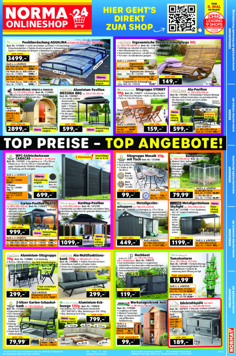 Bitte beachten Sie, dass dieser Text automatisch generiert wird und möglicherweise Fehler enthältZUM 5. MAL 47 IN FOLGE! h's NORMA ee LEADING ® SHOPS ONLINESHOP % 1 ZUM SHOP, [il M: . Tes Poolüberdachung AQUALINA geeignet für Pools bis ca. 600x300 Ergonomische DOp pp Ischwungliege XXL Best. 1213635 « Leicht verschiebbar auf Rollen « UV-beständige «a. 150x120x66/95cm Best.-Nr: 198790 = Polycarbonatplatten » Stabiles Aluminiumgestell « Schienenfreies, * Gefertigt aus robustem Akazier lartholz (FsC&zertifizier) Fer TIERNAHRUNG System « Schneelast: bis SOkg/m? « Wetterfest & langlebig | Hohe Belastbarkeit bis ca. 260kg UVP: 5499,- Vormontierter Lattenrost schnelle & einfache Jontag « Für Innen- & Außenbereich geeignet = = > EEE 3499, - Auch u. a. erhältlich: Auch u. a, erhältlic vomische za Für Pools bis ca. 600x400cm Best.-Nr: 1213636 399,- a En Best.-Nr: 1198788 "15 Für Pools bis ca. 600x300cm > El www.norma24.de/tierwelt/tie: Best.-Nr: 1179663 2 326m Best.-Nr: 1122394 Ergonomische Schwung- en 5999,-* liege 79,99* CRE Für Pools bis ca. BE Ischwungliege XXL , = UVP: 229,- Best.-Nr. 1179667 Best-Ni naar 149,-* Für Pools bis ca. en em, En Ratenzahlung Ergonomische Schwungliege er Best.-Nr: 1179673 8999,-* EIS) ähnlich) mög lich Best. 1199730 79,99* u Saunahaus DömMITz A FINNISCH Aluminium Pavillon nd Sitzgruppe SYDNEY Alu-Pa on ca. 219x295x229cm Best.-Nr. 134402 5tlg. Best.-Nr.: 1182411 * Hochwertiges Akazien- ca. 295 x 295x265cm « Für bis zu 4 Personen + 3 Saunabänke MESSINA BBQ c:.292x179x262cm holz e Platz für 4 Personen « Stuhl: ca. 48x59x90cm Best-Nr: 1101456 + UV-beständig e Einfache Montage Beus nordischer Fichte e gow Ofen Best.-Nr.: 1202587 EE + Massive, rostfreie Konstruktion aus pulverbeschichte- + 12cm starke, rostfreie den «Tisch: 118x70x74,5cm tem Aluminum « Dach aus 6mm starken Le AJAHRE GARANTI ‚Aluminiumkon- (Ähnliche, ze struktion in edler Doppelste _ Zu Abbildung) Blaser fu Optik « 150 kg/m? platte Auch Schneelast für en erhältlich: hohe Lebensdaueı Se CI Braun ca. 295 cm Dömitz A Bio * RE iz « Für den ganz- lt JA % Raten- B Inklusive Best-Ni jährigen Outdoor. VA $ N a Vorhänge 113440 = bedarf konzipiert, 7 zahlung REISEN 2999,-* = + LU | möglich 3 UV 99, ld Auch u. a. erhältlich: UVP: 299,- UVP: 69 _ lens UVP: 5703,86 De Auch erhältlich: Ratenzahlung Ratenzahlung Gartenstuhl SYDNEY EX 2er-Set 69,99* ca. 295 x 395 x 265 cm möglich ED möglich Best-Nr: 1182410 Best-Nr: 1101467 699, www.norma-reisen.de TOP PREISE - OP ANGEBOTE! En vi WPC-Sichtschutzzaun 5 Elemente, Gesamtlänge Sitzgruppe Mosail 3tlg. Komposterss ss re CARACAS 5x Element + 6x Pfosten von ca.9,1m ca. 100x100x80 cm Best. 117350 Best. 1213781 + Zaunplatte je ca. 170x180cm/ "age mit Tisch Best.Nr: 1213046 Material: Stahl, hei verzin ze « Stühle zusammenklappbal e Volumen: ca. 800 liten 2 Pfosten je ca.10x10x 185cm « Unempfindlich Tisch © 60x70. m afde f gegen Insektenfraß, Pilzbefall, Witterungseinflüsse, «2 Stühle je 36x A ie Widerstands; a Be UV-Strahlung und Feuchtigkeit 36x90cm fähig gegenl FE Korrosion un Auch u. a. erhältlic Orient Witterungs. n Klarna. Best.-N En kj BE einflüsse, à | a 1 Pfosten Vas 1213040 4 ES Best-Nr: 1204966 Ratenzahlung RS 39,99* möglich Schwarz Stern JT Rx 3 Pfosten est.-Nr. se Best.Nr: LÀ = Be 1204965 m=59 1203006. 1213043 Auch u. a. erhältlich: "1 UVP:1299,- | ‚Auch erhältlich: UVP: 149,- I ed ANGEBOT ca. 80x80x70cm 1 Schrägelement Best.-Nr.:1173501 59,99* Best-Nr: 1204976 Horal 129,-* ca. 80x80x80cm 9-* à KXLES GT & Best.-Nr: 1202212 L79,99"| Best.-Nr.:1173502 69,99* Hardtop-Pavillon 4 Garten-Pavilloi Ah got Metallgeräte- EEE Metallgerätehaus | kan. ca. 300x365x292 cm Best.-Nr: 1196972 ® ca. 310x364x290cm Best.-Nr. 1212705 schuppen ca. 198x275x224 cm Skylight ca. 245x290x226cm Raten- « Doppeltes Dach für — ‚Anthrazit « Kombination aus edlem Zedemholz und stabilem Stahl Best.-Nr.: 1202959 + Schwingtü 175x132cm Best.-Nr. 214786 + 7m? Gerätehaus zahlung optimalen Luftstrom ER ie Verzinktes Hardtop-Dach für optimalen Wetterschutz '® Material aus feuerverzinktem möglich und Komfort Massive 2 = mit 7m? Carport-Erweiterung «Ink > Holzpfoster s = Stahl » Robuste © inklusive netzen un Metallwändel Regen- —— I | LI] rinnen Vorl De mit 4x su. La Wasser- UV 1999, = I abflüsseı IM de und Fall ol Ha | Ed Ratenzahlung rohren möglich Kia. zu Auch u. a. erhältlic UVP: 2799, 99, UVP: 3999,- Alu Lounge LIROY Atlg. Best. 153865 399 Raten- ‚Auch erhältlich: Auch u. a. erhältli ca. 300x420x290cm Best. 196980 1299,-* zahlung ca. 198x228x224 cm ca. 245x204x 226 cm möglich ca.360x480x290cm Best-Ni 196987 1799,-* Best.-Nr: 1202849 399,- Best.-Nr. 1198837 999,- Alu-Multifunktions- Hochbeet A pot 1 Aluminium-Sitzgruppe | ca. 150x76x78 cm, Teig. Best.-Nr. 1198860 + UV-beständig bank 7t19. ca. 200x69x31-71cm mit 2 Staufächern Best.-Nr: 1200575 Tomatenturm «Tisch ca. 190x 90x70cm Aus ESG-Sicherhei Best.-Nr.: 1204600 + Stabiler Aluminiumrahmen 9 ca. 28x148 cm, 20,3 Liter ARS En 4 + Verstellbares Kopfteil auf beiden Seiten + Zum komfortablen Gärtnern in angenehmer Best-Nr: 1201589 « Einfache Montage a EE « Kissen aus strapazierfähigem und wasser Arbeitshöhe » Aus besonders widerstandsfähigem, Ideale Wachstumsmöglichkeiten für alle I ‚Anthrazit abweisendem witterungsbeständigem Kunststoff Kletterpflanzen » Einfache Be- 1. nnenem Polyester Lens « Kratzunempfindliche. a 1 Ober = a X wässerung durch Öffnung am Topf El fläche RSS TOP ANGEBOT , = b = à 1) _\ a 7-fach verstellbare Ser) Auch u. a. erhältlich: Rückenlehne Tomatenturm, 27 Liter UVP: 599,- 5 UVP: 599,- UVP: 199,- ‚Auch erhältlich: Best.Nr: 1201588 39,99 * # Klaj el 2er-Set Gurkenturm, 20,3 Liter Best.Nr: 1219236 79,99 * a nam run ke EE AERREN si EN Best. 1201599 29,99 * 2-Sitzer Garten-Schaukel- Alum m-Eck- 2 Werkzeugschrank Holz Edelstahlspüle mit zwei “eee bank «. 120x70x83.m loun e 12119 9. Best. 189828 CPTEEEND ca. 88 x45,5x
