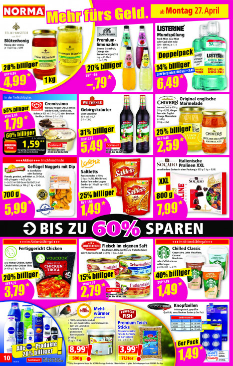 Bitte beachten Sie, dass dieser Text automatisch generiert wird und möglicherweise Fehler enthältBl = AR = LISTERINE FELIX HIMSTEDT u Be en SANBENEDEITO RA = ZERO Mundspülung Premium- Fresh Mint, Cool Mint Blütenhonig t + oder Cool Mint mild FERNEN flüssig oder cremig a limonaden | Lens 500 + 600 ml, je 1,11 da je ko(1 kg =4,99) Zitrone, Grapefruit, ‘= (1 1= 5,90) rire Orange oder “cemiger Blütenho" Beerenfrucht je 0,75 |, zl.-,25 Pfand æ re Doppelpack arme) N „Feiner Blütenhond = (11= 1,05) ZERO, aszzmeputen |. witnie © -OOL MINT } Grapetrut = eens 28% billiger 70% billiger © 14 9, billiger 4 TL NE \ es “Kg | EE ré = In der Tiefkühltruhe on ‚ Original englische Cremissimo WILT HE À CHIVERS Marmelade Walnuss, Nogger Choc, Schwarz- Lemon Curd je 320 g 55% billiger wälder Kirsch, Schokolade, Gebirgskräuter (1 kg=8,09), Ginger Solero je 825 ml (11 = 2,17) oder Bourbon Likör-Spezialität Jam oder English EEE Vanille je 1300 ml (1 138) 30% vol, je 0,7 | Orange Marmalade (11=7,84) je 340 g {1 kg=7,62) ij 2 ci LE gas Een ZENNE EN 31% billiger 25% billiger‘ 60% billiger 2 CHIVERS a ENGLISH ORANGEN MARMALADE 1,59" DET NORMA Plus App ‘Aktionszeitraun Aktion traum: ETES 27.04. bis’ 03.05.2026 2:04. is 03.05 Italienische SOCADO Pralinen XXL Per) | Geflügel Nuggets mit Dip verschiedene Sorten in einer Packung je 800 g (1 kg = 999) u edel in Cornflakes- Saltletts HL oder Backteig- dl Panade, gewürzt, anfrittiert ca. 30 Stück, Es Pausencracker je 100 g J == 600 g Nuggets + 4x25 g Dip = (1 kg = 14,90), Mini Brezel, (= 2x21,5 ml SüB-Sauer-Dip/2x21,5 ml Junior Farm oder Laugen MAL | SOCWO Sweet-Chili-Dip), je 700 g (1 kg = 8,56) Cracker je 1509 (1 kg = 9,93) 6 mit Meersalz rd Ey Fe Bo zZ 5 N Ne, 7009 \ 8 © a = 35% billiger & Mini, 800 9 er AA jd Bres 4 4 6 oe z 9 BIS ZU GO96 SPAREN Fleisch im eigenen Saft Chilled Classic A Fertiggericht Chicken Rindfleisch, Hähnchenfleisch, Truthahnfleisch (Ear) oder Schweinefleisch je 300 g (1 kg = 9,30) Caramel Cappuccino, Latte Macchiato, ae Sr car are 1 Macchiato NORD ID SUA 2.B. Mango Chicken, Butter CS > We h oder Caffè Latte no Chicken oder Chicken Tikka ch É Ks Schweinef st added sugar je 420 g (1 kg= 9,02) $ flels je 220 ml (1 1= 6,77) ® g Se, 3 + r hd pi En = N 70% billiger. } ad fi. 15% billiger = | 40% billige aaan rut ist ze | sel en pe ej | de De m: 026 2m Knopfzellen A Mehl- En leistungsstark, geprüfte u Qualität, verschiedene Sorten je Ger Pa /E NIVEA € würmer 5 EA getrocknet Ar = + 100% reines Naturprodukt CE El “ e frei von Zusatzstoffen, Geschmacksverstär- Premium Teich cR202 |3v 2.220 mAh en kern und Lockmitteln CR 2025 Bv @.160 man 12 © natürliche und. Sticks IR aa’ ca. 110 mAh, Back proteinreiche 4 Alleinfuttermittel ds für alle Zierfische, = Nahrungsquelle im Gartenteich De zn © je 500 g LE & pd je71(11==57) © © : ® (1 kg = 17,98) Poe F 5 ger Pack KWS ie + a FA —— 42, ut | Sema ge tested| me Be 7.043 CE **Gülig fürregistiete Nutzer der NORMA Plus App Nur der File einlöar Es gelten die Bedingungen inder NORMA Plus App.