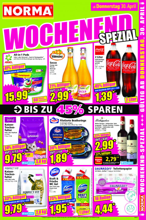Bitte beachten Sie, dass dieser Text automatisch generiert wird und möglicherweise Fehler enthältas | = Hp Ei Ÿ- r < y All-in-1 Pods Color+ oder Universal+ „Touch of Unstoppables” (Valensınä 2 Liter az je 60 Stück für 60 Waschladungen (pro Waschgang -;27) koffeinhaltiges Secco getränk Erfrischungs Orange oder je2l Pfirsich. 22gl.-,25 Pfand 7% vol. Maracuja (1=-,70) A je 0751 um Verd (11=3,99) er we SA li paps Go ‚Yalensna ) 35% hingen zum Vergleich ww p1251=159 US x ei 39 LE [2 Liter OBIS zu A5% TELEN Te RER Filetierte Bratheringe Fldjehen 9 in würzigem Aufguss Müller-Thurgau - halbtrocken, Spät- Katzen- je 325 g, Abtr-Gew. 200 g (1 kg = 9,45) burgunder — trocken, Riesling - trocken, Trocken- ed WC Dornfelder - halbtrocken oder futter je 0,751 (1 1= 3,99) Weinzeit - lieblich Huhn oder Thunfisch je 3,8kg Brat! (1 kg=2,58) | wi I MEY) rs Fetkigppcha, > Ki © Frtkappschan Ey 9 és ES = N 7 US er re À (TEE 99 Ei heij p) li rn 9 Nur gültig mit NORMA Plus App KE en von 30.04. bis 03.05.20: PERFECT FIT DAUNASOFT: Toilettenpapier Katzen- mit Motiv „Delfine“ 3-lagig, je 16x150 Blatt Trocken- mm futter en 3 CE Huhn oder Lachs Kraft & je 2,8 kg (1 kg = 3,50) Zet Frische Di DIM id — % a à WC Gel (IE k Lime, Floral oder DAUNASOFT, = Ocean Fresh | bi jer ED D A 4] PERFECT FIT = (11=1,95) # bs & FRISCHE 3,95 eich; UVP 750 ml = ie -195 @ um Vergleich: uvP750 ed PN EL 9/13 Biozidprodukte vorsichtig verwenden. Vor Gebrauch stets Etikett und Produktinformationen lesen. iM „un "Gültig für egstrerte Nutzer der NORMA PusApp. Nur in der ale eilösbar. Es gelten die Bedingungen in der NORMA PlusApp. 18260
