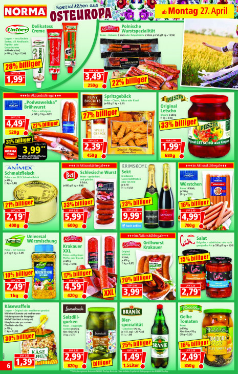 Bitte beachten Sie, dass dieser Text automatisch generiert wird und möglicherweise Fehler enthältx % ABER HS IR ar Spe ziolitäten aus & à S 4. ab „Montag 27. April & OSTEUROPA: Sr S. Fe pt = 8 Stück 2 Stück, je 250 9 (1 kg= 13,96) —— Æ Grive) = mild oder scharf, FT dd je 160 g (1 kg= 12,44) “u hay N & | af # Hé j m. gr billiger pl B a we UVP 2,79 Fr uw SA DN | en kt Ze 2509 @ 2% billiger à EN +++ Im Aktionskühlregal+ ++ je450g (1 kg=5,31) pus” wa je 520 g (1 kg = 8,63) je680g GE A 4 & 3% hilfiger zr Pa rk pus Ce. 5209 @ : 31% billiger N “kg Sptäzgelnsch - Pott grrr secs NORMA 3 A 99 Kende AT UNE) 4509 @ 6809 @ KRIMSKOYE ANIMEX je 400 g 8 Stück, ( (kg = 548) ze je 600 g (1 kg= 9,98) je 0,751 | DT AL: (11= 13,32) pe 14 Stück, { Re a ) je 700 g MES D) = Fo Ke lj ig 21% bi uiger 339 billiger 3% billig 16% billiger r\ UVP 2,79 UVP 8,99 UVP 12,99 Il UVP 5,99 KRIMSKOYE EN KRIMSKOYE EXD 4009 @ 6009 @ 7009 © ++ +m Aktionskühlregal +++ Bavaro) je 530 g (1 kg = 5,26) cn je 1 kg (1 kg = 2,49) ae ln | Kr 5 Stück, je 420 g au je 450 g 1% pige are) LT ET (1 kg =1093) (kg =887) RST dl 10% billi ger 17% piniger R [TEKEN ME UVP 5,59 70% nilliger rn UVP 4,99 LE" Y 4,59’) 1kg @ € a 4209 @ = Mit feiner Käsenote und mediterranen [LS # à Kräutem passen die knusprigen Waffel-Taler ideal zu Antipasti, Glas Wein oder Bier Käseplatte oder pur zu einem a je 100 g je 8209 5% vol je 850 9, 1 kg = 13,90) Abtr-Gew. 520 g je 1,51,z2gl.-,25 Pfand Ka Abtr-Gew. 470 g (kg =5,75) = BTS (les (1 kg =5,30) Gr 2e En Ee Im By + re Eee) Lila niger u Z ETES à 6% bi ) KÂSE BÀ À ne UVP 2,99 \FFELN 5 8209 @ Le SLiter @ À 8509 @ mir