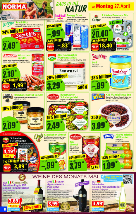 Bitte beachten Sie, dass dieser Text automatisch generiert wird und möglicherweise Fehler enthält&+ € N A TUR a Montag 27. April à Red Bull’ AR koffein- und taurinhaltiges Erfri- 2 je 2x20x0,5 1, zzgl. 2x3,10 Pfand (1 1=1,02) a Edition oder Sea Blue Edition je 250 ml, zzgl. —25 Pfand (1 | = 3,96) schungsgetränk - Classic, The White Lübzer = Clubs, Chipsletten, Pommels, NicNac's, Erdnuss istenl-- Locken und Saltletts je 280 g (1 kg = 8,89) 33% billiger = + 7 39% nilliger 6 statt149 * statt 38,60 +: is übzer 2 er nz ul 4% billig à jd k-Hits 0 Snac Nero, CR DL Mi. we 329 ALL a 5% bi ales: 6 it NORMA = NORMA lr 9° In Plus Nur gül 83” MTL Aktionszeitraumr: ECO Nur gütig mit NORMA Plus App nszeitraut 2, N BETT 27.04. bis 03.05.2026 TE 03.05.2026 Baulzner > Wiener Würstchen oder Geflügelwürstchen Fe. Brat, Blut- oder Leberwurst je 500 g (1 kg = 6,58) 5 Stück, je 475 g, Abtr-Gew. 210 g (1 kg = 10,43) Br mittelscharf CET je 250 ml (1 1= 3,96) 37% billiger uvP 349 Wiener. * Würstchen Bratwurst | Vautzner vanespek Ti N ira £ 6% nilliger KNEL ERNA 28% get © 12 EL QE uv 4, A9 uvP 1,39 erder rant a = JAY AA NORMA Plus og” or =— 500 g = von 27.04. bis 03.052026 ET UNE ö, y @ ALTER 7 Puten-, Hähnchen- oder Schweinefleisch Mandel Box - Sesam, Klassisch, Kokos oder Veganer Linsentopf, Kesselgulasch oder DEI Nuss Box - Mandeln, Erdnüsse, Cashews 8 je 2809 (1 kg =9,61) Erbsentopf je 4309 (1 kg = 5,79) = je 350 g (1 kg= 11,40) = DRE a D LS > a CCE 10% billiger x Linsentopf ALTER 5 u n6 x KS Kesselgulasch ve 2 | SCHWEINEFLEISCH ALTER nilliger : ISTERN Dit feinem Schinken 16% XXL NUSS en maniere Cams uve2 99 ® wp 299 350 CE INCHENFLEISCH * Erbsentopf u Æ CA aoe ME pe laf 2, 2, a 399 > In der Frischfleischtruhe: 4 Kartoffelsuppe, Linseneintopf vegan —— _ mjn Schweine- Hühnernudel- oder Erbseneintopf mit Zugband FleischspieBe © je 400 g (1 kg =2,48) je 12x20, 9x35 |, 8x60 | aprika und Zwiebeln, un —>3 DRI JA me NaOH Sg ENTE mcneans 16% billiger 500 g (1 kg = 838) 7 Chili con Came, Bite Di @ veganer Linsen. CHILI CON SE Ö pi ? oder Erbsentopf CARNE sl Sr je 1,2 kg (1 kg = 3,16) rit Bohnen denen ins % Kan" 5009 verd oe 44% pilliger uudeltopf 24% I 33% billiger »“ Ps non uve 119 uve 499 uve 2,99 Rr EU en NORMA a ‚89 JORMA Plus App ı» 1, 2kg' 99° CE 03.05.2026 WEINE DES MONATS MAI [elis [el 20251 B Camas lla 2025 E BsorayA re 2024 E va Appassimento 97 punkte Felsenkeller Primitivo Puglia IGT Doppia Fermentazione Italien — halbtrocken Puglia IGP Deutschland — halbtrocken Riesling mit Muskateller Italien —halbtrocken IJK Leuchtendes Rubinrot mit intensiven Reflexen Spritzige, fruchtige WeiBweincuvée mit feinen Dieser Primitivo besticht durch intensive GRATIS) ‚Am Gaumen bietet er eine ausgewogene exotischen Aromen und einem eleganten Süße Schokoladennote. Beerenaromen und eine ansprechende Struktur mit lebendiger Säure und einem Säure-Spiel. Die Trauben für diesen Wein reifen je 1l(11= 369) harmonischen Profil. deal zu herzhaften ersten eo überwiegend an den sonnenverwöhnten Steil NS Gängen, gegrilltem Fleisch und Hartkäse. und Hanglagen an Neckar und Enz. ke je0,751(11= 5,32) je 0,75 1(1 1=5,32) ie 13,697 | 3,9977 I 1Liter © ea A Var © mo) [ES Menge ET 1A Plus App. Nur in der Flak rm PAU 1A PlusApp.