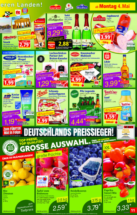 Bitte beachten Sie, dass dieser Text automatisch generiert wird und möglicherweise Fehler enthältenen Eanden! ce) CCR. Sekt Jagdwurst ug gld Gunn halbtrocken ej Original oder trocken ROSTOCKER je 750 g 5 je0,75 (kg =5,32) a (1l= 4,39) di il JAK oes a a acg u his 12026 Fincher: 42%bill er £ CE) Snack Machten | mit Schokocreme, 2 ‚88 2 fair NE N Vorpemmen Milchcreme oder Zitrone Nur gültig Li ETS je 535 g (1 kg= 15,94) von 04.05. bis 10.05.2026 Sachsen-Anhalt A) EET ae arie anar ot Lachsschinken Hausmacher Hexenbecher/ Pariser Art/ Mahlzeit Braten-Kasseler Schweinegulasch, Jägertopf oder Schinkennudeln GES -Riegel je 900 g (1 kg = 5,54) Hexenbecher — Softeis Moskauer Art/Nudossi/ je 100 g (1 kg = 12,90) Likôr Erdbeer-Vanille je 2x90 mi (1 1 = 11,06) oder Marille oder Schwarze — Hexenriegel Be Johannisbeere je 3x150 ml 15 % vol, je 0,71 (1 1= 5,70) (11=442) SA En = Jägertopf à ln Cham © pr wf pommern ï Et En Aktionszeitraum: raum; FE (04:054his-10.05.2026, 008° is.10.052026 Im Schaum- Pils Legende A] Kaviar zuckerfiguren LR) je 6x0,5 1,zzgl. 6x -,08 Pfand RE) Riesen-Mäuse, Kirsch-Banane- a Ar Creme oder Minimäuse je 155 g(1 kg = 19,29) Senf aus Heringsrogen — AVIAR mittelscharf mit Dill- oder FREE je 500 ml (1 1= 3,18) Knoblauch-Note dl um je75 DES Ss ni ( kg= 15,87) Z INDTE ac s Cr Er, 4 a mittelschärf 4 NE Vorpommern sw = Aktionszeitraum: ra (04051618)10.05.2026, 2 (04005) 10.052026 aus: MNEY Aus LA in Folge armer ro a CHLANDTEST.DE URLS ET Po nano 20 ARTIKEL TOP 1103 [A Fn IMENT! CH GE) UAL LS TOP AHL. # B = ak ë E AUSW GR Oral I chte N RN große Fü N Ny > € “ HG Ps EN Er a a À AG \ Nu RL B VOM © ne BODENSEE b} hd Be I Früchte Bio- | Heidelbeeren Paprika Äpfel vo Spanien/Marokko Sweet Mix Zitronen Bodensee Kl je 375 g Niederlande Italien/ Deutschland, Friedrichshafen (1 kg =10,11) KL. rot und gelb oder Spanien Kl | Sorten: Braebum, Jonagold HS und orange, KL, oder Grisp große Früchte, Kal. 73183 + 80/90 mm, 1 ko je 500 g je 2,5 kg (1 kg = 1,04) 2,5 kg 375 9 ñ > 333) zum ta esaktuellen 2,59 CMN CHER (Abbildungähnlich) LC (Abbildung ähnlich) (Abbildung ähnlich) (Abbildung ähnlich) SPAN rte jer NORMA Plus App. Nurin der liae enlosbar Es gelten die Bedingungen in der NOf A Plus App.
