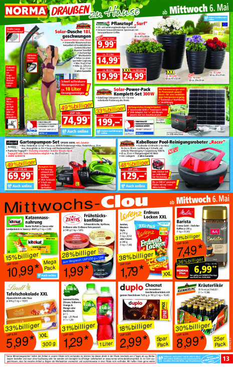 Bitte beachten Sie, dass dieser Text automatisch generiert wird und möglicherweise Fehler enthältEEE ab Mittw och 6. Mai ss. ZW ci Pr = # ZUN EES Pflanztopf + UV- und witterungsbeständiger Kunststoff Inklusive herausnehmbarem Spareinsatz mit m „Dusche herausziehbaren Griffen De wi ; n £ U 9 ca.47x34cm À geschwungen + Universeller Wasseranschluss zus kompatibel mit handelsüblichen Gartenschläuchen RS W Massiver Standfuß \ + Hochwertige Mischbatterie * Teilbar zur platz- sparenden Lagerung © Max. Druck 4 bar © Höhe 226cmx O®ca.1icm 3 Jahre Garantie Bas XXE @ ca.37x27cm „IP © ca.47x52cm © ca. 29x33 m un -Power-Pack Hack Kom plett-Set + Kabellänge Solarpanel ca. 5 m für eine | | individuelle Platzierung des Panels ng A Ra N pe NEA 1} [> | LE VEEN ee 4 2x 220V- = FUNKTIONALITÄT ron ‚Anschluss. £ GEERAUCHSTAUGUCHKENT| 7 GEBRAUCHSTAUGLICHKEN HANDBUCH GEPRÜFT [7 HANDBUCH GEPRÜFT 120 07 kiwa 7 Andere Ausführungen kiwa mor zes ERFT ak TS LE IGEPRÜFT 2x USB-Anschluss Gartenpumpen-Set crsoos coow, ax. rderdruck 3,5 bar Bis zu ca. 3000 /h Fördermenge « Max. Förderhöhe ca. 35 m/ Maulik « Kraftvoller 4.500 mAh Li-lon Akku Kabelloser Pool-Reinigungsrobote | Germany | für bis zu 90 min. Laufleistung + Schnelle und + Praktischer Tragegriff max. Ansaughöhe ca. 8m » Saug- und Druckanschiüsse G1" einfache Filterreinigung + Saugleistung 7000 Pa 26x37x23cm y + @ ca. 35cm « Fitergenauigkeit 60 Mesh Ei: « Inkl. Ladegerät 3 Jahre Garantie CE gogplieen > moe [ Een N 82. = Mittwochs- Erdnuss 2 Katzennass- Frühstücks- Locken XXL rm S konfitüre En nahrung NEW SIZE Barista Bunte Vielfalt in Sauce oder EE Schwarzkirsche, Aprikose, Jumbos, Crema Gold - löslicher Erdbeere oder Erdbeere fein passiert Western h N Landpicknick in Sauce je 48x85 g (1 kg = 2,69) je 340 g (1 kg = 5,85) Style Kaffee je 200 g Besen je210g (1 kg=3745) In (kg =8,52) MEGA PACK tr = oder Classic = 31%billiger © Rire (kitekat nr 7 je 240 g TI uve 1099 BUNTE VIELFALT ib (kg =7,46) É total Em En |L ion wensen 98%billiger gl Bd: 749°; 15% jlliger -189 38%billiger zoog zum Verglei ch:UvP230 9 “iche wi So uwe 1295 Mega he uv 289 36%billige! fr Pack 2 ze — (CE MT EN XXL DT JORMA Plus App 10, 0,99 199* ES 1,79 CUT 10,052026 Chocnut Kräuterlikör d ein besonderes Geschmackserlebnis mit KUEMMERLIM 35 % vol, je 25x0,02 | Tafelschokolade XXL De ganzen Haselnüssen 7,26 9, je 182 g (1 kg = 16,43) ‚Alpenvollmilch oder Nuss je 3009 (1 kg=19,97) “ Sommerfrüchte, x = EL me Zitrone, Erdbeere, e f = Orange & Mango oder 2 ES | Multifrucht se > ee jer —__— ee 25 Pfand E zug). A IS N (11=1,29) Le 31%billiger 30° — Br 1gx%billiger 30%billiger „ uvP 899 uv 189 uvP 369 uvP 299 & 25er gg: * spar \1Liter 5,99” "Es 1 29* 299 Pack 899 ack *Keine Mitnahmegarantie! Sofem der Artikel in unserer Filiale nicht vorhanden ist, können Sie diesen direkt in der Filiale innerhalb von 2 Tagen ab 0.9. Werbe- sen 5 = beginn bestellen und zwar ohne Kaufzwang oder Sie wenden sich bezüglich kurzfristiger Lieferbarkeit an www.norma-online.de/aktionsartikel. Es ist nicht aus- Au‘ geschlossen, dass Sie einzelne Artikel zu Beginn der Werbeaktion unerwartet und ausnahmsweise in einer Filiale nicht vorfinden. Wir helfen Ihnen gere weiter. iS
