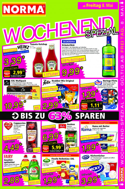 Bitte beachten Sie, dass dieser Text automatisch generiert wird und möglicherweise Fehler enthältw Tomato Ketchup Kräuterlikôr je 1171 = Das Original — Der Kräuterlikör aus Tschechien MEIN, (11=2,90) ‚Am Gaumen tritt eine dezente Schärfe hinzu, die jedoch schnell von ausge- EST? 1869 ll prägten Kräutemoten übertönt wird. Im lang anhaltenden Abgang erweist sich =: 7 Becherovka als ausgesprochen wärmend und leicht pikant. Sowohl pur, eisge Ce B ld kühlt oder aber als Mischgetränk macht der tschechische Kräuterlikör eine gute If BALE AUS Figur. 38% vol, je 0,7 1 (1 1= 14,27) Ca TTC MEIN2/4 GT TOMATO Se | I INZ A UVR er TOMATO KEICHUF 63%b UE) KETCHU | ë VAN oC) ET UNE z von 08.05. bis 10.05.2026 XXL Multipack Knabber Mix Original Herings-Filets 44 feine Mahlzeiten in Sauce oder Gelee je 200 g (1 kg = 14,95) Tomaten-Creme, Paprika + 14 Schleck Snacks je 4400 9 + 2109 (1 kg = 2,38) fel Creme, Pfeffer-Creme, En ma nf-Creme oder Tomate 10 Mozarrella Sauce je 200 g (1 kg = 6,45) 2 (@4 FWE MAHLZEITEN IN GELE + 18 SCHLECK SNACKS = Kie de AC ss € waag [23% 5111907$ 1 l'y 29) Uva Zu (TE 5) mmm Fre A FE 100% Cam = LT art CPU CET 06) 299 OBIS ZU 629% SPAREN mit feiner Kakaonote Cappuccino Auslese oder Eiskaffee Klassisch Rama mit Butter Karamell gemahlen, je 500 9 für 80 Tassen, si (1 kg= 13,98) gesalzen oder ungesalzen je 1kg Rama je 400 g (1 kg = 4,98) (1 kg= 4,49) Ko Dr D LEE] 199 Par) mr | zum Verglei ZN ess | ET) WE MN 5,99" Nur gütig mit NORMA Plus App ne 449 MENNE 19% Küchentücher Œ mit “Schmetterlingen”, saugstark und reiBfest Finello Reibekäse XXL 3-Jagig, je 8x45 Blatt Geschirr- Pizza- spülmittel D oder Original, Zitrone oder Granat- Á Gratinkäse je 225 g apfel je 900 mi (1 |= 3,20) (1 kg=8,84) un ES free A ri B zum WEE UV 3.89 Us De mm 1.9 A Se En **Gtig fürregistrierte Nutzerder NORMA Plus App Nurin der Fille einlosbar Es gelten die Bedingungen in der NORMA Plus App. 1926 0
