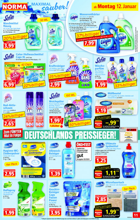 Bitte beachten Sie, dass dieser Text automatisch generiert wird und möglicherweise Fehler enthält(en? MAXIMAL / NORMA © S & Wasserenthärter Aini Power Gel je 2,15 | jgon für 43 Waschladungen (pro Waschgang -,19), Waschmittel ini Power Pulver je 1,3 kg für 52 Waschladungen (pro Waschgang -,15), flüssig Aini Power Tabs je 611 gfür 47 Waschladungen, ALL in One oder Quick Wash 47 Tabs (pro Waschgang -,17) oder Hygiene+ Gel je 1,1 | für 30 Waschladungen je 1,8 1 für 36Waschladungen (pro Waschgang -,13) ort (pro Waschgang —22) El met < pri LE QNE LE 445 UVP CCE = Se = à zum vergleich: lg reine ig verwenden. Vor Gebrauch uv sk == calg ER. ind Produktinformationen lesen, ‚99 = | 8 Color-/Vollwaschmittel NZ Caps XL je 42 Caps 7 für 42 Waschladungen (pro Waschgang —17) À ( in M > en So u LÀ 1 4 rn re, CES hs Kraftreiniger Wäsche- CEST fi es z.B. Fettlöser oder Kalk & En Schmutz je 1 1 (1 1= 2,99) parfüm So fin \ Sofi. VOLLMASGUTTEL Pure Pleasure, Sweet Dreams So fin oder Love Charm ANG a Au Ln RVD je 300 ml Dre 99 % AN std (11=6,63) © ® 0 ie dl EMA CIC TL ue 40 AE RI Cart bout 199) Müllbeutel N VZ ip oowk — CS mit Tragegriffen für leichtes Zubinden und gi WEAR Transportieren je 2535 | Weichspüler Flower Explosion, Spring [ mit Tragegriffen | & Bad-Aktiv- Morning, Tropical of M 155 n AES Blossoms oder Golden in) schaum I IL Island je 1,8 | für Ultra Glanz je 600 ml N kh 100 Waschladungen fin (11=442) I I À (pro Waschgang —02) 9, in mk I + NORMA Plus ad LA MES TL he von 12.01. bis 18.01.2026 Zum FÜNFTEN PREIS SIEGER Mal in Folge FOCUS 44/25 | DEUTSCHLANDTEST.DE MURS Lil NORMA era Pe DEUTS .. 4 le Ultimate + + ed OKO:TEST raue a + 2 2 Moi Spülmittel Saubermax Lemon oder Mega Power H Alwedk: Allzweckreiniger « effektiv gegen Fett und Stärkereste ygiene-WC- zuberp Frühlingsfrische ® entfemt Eingebranntes Zauberpulver Pur pulve Reiniger je 500 ml (1 1= 2,50) Lemon oder Ocean 2.B. Frühlingsfrische ut je 4x100g je1,51 = CK. (1 kg=7,38) (11=-3) REINIGI Ausgabe 03/2024 Uik IS D = MEGA (POWER E im Sor ent a Pol PTE) | 15L NORMA Si Plus LT Pr} || 4009, CPS En MES bis 18.01.2026 TTL Microfasertuch a CP EN Spül-, Universal oder Bambustuch ge ße! je 3 Stück Geschirr- À Duftspray ONE 2.B. Bamboo oder Reiniger LA LE O MICROFASER UNVERSALTUCH mors ren, Zitronenfrische je 250 ml Caps € ee (11=796) Fusion RT Power en ie ALL-IN-ONE «8 DUFTSPRAY __DUFTSPRAY je 30x15 g er Aal Aou dan (pro Waschgang -,13) 4 : der NORMA Plus ) 3 N | ET UNE LET TS TIE0T vu. EUR li für registrierte Nutzer der NORMA Plus App. Nur in der Flle eilösbar Es gelten die Bedingungen in der NORMA Ps App.