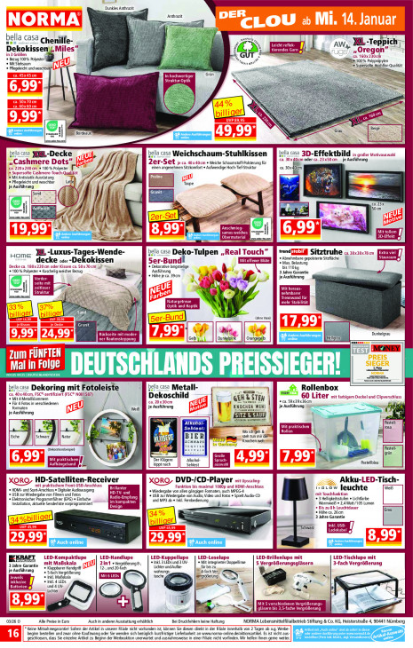 Bitte beachten Sie, dass dieser Text automatisch generiert wird und möglicherweise Fehler enthältDunkles Anthrazit een Zu Anthrazit EE NORMA ar x de DER LOU + Mi. 14. Januar bella CAS Chenille- comes XL -Tep pich; in 3 Größen Dekokisseny, Miles”: se AO L regon 1 el ca. 160x230cm « Bezug 100% Polyester 2 D 100 % Polypropylen Mit Stehsaum an us + Pflegeleicht und waschbatf*} N zei En + Supersoft. Hochr- Qualität Grün m DUN Struktur-Optik de ei N ide De 16,99" 5 = = es ne 44% . ÄN un a pilliger Q SS a À Ti gs Ef EEEN UVP 89,95 © AS % N En 5 ‘sr = Bordeaux 49,99" Grau ee pn, > bella casa YAL-Decke bella casa Weichschaum-Stuhlkissen bella casa 3D-Effektbild in sroser motivauswah! ca. 30x40cm oder ca. 23x50. cm je Ausführung Cashmere Dots 2er-Set je ca. 40x40cm + Weiche Schaumstoff-Polsterung für ca. 220x240 cm + 100% Polyester |” einen angenehmen Sitzkomfort « Aufwendige Hoch-Tief-Struktur @.30x40cm + Supersofte Cashmere-Touch-Qualität Mit Antistatik-Ausrüstung Latte oe Fi a + Pflegeleicht und waschbar Taupe je Ausführung nd | se see (4 = ca. 23x 50 an el Ì u kl Kr coste “à > 2 X Ro = 19,99% 8,99° PAT res 2 u Fe) DER... trend EE Sitztruhe c..2sx38x78m HOME XL -Luxus-Tages-Wende- bella casa Deko-Tulpen „Real Touch” decke a -Dekokissen 5er-Bund « Abnehmbare gepolsterte Sitzfläche Decke ca. 180x220 cm oder Kissen ca. 50x70 cm + Max. Belastung « Dekorative langstielige bis 110kg + 100 % Polyester « Kuschelig weicher Bezug Ausführung 3 Jahre Garantie [re m = « Höhe je ca. 39cm À je Ausführung seite mit zeitloser € Mit heraus- = Struktur AN nehmbarer meesters LEURS mehr Stabilität x x D 33% 37% fl MI billiger billiger Le Me (ohne Vase) UVP 14,99 EEN ve Ber-Bund [_iekissen MO jedeke | Granit = Pr) Rückseite mit moder- 7,99") \4} vr Dunkelgrau [9,99°124,99" ner Rautensteppung Gelb) Orangegelb Zum FÜNFTEN Mal in Folge vint Piz on en noen vella casa Dekoring mit Fotoleiste bella casa Metall- Rollenbox rop ca. 40x40cm, FSC®-zertifiziert (FSC® NO01587) Dekoschild 60 Liter mit tarbigem Deckel und Clipverschluss + Mit 4 Metallklammem ca. 20x30cm « CUE STE H = Tunnndie — © ca. 59x39x36cm Für 4 Fotos in verschiedenen „= Formaten Weiß, je Ausführung "x NOCHER WER! hair je Ausführung Gi je Ausführung HEEN DE SCHEREN Pastel Alkohol- 7 U La KW ie” | Sehtest: rosa, A Wo ich h & Eiche Natur Kn BIER steh tun mir die R wars 1 Knochen weh" Tra in Garh ny À 7 (Oekortonsbigpe) zin Pastell- ï hc al grün A id = TA à = 16,99" EEN Der Klügere Alkohol- ET EEEN LA a E Pastellblau u». Kippt nach Sehtest EEN E oO, HD-Satelliten-Receiver K Akku-LED-Tisch- XORG- mit praktischem Front-USB-Anschluss XORO- DVD-/CD-Player it upscaing- Brillanter Funktion bis maximal 1080p und HDMI-Anschluss '-aLow leuchte « HDMI und Scart-Anschluss « Digitaler Audioausgang HD-TV- und + Wiedergabe von allen gängigen Formaten, auch MPEG-4 mit Touchfunktion + USB zur Wiedergabe von Filmen und Fotos Radio-Empfang + USB zur Wiedergabe von Audio, Video und Fotos + Spielt Audio-CD « Elektronischer Programmführer (EPG) + Einfache Ne RE und MP3 ab « Inkl. Fernbedienung + 3 Helligkeitsstufen + Lichtfarbe Installation, aktuelle Senderliste vorprogrammiert Warmweiß + 2,4 Watt /105 Lumen Design + Bis zu 8h Leuchtdauer + Hôhe ca. 26cm 34% 3 Jahre Garantie 34 %billiger billiger u UvP 45,99 UVP 45,99 schwarz dik abel CN / 29,99 [29,99 8,99 KKRAET LED-Kompaktlupe LED-Handlupe © inkl. 3 LEDS und 3 UV- LED-Kuppellupe LED-Leselupe LED-Brillenlupe mit LED-Tischlupe mit 3 Jahre Garantie mit MaBskala 1» VergréBerung8, + Mit integrierter Doppellinse 5 VergröBerungsgläsern 3-fach VergröBerung « Klappbarer Handgriff 12-, und 20-fach Lichter und Aufbe- für bis zu je Ausführung « 5-fach Vergrößerung wahrungs- | 4-fach Ver, IN © Inkl. MaBskala ordering SNT AREN «Inkl. 4 LEDs Batte und 4 UV- =x QU, Lichter eff tasche e EN en $ gläsern bis 3,5-fache Vergrößerung = 03/26 O Alle Preise in Euro Auch in anderer Ausstattung erhältlich Bei Druckfehlern keine Haftung NORMA Lebensmittelfilialbetrieb Stiftung & Co. KG, Heisterstraße 4, 90441 Nürnberg * Keine Mitnahmegarantiel Sofern der Artikel in unserer Filiale nicht vor! inden ist, können Sie diesen direkt in der Aliale innerhalb von 2 Tagen ab a.g. Werbe beginn bestellen und zwar ohne Kaufzwang oder Sie wenden sich bezi lich kurzfristiger Lieferbarkeit an www.norma-online.de/aktionsartikel. Es ist nicht aus- 16) ‚geschlossen, dass Sie einzelne Artikel zu Beginn der Werbeaktion unerwartet und ausnahmsweise in einer Filiale nicht vorfinden. Wir helfen Ihnen gerne weite: