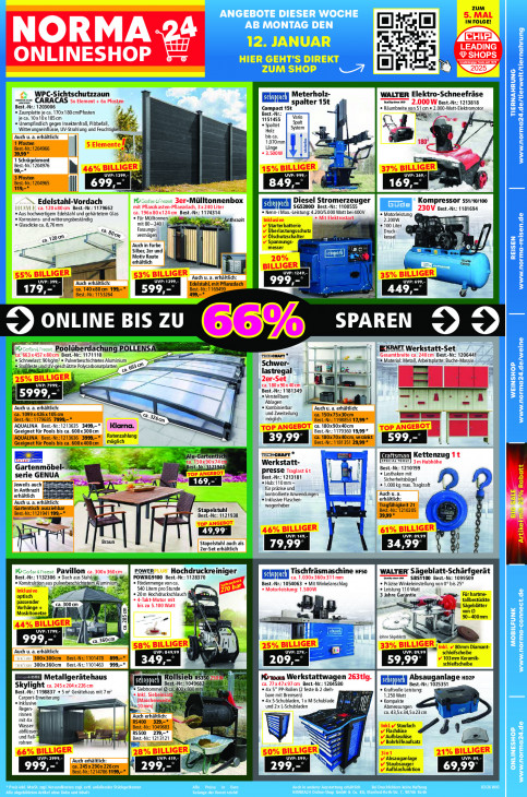 Bitte beachten Sie, dass dieser Text automatisch generiert wird und möglicherweise Fehler enthältZUM 5. MAL 47 IN FOLGE! NORMA IHN: I. LEADING NA ue] ONLINESHOP % HIER GEHT'S DIREKT nl ZUM SHOP 7 elf I > WPC-Sichtschutzzaun Meterholz- WALTER Elektro-Schneefräse 5x Element + 6x Pfosten EEE miet CARA spalter 15t mises 2,000 W Best.-Nr. 1213818 Best. 203006 Compact 15t + Räumbreite von 51 cm + 2.000-Watt-Elektromotor + Zauny te je ca. 170x180cm/Pfosten FR, Best.-Nr. TIERNAHRUNG je ca. 10x10x185cm 1151455 Vario No. « Unempfindlich gegen Insektenfraf Pilzbefall + Spaltet Witterungseinflüsse, UV-Strahlung und Feuchtigkel Holz 5 tem Auch u. a. erhältlich: bis ca. 5 Element te 4 1.070mm 180 Best-Nr: 1204966 Län ® + 3.500W À Best-Nr: 1204976 1 Schrägelement ij www.norma24.de/tierwelt/tier! h 37% BILLIGER Ir N 4% BILLIGER“ UVP: 1299, ï UVP: 269, 15% BILLIGER Best-Nr: 1204965 jé 849 169 IR 699 m ma Edelstahl-Vordach 3er-Mülltonnenbox esel Stromerzeuger Kompressor 551/10/100 ca. 120x80cm Best.-Nr. 1179662 mit Pflanzkasten-Pflanzdach, 3x 240 Liter ETE SG5200D Best.-Nr: 1100555 230V Best.Nr. 1181694 « Aus hochwertigem Edelstahl und gehärtetem Glas ca. 196x80x124 cm Best. 14 + Nenn-/ Max.-Leistu 200/5.000 Watt bei 400V en « Mit Elektrostart + Motorleistung A + Korrosions- und witterungsbeständig + Für Mülltonnen Sat mit 80-2401 se Anthrazit Inklusive 2.200W “ In + Glasdicke ca. 8,76mm v Starterbatterie © 100 Liter FE Al ne Fassungs- Überlastungsschutz Druck- en LEN vermögen SE v Ölschutzschalter kessel, om v Spannungs- N ‚Auch in Farbe messer n TE Silber, 2er und ac Motiv Raute ál REISEN erhältlich [ I 0% En BILLIGER 5 55% BILLIGER 53% BILLIGER Auch u. a. erhältlich: 35% BILLIGER ‚Auch erhältlich. UT 999 Edelstahl, mi Es www.norma-reisen.de 17 ca. 140x80 cm 199,-* 599 Best.-Nr. 449 Best.-Nr. 1153264 499,-* TANS ED UTC © überdachun: POLI —_— Werkstatt-Set Pe Ka: 663x457x80cm Best.-Nr: 1171110 TECHERAFT * Gesamtbreite ca. 240cm Best- : 1206441 Schneelast: 90 kg/m2 + Pulverbeschichtetes Aluminium > en a Material: Metall, Arbeitsplatte: Buche-Massiv. mL 2, Stoßfeste und UV.geschützte Poycarbonatpatten,” 683 ua be} Le ; Tis ti | ‚ie Joes lastregal | H 5% BILLIGER 8 2er-Set A NUL ca. 180x90x 40 cm [| Best.-Nr.: 1181349 5999 Ai © Verstelbare Ablagen Lai ‚Auch u. a. erhältlich: « Kombinierbar ‚Auch u. a. erhältlich ca. 1099x426x 105 cm und Zweiteilung ca. 150x75x30cm Best.-Nr.: 1179685 7999, * Ben möglich BestNr: 1198853 17,99 * AQUALINA Best-Nr:1213635 3499, larna. TOP ANGEBOT «. 180x90x40cm Best.-Nr. 1179360 19,99 * Geeignet für Pools bis ca. 600x300cm ToP ANGES OT] BE un AQUALINA Best-Nr:1213636 3999,- Ratenzahlung ca. 180x70x40cm, verzinkt Geeignet für Pools bis ca. 600x400cm möglich Best.-Nr. 1181351 29,99 * = TECHCRAFT A fern] Kettenzug 1t ca. 150x90 x74 a Werkstatt- 3m Hubhôhe Gartenmöbel- est; Best.-Nr. 210199 TOP ANGEBOT, presse Traglast 6t © Lasthaken mit serie GENUA Best.-Nr.: 1213181 Sicherheitsbügel Jeweils auch > Hu 110mm— in Anthrazit = für präzise und «1.000 kg max. Tragkraft Auch u. a. erhältlich se at © Inklusive Flaschen- kontrolierte Anwendungen erhältlich Auch u. a. erhältlic Atl Gartentisch ausziehbar \ wagenheber Tragfähigkeit 2t Best-Nr: 1121941 199,-* Stapelstuhl, Best.-Nr. 1210205 é | + 1 Best.-Nr. NI Top Ben E 4 49,99 46% BILLIGER 61% BILLIGER UP: Braun Stapelstuhl auch als Ë 2er-Set erhältlich 79,99 34,99 n Pavillon ca. z0ox360cm a Hochdruckreiniger Tischfräsmaschine urso WALTER Sägeblatt-Schärfgerät Best. pourkesnoo Best.-Nr.: 1128370 Ei ca. 1.030x360x311mm omeen SBS1100 Best.-Nr: 1099509 132306 + Dach aus Stahl. ti Best.-Nr. Konstruktion aus pulverbeschichtetem Aumiun ir « Fördermenge von ca. go sbar 1054063 + Mit Winkelanschlag « Präzise Winkeleinstellung von 0° bis 25° Inklusive 540 Litem pro Stunde a + Motorieistung: 1.500 + Leistung 110 Watt optisch + 20m Hochdruckschlauch 3 Jahre Garantie Für hartme- passender + 4-Takt-Motor mit je tallbestückte ca. 300 am df bis zu 5.100 Watt ed =" Sägeblätter Vorhänge + Moskitonetze 2 Fr: TL von® x 90-400mm . 44% BILLIGER ca. 285 cm A UT 99, wet ST Sen Is (ohne Sägebiatt) 999 ij 60 ci 58% BILLIGER 25% BILLIGER 33% BILLIGER, „Ink. v 80mm Diamant- Auch u. a. erhältlic DEEE 79, El schleifscheibe 1 300x300cm Best.Nr. 101478 899,- 349 209, 59,99 v/ 103mm Keramik- 1 300x360cm Best.Nr. 101463 999,- schleifscheibe 5350 EEEN Metallgerätehaus Rollsieb rk K1oıs Werkstattwagen 263tlg. Absauganlage no2r EM Best.-Nr. 1049682] 1 aan ca. 77x47x97 cm Best.-Nr.: 1204580 ETEN Best.-Nr: 1025351 Best. Skylight ca. 245x204x226cm 198837 + 5 m° Gerätehaus mit 7m? Siebtrommel @ cà 300 mm NeR + 4x5" PP-Rollen (2 feste & 2 dreh- + Kraftvolle Leistun « Inkl. Sieheinsatg Be 1 bare mit Bremsen) 1.250 Watt Carport-Erweiterung se + 4xS-Schubladen, 1 x M-Schublade ER «Inklusive — (Mascheg vig} und 2x L-Schubladen + Kompakte Regen- = Ls.10 mm) À I ‚Abmessungen innen Auch erhältlid ca. 43,5x 34,5x23cm mit4x Wasser. RS400 329,-* fl Inkl. Staufach abflüsser I]. Best.Ni 1049683 id Pi A bl | RS500 Y Flachdüse LR x und Fall- Best-N > Y Aufblasdüse BEN rohren AT ke æ-- x A # Bohrhilfeaufsatz sr 66% BILLIGER 128% BILLIGER A. ie 50% BILLIGER 3in1 21% BILLIGER EL Auch erhältlich: IT v/ Absauganlage à Y Staubsauger 999 ca. 245x290x226cm 299, ie 299 Y Aufblasfunktion 69,99 Best.-Nr: 1214786 1199,-