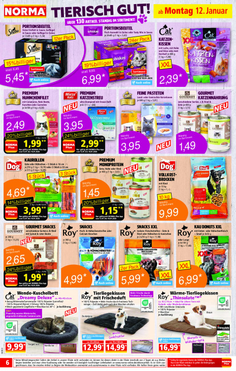 Bitte beachten Sie, dass dieser Text automatisch generiert wird und möglicherweise Fehler enthältTIERISCH GUT! PORTIONSBEUTEL PORTIONSBEUTEL « Feine Vielfalt in Sauce, Geflügel Se in Sauce oder Geflügel in Gelee Fisch Auswahl in Gelee oder Tasty Mix in Sauce BOnson je 12x85 g (1 kg = 5,34) je 24x85 g (1 kg = 3,43) KATZEN- CT [12er Pack KISSEN la > === a Ee oe nme venne mit Lachs, mit Huhn Sif» NG und Käse oder Anti ee = Hairball je 400 g eZ à on Fr (1 kg=5,98) SS ra JE) = ES EN Hairballl ! re. A Ne a % R 1270 {181012026} iam: Cr I: Ltr 5 I PREMIUM PREMIUM FEINE PASTETEN GOURMET ( Land- oder Gemischte-Variationen il HUHNCHENFILET KATZENSTREU Ci 1 GOURMET | KATZENNAHRUNG ijn mit Calamares, Rote Beete, ultra klumpend mit Ocean Duft je 680 g(1kg= verschiedene Sorten, z.B. Rind & Karotten oder Garnelen je61(1 1=—66) fi me: KE mz EE Ente je 4009 je 3x100 g (1 kg = 8,30) (1 kg=3,73) e= € Au 3 e m TN ATZENSTREU m6) | à ge = col A FEIN MET an u ré + HN ger 2 7 20%billiger 24%billi (TE rer) En Bene LP EC | IE CES ET DNS DELETE TI von 12.01. bis 18.01.2026 meer KAUROLLEN PREMIUM m. = A . | Ente oder Hühnchen - 5 Stück ä 16cm } MONOPROTEIN | | je250g (1 k 18,76) oder 3 Stück à 33 cm df 4 DC 5 LL) je315g(1k 4,89) il Ente, Huhn oder Rind dd je 400 g (1 kg = 3,63) er NONOPROTE, ie VOLLKOST- u um € BROCKEN we u mit Rind a je 10 kg YA & wonornor (U kg=1,-) D x HUHN va ne Re) Cor) wre =r orne Po; \ 14%bill kg 20% pilliger af RIND pr ee) a 3, EEN | AE MENT COURS 18.01.2026 EE ET online von 12.01 ET 18.01.2026 JORMA Plus App ss Te GOURMET SNACKS SNACKS XXL KAU DONUTS XXL GOURMET verschiedene Sorten z.B. Rind "e SNAKS ® Fisch- & Hühnchenstreifen oder leckere Fleischstreifen - Ente & ‚® mit Enten- oder Hühnchenfleisch Rind oder Hühnchen & Kaninchen mit Spinat & roter Beete Ro y Calcium-Knochen Oy Roy” — Small je 8550 9 je 200 en je 22250 g (1 kg= 11,98) (1 kg= 13,25) je 360 g oder Large ( kg = 13,86) je 4x100 g E ROY Roy ( kg = 17,48) EEE ran a TE EE a GOURMET - & HÜHNCHENSTRE! ENTE & RIND IN = (NDES AU POLLETET AU EU NOIR a er ne A rase) gimme mA à je en reen nn fh = À. DR Ee mea | aaneen ve samenge (kg =9,95) & 1,99" ua 2 il Nur it NORMA Plus App LT UNS MT US DATE ALTO Wende-Kuschelbett + Tierliegekissen + + ,Wärme-Tierliegekissen C u t ROy’ mit Frischeduft oy + Bezug Winterseite/Sommerseite: 100 % Polyester (Lammflor)/ + 100% Polyester « Mehr Frische durch Freshness-Tech- 100% Polyamid (Nylon) » Füllung: 100 % Polyester sro + Weich gepolsterte Liegefläche « Waschbar bis 30° C_je Ausführung nologie — Duf bleibt zuch nach dem Waschen erhalten sm + Mit rutschfester Unterseite er 4 dn | + 100% Polyester ot on re ot © Waschbar Braun je Ausführung NS) Dunkelgrau es iR RL ze = <= EP ©: | “2 ‘Andere A ns pr 3 Isersmärmender Bir eye inte” kern dark achter Rel: Forged Iron Vanilla Ice IGir in na] Tape Dunk ke] | nn} 03260 mend ES * Keine Mitnahmegarantiel Sofern der Artikel in unserer Filiale nicht vorhanden ist, können Sie diesen direkt in der Filiale innerhalb von 2 Tagen ab o.g. Werbe- beginn bestellen und zwar ohne Kaufzwang oder Sie wenden sich bezüglich kurzfristiger Lieferbarkeit an www.norma-online.de/aktionsartikel. Es ist nicht aus- ‚geschlossen, dass Sie einzelne Artikel zu Beginn der Werbeaktion unerwartet und ausnahmsweise in einer Filiale nicht vorfinden. Wir helfen Ihnen geme weiter.