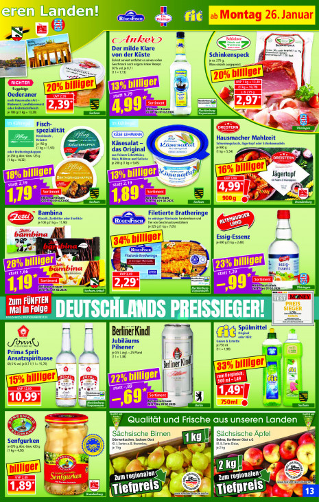 Bitte beachten Sie, dass dieser Text automatisch generiert wird und möglicherweise Fehler enthälteren Landen! Es de .— PE S =) Wen Der milde Klare 2 Sr a u JE cord ere aa 1 von der Küste Schinkenspeck LER Hack ! en Eiskalt serviert entfaltet er seinen vollen Den je ca.275 g, A de nd Geschmack nach original Anker Rezept. Ware einzeln ausgepreist GE ee | rang 30% vol, je 0,7 | (1=7,13) Saar rn rn Arsen EN Eagebüge ee Oederaner nach Hausmacher Art — Blutwurst, Landleberwurst 5 ‚oder Frühstücksfleisch eitraum: je 1809 (1 kg = 13,28) 260 is 0110222026 re Im Im a Fisch- spezialität Knoblauch- Es EZ 7 Kräuter. u un Hausmacher Mahlzeit je 150 g rente Käsesalat - Kä >.) Schweinegulasch, Jägertopf oder Schinkennudeln (kg =11,93) das Original je 900 g (kg = 5,54) je 250 g,Abtr-Gew. 125 g oder Bratheringshappen B aus feinem Schnittkäse, (1 kg= 14,32) Mais, Möhren und Sellerie je 200 g (1 kg = 9,45) LE Fu us stee aba % pe vl Kad Dampers Jägertopf md A [Akt onszeitraum: À D 2601 b: 1.02.2026, CT '26/01#615:01.02:2026, isen Brandenburg Bambina Filetierte Bratheringe R Klassik, Zartbitter oder Eierlikör in würziger Marinade handverlesen und { 11,02 À je 100 g (1 kg = 11,90) cn frei von Geschmacksverstärkem tE anp. mam je 325 g (1 kg= 7,05) E— À À Essig-Essenz sr A UE — je 400 (1 kg =2,48) ba ro TS CORTE Filetierte Bratheringe = Fe Tr Min Es: 3 Essenz = —E_# et & Ë on = d RO rar 2026, | Sachsen-Anhalt | 1261018 bis 01 WEE | MNEY | FUN IFTER LE Mali Lad FOCUS 44125 | DEUTSCHLANDTEST.DE ERS: PREISSIEGER! ne ese om Spülmittel Berli iner Kindl Original oder NEU; m Jubiläums Guave & Limette J'en je 750 ml Pilsener (11=1,99) ra Prima Sprit A je 0, ,zzgl.-,25 Pfand ns Ansatzspirituose (11=1,38) 9 69,5% vol, je 0,7 1 (1 1= 15,70) Kind \ Berliner Nan 6 SEN sa: Aktı 4 62 LL 260 is] C2 KE EE Qualität und Frische aus unseren Landen e Sächsische Birnen ET Dürrweitzschen, Sachsen Obst Dohna, Borthener Obst e.G Sächsische Äpfel Senfgurken Kl. I, Sorten: .B. Novembra, Kl. Il, Sorte: Elstar, je 670 g,Abtr-Gew. 420 9 je 1kg je2kg (1 kg= 4,50) ); Le & Ku m J s FRI. rss, Zum IL A il) te waw. herkunfisdeutschland de : ‘+ RS Brandenburg jeipreis en herkunfifgeutschland/de) IT LU