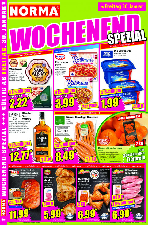 Bitte beachten Sie, dass dieser Text automatisch generiert wird und möglicherweise Fehler enthältDie Extrazarte In der ERDE De getker) aus Butter & Rapsöl Weihenstephan je 4009 (1 kg = 4,98) Dr Oetker, Ristorante Pizza Er CR SEE Salame, Pepperoni- Weichkäse Salame je 2x320 g Saint Agur SAINT {1 kg = 6,23) oder je 125 g (1 kg= 17,76), Tonno je 2x355 g 2 Saint Albray, ALBRAY, (1 kg=5,62) == L'intense oder Original volbruandig Aa "tre je 180 g (1 kg= 12,33) & würzig und viele weitere Sorten es 7 (storante > 3 LA 2 0) zum Vergleit n.UVP 2509 wein Te UVP= a azarte ARR vn rn el Blended LABEL Scotch Wiener Knackige Burschen Whisky 13 Stück, Label 5 Classic Black ist ein Blended. je13kg Scotch Whisky, der über 3 Jahre in (1 kg=6,53) Ex-Bourbonfässern gereift ist. I Er ist herrlich weich mit subtilen aa DES rs Torfeinflüssen und einem delikaten fruchtigen Charakter. — Fe 5xD EN 10% vol, je 1 1 (11= 12,77) + + ar M a Ds en genèse Boop | | LABEL ij er DREAM mn UE N Riesen-Mandarinen 1 UVP= Spanien zum | Kl.1, Sorten: Tango oder Nadorcott, À = ell en | Mandarinen mit süB-saftigem ausgewählt große undvltaminreiche ta Le Fruchtfleisch, Kal. XXX, | je2kg 7 y LL CAE (Abbldung mich) ELTERNTIERHALTUNG Hähnchen- Spanferkel- a Ss DEL UCHT, MAST Krustenbraten à UTTERMÜHLE Innenfilets durchgegart und ofenfertig = a SCHLACHTUNG, natur Ware einzeln ausgepreist Minuten- «er en En RIEGUNG, NN CEE Hähnchen- MG und saftig, steaks PR ECTS FEU vom Schwein ÿ schenkel REN ZN ET 800 g mit Rückenstü (1 kg= 7,49) marinier UC F je 2 kg (1 kg = 3,50) tn ee 5 Bi Rio F3 dba ca. 10 un“ 499 1-kg-Preis g= zu Te hr A 9 ne 9 B. os 9 zal J we Alle Preise in Euro ‘Auch in anderer Ausstattung erhältich Bei Druckfehlem keine Haftung, NORMA Lebensmitielililberrieb Stiftung & Co.KG, Heisterstraße 4, 90441 Nümberg 05260