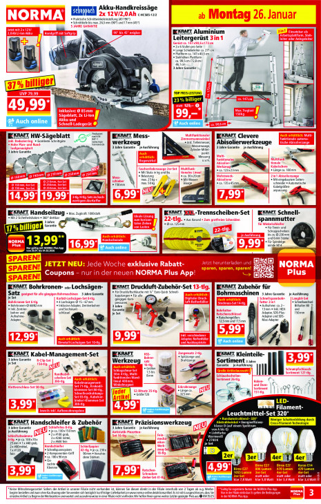 Bitte beachten Sie, dass dieser Text automatisch generiert wird und möglicherweise Fehler enthältAkku-Handkreissäge C-HCS85-12/2 « Praktische Schnittwinkeleinstellung (45°/90°) « Schnitttiefe bis max. 26,5 mm (90°) und 17 mm (45°) KKRAET Aluminium Leitergerüst « 2x 6 Stufen pro Seite « Lange Schiebeleiter ca. 271 cm il kt « Plattform ca. 147x40,5 cm Stehhöhen Plattform ca. 99,5 cm/72,8 cm/ 4 Fil 46,1 cm el = 3 Jahre Garantie ee Mi ee} 8 we Ll +! 5 Mi a R | TOP PREIS-LEISTUNG I DS Dea =) SE ar | H Je iS F1 + u Eu wo 24 Auch online SE | = ” Produziert KKRAET HW-Sägeblatt = Se 8471 nach EN KRAFT Mess- IKKBAET Clevere + Bxzellente Schnittgüte ei vanumpa- hannoverde 8 werkzeu © Inkl. Tiefenmesser, Abisolierwerkzeuge — 3 Jahre Garantie je Ausführung Wasserwaage, 3 Jahre Garantie je Ausführung Zylinder-Mittel- 3 Jahre Garantie zj punkt- iur Messung um. 42 fi A | * Mit Skala in kg und lbs + ca. 123x23mm + Länge ca. 180mm es | + ca. 30x20am + Belastung max. 25kg + « Mit Wasser + Mit eingebautem Seiten- B + 150mm waage + ca. 135x45 mm, schneider « Automatische m Kabelgrößen- 5 7 anpassung 24 pe we KKBAFT Handseiïlzug . max zugkratt 1000da Fe EXRAET JENL-Trennscheiben- Set RAE Schne + Mit 2 Sicherheitshaken « 360° drehbar « Aus Korund 3 Jahre hen Ee FA spannmutter « Oca. 125mm Se « Für Trenn- und rs % pilliger Garantie GR, zum Schruppscheiben bis zu © 230mm LS und 6mm Stärke "m 13,99" « Für Spindelge- S winde M14 von 26.01. bis 01.02.2026 Nur gütig mit NORMA Plus App cm Se gi 0 SPAREN! Coup en LE Kxrarr Druckluft-Zubehör-Set KKBAET Bohrkronen- sr Loch KAF Zubehör für Satz 3 Jahre Garantie + Für Druckluftschläuche mit 4” Euro-Quick Schnell kupplungen « Für alle Bohrmaschinen 2 sane carantie je Ausführung je Set gängigen Kom- + 4 Lochsägen © 15—67 mm pressoren. « Schnellwechsel- « Bohrkronen-@ 68/82 mm Inklusive Adapter, Zentrierbohrer | 3 Jahre a « Aufnahme: ca. 2- Bithalter 80 $ © Inkd. Zentrier- und Sechskant- Garantie, 13mm + Inkl. HEX- und bohrer und schlüssel 150mm Aufnahme- ne je Set Adapter, SDS-Plus- « RatschengröBen: Adapter und SDS- ‚Adapter @ |= 12,5 mm und 17,5mm Max Adapter S Er Sm x à: 5 ” En CRE KKBAFT Kabel-Management-Set BEKBAFT | KKRAFT Kleinteile- 3 Jahre Garantie « Spitzzange und Werkzeug u Sortiment : ire je Set * Größen re Pes If 1,5 bis a ue El enen |I I se, A 8mm ss fé il, Se N Pe 4 0 € Z 9 « Länge ca. 325mm || 1? ! | « GröBe 120 „& Ei TR Era ee mad Dee Ten " Filament- Er Leuchtmittel-Set 320° + Rundumstrahlend- 320° Wen r Schattenbildung durch IKKRAFT Handschle! fer & Zubehör KKBAFT Präzisionswerkzeug ENE Revan Cros: ilament-Technologie 3 Jahre Garantie 3 Jahre Garantie klasse D (auf einem Spektrum je Ausführung MU) je Ausführung + je ca. 100x150mm QT + 2x#100 grob, > NEL) + je ca. 100x70x 3x #240 mittel, \ + 2700K 25mm 1x #40 grob, 2x #600 fein | Org \ 2x #80 mittel AN \ je Set 1x 120 « Schnelspannsystem «je ca. 230x TS fein « 2-Komponenten- Griff 90mm « Verschie- 4 + ca. 180x90mm dene Stärken A 3er 3 Ge zackte ÈS E27 Kerze E14 Klemme Birne 470 Lumen 1055 2213 Dre EE TES = LCD *Keine Mitnahmegarantie! Sofem der Artikel in unserer Filiale nicht vorhanden ist, können Sie diesen direkt in der Filiale innerhalb von 2 Tagen ab 0.9. Werbe: beginn bestellen und zwar ohne Kaufzwang oder Siewenden sich bezüglich kurzfristiger Lieferbarkeit an wwrwnorma- online delaktionsartiel Es istnichtausgeschlossen, dass Sie einzelne Artikel zu Beginn der Werbeaktion unerwartet und ausnahmsweise in einer Fiiale nicht vorfinden.Wir helfen Ihnen geme weiter. Letzter gezeigter Preis aus @ KW 35/25