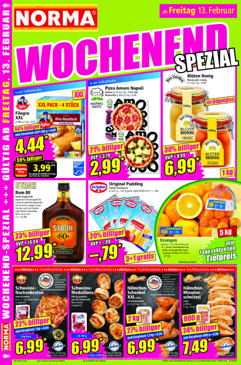 Bitte beachten Sie, dass dieser Text automatisch generiert wird und möglicherweise Fehler enthältGar, e % Blüten Honig AD © flüssig oder cremig In der ELLE je 1 kg (1 kg = 6,99) Pizza Amore Napoli zt, In dei „Tiefkühltruhe: Salame je 315 g (1 kg = 949) oder @) U Mozzarella je 320 g (1 kg = 9,34) = > 8 a GUSTAYO a care Gusto cd + 10008 = N Filegro Ô Gar. A XXL a A Pi - ch, je 480 g (1 p Con me Knutpriger Backteng y An p240 9 4,89 © BLUTEN — 10008 — FAT U HONIG À es | a CRE] sam \ ra » KN ER BLÜTEN ir CL er UVP= HONIG CITÉE) FE FRE Lo a FL SIG == 3,99” von 13.02. bis 15.022026 RC Fer 8) Al Original Pudding STROM DrOetker} vanine Geschmack Rum 80 je 3x37 g + 137 g gratis, ergibt 4x500 mi (1 | = 40) Stroh Original 80 ee - eignet sich hervorragend für A Cocktails oder Mischgetränke. fd Droetker ANJAS Gerne wird er wegen seines Does Xe ‚Aromas auch zum Backen oder Kochen verwendet. 0% vol, je 0,5 | (11= 25,98) Ge — 24 STIROH NARANJAS 180» Erp Orangen yup =1699 Spanien - im XXL-Erntesack zum # KI, Sorten: Navel/Navel Late, grof, sonnengereifte,hand- verlesene Früchte, Kal. 0 bis 1 tagesa ktuellen k5ig CE 19) Ha preis (Abbildung ähnlich) 5 DE B MAST List Reu OS DEL AO nd > Mi: BET UE Schweine- KD VERPACKUNG Ye I TE Hähnchen- EM Yo Hähnchen wurwherkunft-deutschland.de UNG Nackenbraten Medaillons R Schenkel PONT CUT ETES Minuten- ohne Knochen flüssig gewürzt, TS Kg, Ware einzeln aus der Semerrolle XXL natur, schnitzel EM PL UT I zeln DETTE UT à natur ausgepreist je 2 kg (1 kg = 3,50) Er A RE) IM 3E 7 ak N 8,99 FRAGE 1k0 Bs 29 4,99 1-kg-Preis Dl AN fa en L LA LA LU] TTT 400 ze za dn Es ns ee ns nel 9 9 JR fi ontz = 9,99) reits ab Montag, 2026 erhältlich ‚erhältlich Montag 1b ET fontag, (1kg All Preise in Euro Auch in anderer Ausstattung erhältich Bei Druckfehlem keine Haftung NORMA Lebensmittelfiialbetrie Stiftung & Co.KG Manfred-Rott-Straße 7, 90766 Fürth 07126 WO,