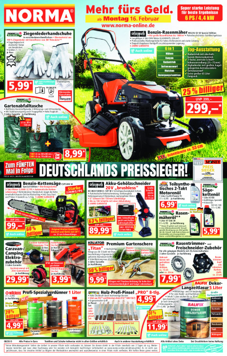 Bitte beachten Sie, dass dieser Text automatisch generiert wird und möglicherweise Fehler enthälta powerrec -Rasenmäher 5226.53 se Special Edition GTE Ziegenlederhandschuhe B Benz + Pulverbeschichtetes Stahlblechgehäuse in verschiedenen Bundfarben + Langlebiger 4-Takt-OHV-Motor (4,4 kW/6 PS, 224 cm) 2 5 « Enganliegend mit « Professionelles Markengetriebe für hohes Drehmoment und starke Leistung elastischer Stulpe « Doppelt Klappbarer Handgriff zur platzsparenden Lagerung am Handrücken es = Größen 7-11 crt GEB 6 M'EST] 4 je Paar LE Er Es Se & W Radantrieb mit abschalt Fangen barem Hinterradantrieb W 7-fache, zentrale Schnitt- al 5 TE Radantrieh 5 e, höhenverstellung (25-75 mm) x rz Seitenauswurf V Highwheeler mit groBen, kugel 5 ES gelagerten Antriebsrädern Be Muichen v/ Seitenauswurf ge Reinigungsfunktion ETES = Fangsack ip N in edn ques Kummer (Farbbeispiele) ash LÆ a en N 3122X = al powers & CTED Gartenabfalltasche « Reißfestes Kunststoffgewebe « Witterungs- und UV-beständig + Mit Stabilisierungsring und 4 Tragegriffen « Hohe Tragkraft wen "= 3 Jahre Garantie je Ausführung rn he u | ee ui —— ue & Ce ex x À >= bi, 8 LE ni 5 il 4 Ex) 8 NEE VER Mi == 7 id en Sr N: Bin, 1% ke kj BT af db, re À Kun in LME ef Ho AVES MNEY zum FUNFTER per nal in Folge Hs 5 | DEUTSCHLANDTEST.DE DEUTSCHLANDS PREISSIEGER! ee Pr 4 Benzin-Kettensäge csps»oo se st Teilsynthe EI Special Edition Eu Akku-Gehölzschneider tisches 2-Takt « Kettenbremse/ Handschutz stoppt die Kette BC-BGS150SR-X-SET M « Schnittgeschwindigkeit 6,8 ms Sei Säge- +4 « Automatische Kettenschmierung, werkzeuglose Motorenöl innerhalb kürzester Zeit bei Rückschlag « Inkl. Easy Start Kettenspannung « Bürstenloser, wartungsfreier Motor 1 Liter Carfit Premix TC kettenöl und Primer « Gewicht ca. 5,5kg (116,99) je Ausführung 1 Liter K100 Ed + Haftähiges Spezialôl gr, | + Viskosität: ISO VG 100 a 99) J EN 5 (0 in lade RE ns | 2 rt Rasen ee mäheröl** 1 Liter ATSAE 30 m — & a , 9) je Ausführung "Dieses Öl gehört nach Gebrauch in eine Altölannahmestelle! Unsach & maf Beseitigu die Umwelt k ed von Altòlgefhr Beimischung von SLR TE Fremdstoffen wie Lösungsmitteln, Brems- und Kühlflüssigkeiten ist verboten‘ EE ” eZ DER KREATOR Premium Gartenschere power Rasentrimmer- uns Caravan je Aus- 4 je Aus- 5 « Hochwertige, x; Ÿ Freischneider-Zubehôr führung führung Für alle gängigen Modelle mit 25,4mm Aufnahme 2 Klinge aus SK-5 Stahl mit Titang 24c1 3 Jahre Garantie je Ausführung Camping, beschichtung + Ergonomisc 24, Elektro- -@ geformte Aluminium Griffe « Schnittleistung max. 3 23m Ee zubehôr 3 Jahre Garantie 3 Jahre Garantie = Ir 8 je Ausführung je Ausführung mk oder ® je Ausführung Dekor- Langzeitlasur gevers Holz-Profi-Pinsel + Witterungs- und UV-beständig - Große Prof Spezialverdünner « Für viele Nadel- und Harthölzer Farbauswahl (11=4,99) « Hohe Deckkraft durch hochwertige Borsten + Inhalt: 5 Liter reichen für ca. 50 m? je Ausführung £ = = (pro Anstrich, r = ie ae « Ergonomischer Gri, je nach Untergrund) , > | Mads Fi je Pinsel- + Atmungsaktiv | In ina Set 7 (11=2,40) je Dose | DEKOR ES Mads ltd WE In Garn) gk 2 u hi Are) Kiefer Ee et) AN ceton, Nitro-Universals {il A & ku Terpentin” LA En, Ersatz ee verdünner 1 D „ijs il 08/26 0 Alle Preise in Euro Textilien und Schuhe teilweise nicht in allen Größen erhältlich ‚Auch in anderer Ausstattung erhältlich Alle Artikel ohne Deko Bei Druckfehlern keine Haftung *Keine Mitnahmegarantie! Sofern der Artikel in unserer Filiale nicht vorhanden ist, können Sie diesen direkt in der Filiale innerhalb von 2 Tagen ab o.g. Werbe- Artikel ts PE beginn bestellen und zwar ohne Kaufzwang oder Sie wenden sich bezüglich kurzfristiger Lieferbarkeit an www.norma-online.de/aktionsartikel. Es ist nicht aus CRETE Te EL) CRTC EE geschlossen, dass Sie einzelne Artikel zu Beginn der Werbeaktion unerwartet und ausnahmsweise in einer Filiale nicht vorfinden. Wir helfen Ihnen gerne weiter.