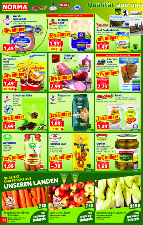 Bitte beachten Sie, dass dieser Text automatisch generiert wird und möglicherweise Fehler enthältOualitat US US EE ds Wurst- Rügen, Kreidefelsen 4 1 Spezialität Metzger- Dresden, Elbflorenz Leberwurst, Knackwurst oder Rotwurst = je 130 g (1 kg = 11,46) salat GED Geflügel- oder ook Eiersalat je 200g( kg= 995) Css Senf Brotaufstrich er ® Gemüse, Eier oder Kräuter 3 je 200 ml (1 1 = 7,45) En RV ST al GEFLÜGELSALAT anf Brot: EEE ME strich 4 CT Thüringer pmm Eierkuchen- 5 Salami “=, Räucher- Mehl je 220 g (1 kg= 13,59) u! fisch ohne Zuckerzusatz EN wi aromageschützt z je 2x125g, er verpackt, Stremellachsstücke Natur, Dill oder Pfeffer Ware einzeln “a 4e Zubereitung für 500 ml (11=2,98) Be € ausgepreist À 5 a lech Pr DE & Lat. Beam Fanggebiet BE UT | Fangmethode Chocolate Thins Snack Himbeere, Teigwaren Spirelli Fine) cher: = Erbsen Snack Paprika, Linsen Snack ‚| Minze oder je 1 kg Chili-Churras co oder Linsen Snack Pistazie (kg = 1,89) Be Senf je 100 g (1 kg = 14,90) À je 150 g ed 1 kg = 26,60) SR s/ En En SP | ss 7 LINSEN ERBSEN un pm 8 en . CD 5 gs" mi Or a in = 4 4 D @ Würstchen HB Russisch Brot Gurken in Eigenhaut Original Russisch Gewürzgurken Auslese 7 7 Stück, je 380, der süße Traum für alle, rot Abt.-Gew. 360 g (1 kg = 4,69) Abtr-Gew. 200 g (kg = 9.95) die es knusprig mögen, oder Senfgurken 3 RN je 100 g (1 kg=7,90) Abtr-Gew. 420 g (1 kg = 4,02), | ù _ de ’ 5 one ET hsen ULT Qualität und EE] CE ET m +5] el NOT LOL Las WA LIL V UNSER N rs Be LE 4 ERA ë >; F >’ Won nn 4 (ww herkunftgeutschland/e] | TT waa berk un ft deutsch Ar] 5009 Ma deburger Börde zum Sächsische Âpfel LL Brandenburger Chicorée zum Ee arotten Dohna, Borthener Obst e.G ‚Oberkrämer OT Vehlefanz, ‚Sachsen-Anhalt - Arensdorf, LU KI. HI, Sorte: Elstar, regionalen Betrieb SL Gartenbau een Bördegarten Gemüse jezkg KLI, je 500 g Klt je 2 kg Tiefpreis Tiefpreis ELLE