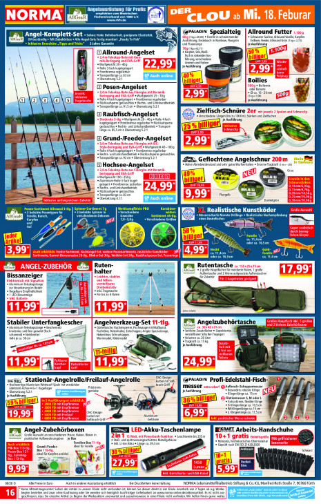 Bitte beachten Sie, dass dieser Text automatisch generiert wird und möglicherweise Fehler enthältngelausrüstung für Profis empfohlen vom Rheinischen 2) ‚hereiverband von 1880 e.V. id Fe Allround Futter Angel-Komplett-Set . senne: Hohe Dehnbarkeit, geeignete Elastizität, > @PAuDIN Spezialtei (1kg=49,83) « Forelle in schwimmender « Schwarzer Sachse, Allround Vanille, Karpfen- UV-beständig + Mit Zubehörbox » Alle Angel-Sets fertig montiert „Ready To Fish” ‚Ausführung, Knoblauch in Rainbow, Fluogrün Erdbeer, Feeder, Allround Grün (1kg 72) + Inklusive Broschüre , Tipps und Tricks 3 Jahre Garantie und Fluoorange je Ausführung D (kg=4271) N 1 Allround-Angelset + Karpfen, St, WeiB- me fisch in sinkender Aus u ur führung, verschiedene ‚Aromen und Farben mj 1 « Wurfgewicht 20-40. je Ausführung a + Rolle 3-fach kugelgelagert m Frontbremse regulierbar EN « Transportlänge ca. 63cm « Übersetzung 5. 1 Boilies + Boiliemix = ES oder Banane 2] Posen-Angelset fe m Oca. 16-20mm + Wurfgewicht 25—70g (kg: ,98) \(a] « Rolle 4-fach kugelgelagert « Frontbremse regulierbar je Ausführung ns G] + Rücklaufsperre geräuschlos + Rechts- und Linkshandbetrieb « Transportlänge ca. 91,5 am » Übersetzung 5.2:1 Zielfisch-Schnüre 3 Raubfisch-Angelset Verschiedene Längen (bis zu 1000m), Stärken und Zielfischen À + Wurfgewicht 20-40g « Rolle 4fach je Ausführung kugelgelagert « Frontbremse regulierbar « Rücklaufsperre geräuschlos » Rechts- und Linkshandbetrieb « Transport: länge ca. 85,5 cm « Übersetzung 5 B; A À 2) Grund-/Feeder-Angelset F À = + Wurfgewicht 40-1009 LES \ « Rolle 4-fach kugelgelagert « Frontbremse regulierbar ai + + ed =| —— Rechts- und Linkshandbetrieb « Rücklaufsperre geräuschlos | nt « Transportlänge ca. 92cm « Übersetzung 5.2:1 Mads En Ei #5. Geflochtene Angelschnur In Gerfnany == Le = Te Hoher Abriebwiderstand und sehr gutes Wurfverhalten « Enorme Tragkraft (1 m=-,05) — 3 5] Hochsee-Angelset 5 Grau RE « Wurfgewicht 100-250g BRA;G + Aluminium-Rolle 3-fach kugel gelagert « Frontbremse justierbar Min za == « Rechts- und Linkshandbetrieb RA: + Rücklaufsperre geräuschlos « Transportlänge ca. 83cm Fluogelb | + Übersetzung 4.1:1 = Dunkelgrün Posen-Sortiment Allround 3-tig. | Spinner-Sortiment 79 Wettkampfbleie PRO Karabiner- « 3 beliebte Posentypen für «3 beliebte Spinner in QT) MTL XL Realistische Kunstköder Forelle, Barsch, verschiedenen Dekoren CET Sortiment 44-tg. + Messerscharfe Maruto Drillinge + Re listische Nachempfindung + Verschiedene GrôBen SE Karpfen 1,0-5,0g ir) JE Aal Ze 4 N 2 EE DN @.11,4cm Ca oder ca. 16,5 cm = Hecht Er ca. 11,4cm forelle 2 oder ca. 16,5cm CRT Ruten- Rutentasche AllGeaR] halter prim det IGeaR| * 2 große Hauptfächer für montierte Ruten, 1 große >= FE AuBentasche und 2 kleine aufgesetzte Außentaschen Bissanzeiger für Zubehör + Aluminium-Teleskopstange zur Verankerung im Boden f_ « Regelbare Empfindlichkeit + Inkl.Tragetasche « Für bis zu 4 Ruten « 1 LED-Bissanzeige /_ er $- (ohne Inhalt) Stabiler Unterfangkescher _ Angelwerkzeug-Set AlGeaR] Angelzubehörtas sche + Aluminium-Teleskopstange « Keschemetz « Gürteltasche, Rachensperrer Fischwaage mit Maßband, knotenlos und fein gewebt (isch- Fischtöter, Rutenhalter, Entschupper, Angler-Spezialzange, « Seitliche Zusatzfächer « Gepolsterter, 4 En En: verstellbarer Schulter-Tragegurt N ai schonend) + Netzbreite/ Hakenlöser, Schnurkapper, Volumen ca. 20 Liter tiefe je ca. 50cm Wurmnadel, Ködernadel « Tragkraft ca. 15kg LS _ je Ausführung = a Be =; mr, ane A ee CNC-Design- 5 kurbel mit Soft- @rauoın Profi-Edelstahl-Fisch- aix Stationär-Angelrolle/Freilauf-Angelrolle touch-Griff « Hochwertige Aluminium-Weitwurf-Spule mit verstärkter Präzisions- messer ‚Aufbrech-/Schuppermesser Edelstahl-Achse « 6+1 Kugellager « Besonders robuste Klinge « Übersetzung 5.2:1 CS EEE getriebe je Ausführung i je Ausführung « Klingenlänge ca. 15cm Filetiermesser S, M oder L xtra dünne, flexible Klinge ga nlliger] + $ Klingenlänge ca. 10,5cm + M Klingenlänge ca. 15 am CNC-Design Aluminium- + L Kingenlänge ca. 17,5cm kurbel mit Softtouch-Griff Gehäuse FE KKBAET Arbeits-Handschuhe Fa Angel-Zubehörboxen -Akku-Taschenlampe Au ‚R| Große Auswahl an verschiedenen Posen, Haken, Bleien in Leuchtweite bis 235m praktischer Aufbewahrungsbox je Box « Stoß- und spritzwassergeschütztes Metallgehäuse Forellen-Box + Robustes, hochelastisches Obermaterial Grund-/Feeder- ideal für Forelle + Inkl. Li-lon Akku ® Länge ca. 29,3 cm « Geprüft nach EN ISO 21420:2020 Box Schwarz ideal für Karpfen und Aal = ei ZE 2 NE: res mis a! = 08/26 O Alle Preise in Euro ‚Auch in anderer Ausstattung erhältlich Bei Druckfehlern keine Haftung NORMA Lebensmittelfilialbetrieb Stiftung & Co. KG, Manfred-Roth-StraBe 7, 90766 Fürth * Keine Mitnahmegarantie! Sofern der Artikel in unserer Filiale nicht vorhanden ist, können Sie diesen direkt in der Fliale innerhalb von 2 Tagen ab 0.9. Werbe- Artikel mi EN sind ab sofort in dieser beginn bestellen und zwar ohne Kaufzwang oder Sie wenden sich bezüglich kurzfristiger Lieferbarkeit an wunn.norma-online.de/aktionsartikel. Es ist nicht aus PT ® CRTC ONE MA CET TEE geschlossen, dass Sie einzelne Artikel zu Beginn der Werbeaktion unerwartet und ausnahmsweise in einer Filiale nicht vorfinden. Wir helfen Ihnen geme weiter.