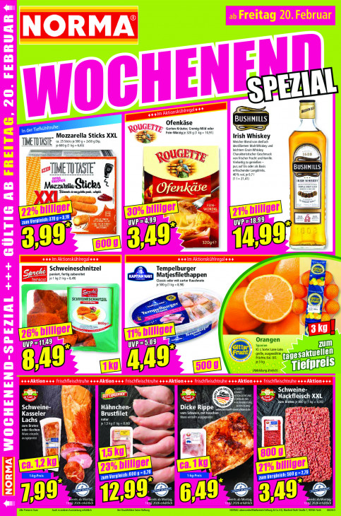 Bitte beachten Sie, dass dieser Text automatisch generiert wird und möglicherweise Fehler enthält= GZ bso Fr Ofenkäse BUSHMILLS | Garten-Kräuter, Cremig-Mild oder ey In dei „Tiefkühltruhe: Fein-Würzig je 320 9 (1 kg= 10,91) „ Mozzarella Sticks XXL ca. 25 Sticks je 500 g + 250 9 Dip, Weicher Blend von dreifach Irish Whiskey TMETOT je 6009 (1 kg = 6,65) . destiliertem Malt Whiskey und leichtem Grain Whiskey. Charakteristischer Geschmack RR 6 \ HAL D) VE von frischer Frucht und Vanille. Wm | Vielseitig zu genießen - gr -;» pur, auf Eis oder als Basis. Lj Term Ss SIMEUISE erfrischender Longdrinks. Ne nn u ET 40 % vol, je 0,7 1 (1 1= 21,41) 4 Mozzateua Stick \ 7 Cri DS des y À | “Bétonnets de maga pundı, hk D 319 zum Vergleich: 3709 18193 7 uup=1493 [Te en aal) en A Schweineschnitzel Tempelburger Siska paniert fertig zubereitet je 1 kg (1 kg = 8,49) tn Matjesfilethappen Classic oder mit zarter Rauchnote je 500 g (1 kg = 8,98) A SCHWEINESCHNI EL ES er“ x x wer ie a se Orangen TEE UVP= 5109 Spanien zum a KI. |, Sorte: Lane Late, ‚Fruch große, ausgewählte Früchte, Kal. 0/ LTÉE ktuellen je3kg g 9 CE 6,1 uik! preis ol (Abbildung ähnlich) OS DE TO ui Schweine- SSCHLACHTUNG DAT Hackfleisch-XXL VERARBEITUN 36) Schweine- Hähnchen- > VERPACKUNG zum SEN Dicke Rippe EEE TE KA Kasseler Brustfilet vom Schwei mit Knochen: natur Ware einz« EEE a Lachs je 1,5 kg (1 kg = 8,66) y zum Braten — En v CEE ha re einzeln 4 1 EE FN nn me dj kn = pe z L ë ve ig À = 19 1-kg-Preis CELL 1-kg-Preis A ek um Vergleich {il} um vergleich: 5009 Ar 8 nes B. 5 Ne 9 g 49 À IE Rd 1b Ei ontag 2 reits ab Montag, its ab Montag, Bereits NEU .2026 eıt Ku ich erhältlich All Preise in Euro Auch in anderer Ausstattung erhältich Bei Druckfehlem keine Haftung, NORMA Lebensmittelflialbetrie Stiftung & Co.KG Manfred-Roth-Straße 7,90766 Fürth 081260