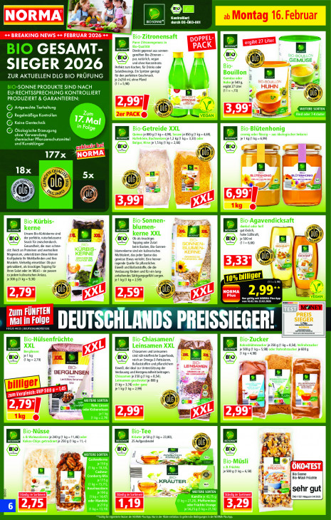 Bitte beachten Sie, dass dieser Text automatisch generiert wird und möglicherweise Fehler enthälter Sr = 7 à Kontrolliert Sue Jp D durch DE-ÜKO-001 y Bio-Zitronensaft Purer Zitronengenuss in N Bio-Qualität Û su GESAMT- Direkt gepresst aus sonnen- gereiften Bio-Zitronen — a pur, natürlich, vegan Ê BIO-BOUILL und ohne Konzentrate. „GEMÜSE Perfekt zum Kochen, für Drinks oder Bio- Ne SIEGER 2026 Salatdressings. Ein Spritzer genügt Bouillon ; E so ZUR AKTUELLEN DLG BIO PRÜFUNG für den perfekten Geschmack. Gemüse oder 5 je 2x250 ml, ohne Pfand ÿ 2 (11=5,98) Huhn je 540g, -SONNE PRODUKTE SIND NACH ergibt 27 Liter EU-RECHTSSPRECHUNG KONTROLLIERT (11=-,15) ©; Sl © PRODUZIERT & GARANTIEREN: pt, Ÿ a Ss Ke G Artgerechte Tierhaltung WEITERE SORTEN Zum Rind oder 7-Kräuter © Regelmäßige Kontrollen = WE Kt (G Keine Gentechnik 17 Mal KR Bio-Getreide XXL © Ökologische Erzeugung Bio-Blütenhonig ohne Verwendung Quinoa je 009 (1 kg = 4,99), Sesam je 850 g (1 kg= 4,69), ® cremig oder flüssig — aus ökologischer Imkerei chemischer Pflanzenschutzmittel ENS Haferkleie, Buchweizen je 1,2 kg (1 kg= 3,33) oder CENTS je 1 kg (1 kg = 6.99) und Kunstdünger 4 u Bulgur, Hirse je 1,5 kg (1 kg = 2,66) — 8 D) 20018 NH 18x EMA 5x = BLÖTENMONIG, - verum oo, ES 8 Ta 5 an) da =: ee 5 “D: D cn U rd Bio-Sonnen- Bio-Kürbis- Bio-Agavendicksaft kerne blumen- A dunkel oder hell gut löslich, Unsere Bio-Kürbiskeme sind kerne XXL hohe Süßkraft, di der perfekte, naturbelassene Ob als knackiges „a je 500ml Snack für zwischendurch. À ee Topping oder Zutat (1 1= 6,66) Nene) Gesundheit, die man schme- beim Backen, Bio-Sonnen- a kt: Reich an Proteinen und wertvollem KÜRBIS- blumenkerne sind ein kulinarisches & KERNE Magnesium, unterstützen diese kleinen = Multitalent, das jeder Speise das Ë Kraftpakete Ihr Wohlbefinden und Ihre 26 gewisse Etwas verleiht. Eine hervor- Muskeln. Vielseitig einsetzbar: Ob pur ragende Quelle für pflanzliches Aa, geknabbert, als knackiges Topping für Eiweiß und Ballaststoffe, die die Fl Ihren Salat oder im Müsli sie passen Verdauung fördern und für ein lang- Ma zu jedem kulinarischen Anlass. anhaltendes Sättigungsgefühl sorgen. wo je 300 g (1 kg = 9,30) | je 1 kg (1 kg = 2,59) EL LL Ez << & (l= en, = RT a Er 6 D 8 D me 2,99 en” eme) = Nee Ua CUT 7002 ts VEGAN ni von 16.02. bis 22.02.2026 —— — DW... MNEY | Ad um À IFTEN rl Lin armer DEUTS HLANDS PREISSIEGER! FOCUS 44125 | DEUTSCHLANDTEST.DE Pr re en ne Bio-Hülsenfrüchte Bio-Chiasamen/ ug Bio-Zucker 24 ® Kokosblütenzucker je 350 g (1 kg = 8,54), Vollrohrzucker EREN XXL BIOSONNE* Leinsamen XXL |; sr MS je 5009 (1 ko = 5,98) oder Rohrohrzucker je 600 g Berglinsen Chiasamen und Leinsamen je 1 kg sind nährstoffreiche Superfoods, (1 kg= 2,79) ati reich an Omega-3-Fettsäuren, u @) a s Ballaststoffen und pflanzlichem 4 (1 kg=4,98) Eiweiß, die ideal zur Unterstützung der à x BERGLINSEN Verdauung und Herzgesundheit beitragen. [>| Er Lentue: Chiasamen je 350 g (1 kg = 8,54), Bj a “ Leinsamen geschrotet je 800 g EE one Mi Rae cn (1 kg= 3,74) oder ganz je 1 kg (1 kg = 2,99) 2 5 A 5 © 5 de Bo, 1 & LEE el k = pr © m B— re Rote Linsen Ke = Rn ee oder Kichererbsen zum. AR URS HE] ris Sf = Bio-Nüsse Bio-Tee 2.B. Walnusskerne je 240 g (1 kg = 11,46) oder Kräuter je 50 g (1 kg = 23,80), B Kokos-Chips getrocknet je 250 g (1 kg = 11,-) ON) 25 Aufgussbeutel Ê NE | & Ä 2e Ö Ken Se WEITERE SORTEN 1e) Ke Cashewkerne Bio-Müsli & je150g z.B. Früchte Pt 2 (1 kg= 18,33), Cashew- je 500 9 (1 kg = 6,58) Bio Sonne Cranberry-Mix BIO. Bio-Müsli Früchte RET] k ‘ (kg = 15,71), à KRÄUTER wo | = z Et OEL en zo R je190g [ES er WEITERE SORTEN é & — sehr gut Be = 8 4 ÖKO -TEST-Magazin 042025 4 (1 kg= 14,47) Kamille je 43,75 9 hk wd oder Mandeln (1 kg = 27,20), Pfefferminze #., 4 ke Ere om je210g oder Früchte Orange pe ie (1 kg= 13,10) je56.259(1 kg=21,16) REE EEE