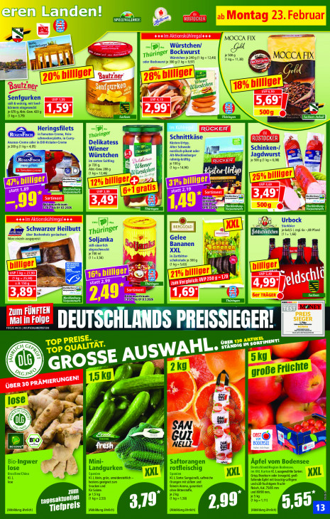 Bitte beachten Sie, dass dieser Text automatisch generiert wird und möglicherweise Fehler enthälteren Landen! [AAL IN Bag: Montag 23. Februar = = == MOCCA FIX burger lln mr ewu Würstchen/ I san Gr re Thüringer Bockwurst je 500 g LA Würstchen je 240 g (1 kg = 12,46) (1 kg= 11,38) oder Bockwurst je 300 g (1 kg = 9,97) MOCCA FIX ee | ER Gel bi hert fl 3 ey FR süß & würzig, mit Senf- Senfgurken körnern eingeweckt er je 670 g, Abtr-Gew. 420 g 9 (1 kg=3,79) Anhalt Im Heringsfilets =D] RÜCKER in Tomaten-Creme, Fein- Thüringer Schnittkäse Ananas-Creme oder in Dill-Kräuter-Creme schmeckerplatte, in Curry- —e LA je 200 g (1 kg= 4,95) Delikatess Alter Schwede Küsten-Urtyp, Ea Wiener nordisch-pikant oder Schinken-/ 27 Würstchen Alt-Mecklenburger NE Jagdwurst Er: En im zarten Saitling rahmig-kräftig 3 je 500 g (1 kg = 6,98) ed je 7209, "u > je 100g Abtr-Gew. 280.9, Wiener fl {1 kg = 14,90) a (1 kg= 12,46) (kochen Sec L. A Lt EN En Cr men Ne cata Aktionszeitraum: 123'021is 01.03.2026, Thüringen [0110320261 ’rpommern LE, ewu 14 Urbock Starkbier Ae Schwarzer Heilbutt Thüringer PEA ie 6005 1 2201 6x 08 Pfand über Buchenholz geräuchert Gelee CE Ware einzeln ausgepreist N Soljanka if süB-säuerlich ar Bananen sl abgeschmeckt XXL je 700 ml (1 1=3,56) in Zartbitter- 8 schokolade je 300 g Fr Ps FETE id aen Ü (1 kg=5,63) Ü [nitiger ze €) at É U \ \ 1 | pe = Aktionszeitraum: Sachsen 23702%bis 01.03.2026; | MNEY zum FÜNFTEN EBEN ge FOCUS 44125 | DEUTSCHLANDTEST.DE DEUTSCALANDS PREISSIEGER! ne = ToP PR ACL LL 120 CH GES ALIT } STANDIG RH ToP Q 2 AUSWAHL 5kg 8e GR SSE 2 Kd ns große Früchte fi ee 7 as EL 056 Œ D “as De Cr SAN [2222 PF, UI a A BODENSEE 810: HM fresh, NELLT. an ie er ka [3 LS Bio-Ingwer Mini- Saftorangen Âpfel vom Bodensee lose Al Deutschland/Region Bodensee, Br: Spanien Landgurken Spanien rotfleischig im XXL Karton Kl. I, ausgewählte Sorten: Kl rime KL klein, grün, unwiderstehlich — KKL KL 1, Sorte: Sanguineli, saftreiche NAL Grisp, Braeburn oder Jonagold, groß- NAL lose bestens geeignet zum Orangen mit süßem und fallende Äpfel mit knackig saftigem Snacken und feinem Aroma, garantiert fleisch, Kal. 75/85 mm und süß-fruchtigem Frucht- LL für Salate. ohne Bitterstoffe, und 80/90 mm, je15kg tagesakt A LA (1 kg= 2,53) se en is 319 299 CEE (Abbildung ähnlich) tal ld (Abbildung ähnlich) (Abbildung ähnlich) (Abbildung ähnlich)