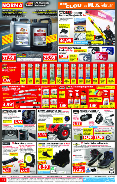 Bitte beachten Sie, dass dieser Text automatisch generiert wird und möglicherweise Fehler enthält- SAE-Qualitäts- Ps OPESSIONAL Motorenöl SAE 10W-40°5 SAE 5W-309 5 Liter (11=7,60) er (11=5,20) Qualitativ gleichwertig nach EU-Recht, gemd EE gleichwertig nach EU-Recht, gemäß: DO Teleskop- ® = ACEA C3 « APl SP « BMW Longlife-04 e ACEA A3/B4 « API SN « MB 226.5/229.3 e MB 229.51 29.52/229.31 « Opel/Vauxhall = PSA B71 2300 Renault RN 0700/ 710 Universal-Waschbürste x OVO40 1547 Porsche C30.» VW 504 00/507 00) = VW 501 01/505 00, © Teleskopierbarer Aluminium-Griff « Praktischer Absperrhahn zur Wasserregulierung bu IPT A N 3 Jahre Garantie EG | = 2 4 GroBer Bürstenkopf mit schonend % I weichen Borsten en 4% u 4 2 5 1:30 4 w tov IE 40 ce m Reinigung von großen Ems Mit Gummilippe Vig » Fensterflächen 5 EE. ET = als Fensterabzieher — und Photovol- ir PN dll EE = LE = EN taikanlagen Be geeignet = == ee Direkter Anschluss an KURT En e = u den Wasserschlauch ee ze E Kfz-Verband- ome A tasche DIN 13164-2022 3 Jahre Garantie à je Ausführung Made © Grundsätzlich sind di = Herstellervorschriften zu Prüfen Sie Mn cn Ger beachten und einzuhalte: das Verfalls- datum Ihrer Dieses Ölgehört nach Gebrauch in eine Altölannahmestllet Verband- Unsachgemäße Beseitigung von Al gefährdet die Umwelt Jede Beimischung von fremdstofen ist verboten, Po Lat, [11 pin 0 À = 4 æ um Genuchse 0 uns Seber! k 1 sperial Ichre und) im Haha 5 Kontakt m vie sa Plage Reinigen Spray si) = id Cockpit Geruchs- Universal Kunst- a Tür- Hohlraum- Unterboden- Spray Multi- Ketten Bohr- und und Stein- neutrali- Silikon- stoff Scheiben- Zitrus Spezial gummi- versiege- sierer Leicht- Pflege Reiniger Graphit- oder funktions- & Seil Kontakt Schneid- Pflege- lungs schlagschutz LL EL Spray gleitöl Spray Spray öl-Spray Vanille | öl Spray Spray Öl Spray Spray Spray Spray Fi carfi TE Hochglanz Politur 600 mi (11=9,98) Mikro- Du ur nn af 3 faser- varini tücher me er u I Insekten- 10er-Set Glasfaser- entferner ID Polyester- 1 Liter REA = in Go za mr feinspachtel spachtel HOTTE DE Mit Wirksamkeits- mms Be N = indikator, gegen stärkste == u ms | ad wahr 25 Verschmutzungen ps als Le = À] Er == Leder Zu] Scheiben- In Et Pflege Kunststoff- reiniger reiniger Autopolitur Felgenreiniger 600 ml Füllspachtel spachtel 1 Liter 1 Liter 1 Liter 1 Liter (11=5,99) (11=9,98) Actenes ee QE) Kfz-Zubehôr BEKRAFT, Sackkarren-Rad N Anhänger-Zubehôr « Passend für 48-mm- 3 Jahre Garantie « Für die meisten gängigen Modelle geeignet « Tragkraft ca. 100 kg 3 Jahre Garantie je Ausführung Stahlrohre je Ausführung « Pannensicherer Laufbelag aus geschäumtem Polyurethan (4 + Extrem ruhiges Fahrverhalten « Passend für viele gängige Vordersitze À À + Auch für Bollerwagen geeignet « Schnelle Montage + Rostfreie Kunststofffelge Inkl. Adapter zur 3 Jahre Garantie Verringerung des Design Schwarz! je Ausführung Achsdurchmessers Grau auf 16mm Blau + ca.140x150cm « Selbstklebende Rück- Nie wieder « Universel einsetzbar seite « Individuell zuschneidbar Luftverlust - KG « Stahlrohr- durch Reißverschluss-Teilung 20x200cm (1m =17,48) oder lästiges «Aus verzinktem Stahl Für alle gängigen Nachpumpen = © Inkl. 2 Schlüssel Anhängerkupp- O ca.48mm « Max. nutzbare Länge ca 11x11x lungen (außer ca. 63cm 19cm Anti-Schlinger- Kupplungen) Max. statische Stützlast ca. 150kg I = == a. 260mm cn rt Radbreite ca. 74 mm, Æ ohne ú © Achse ca. 20mm Sackkarre) Leder-Sicherheitsstiefel -Leuchten je austührung TOPTEX Sneaker-Socken MH « Hoher Baumwollanteil à für Herren Größe 39/42 -43/46 « Atmungsaktives Mesh-Innenfutter und klimaregulierende Coolmax®-Einlegesohle 1000 Lumen « Rutschhemmende PU-Laufsohle « 3W High Power LED + 2W LED + 2400mAh wiederaufladbare Hochferse zum Elastischer « ESD Ausstattung nach EN 61340-5-1 Schwarz/ Schwarz/ (130/110 Lumen) « 1200 mAh Schutz der + Größen 42-45 Rot Blau wiederaufladbare Lithium- Lithium-Batterie + Verschiedene Achilles- Rippbund Modi einstellbar « ca. 12x13x5cm sehne je Paar Batterie + @.17x5cm LEp-Stirnlampe IR Scotchlite- Robuste Reflective Material Stahlschutz- Mittelfußbandage für optimalen Halt COOLMAX Er Sn gpaar) Ss ee (gganiliger) Starke Magnete ©, roms na jeprüft pe an der Powerbank- LS | Biofresh {Model Fu ENISO Unterseite Funktion nn beside) 2 TA 2034:2011 09/26 O Alle Preise in Euro ‚Auch in anderer Ausstattung erhältlich Bei Druckfehlern keine Haftung NORMA Lebensmittelfilialbetrieb Stiftung & Co. KG, Manfred-Roth-StraBe 7, 90766 Fürth * Keine Mitnahmegarantie! Sofern der Artikel in unserer Filiale nicht vorhanden ist, können Sie diesen direkt in der Filiale innerhalb von 2 Tagen ab o.g. Werbe- Ar uchonlin sind ab sofort in dies, beginn bestellen und zwar ohne Kaufzwang oder Sie wenden sich bezüglich kurzfristiger Lieferbarkeit an wwn.norma-online.de/aktionsartikel. Es ist nicht aus- PT bes bar ds m PACE geschlossen, dass Sie einzelne Artikel zu Beginn der Werbeaktion unerwartet und ausnahmsweise in einer Filiale nicht vorfinden. Wir helfen Ihnen gerne weiter.