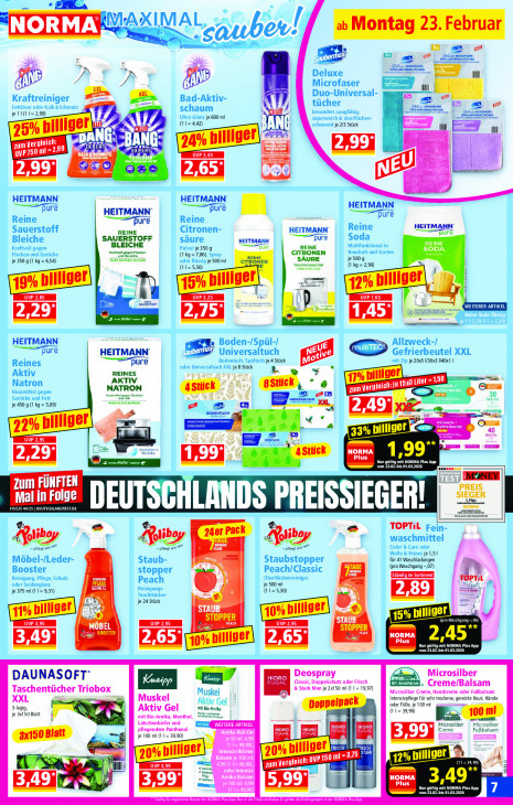 Bitte beachten Sie, dass dieser Text automatisch generiert wird und möglicherweise Fehler enthältPER A M'A XIMAL LE „NORM A ev. ab Montag 23. Februar 5 Li NE Ne ESS ane, S Deluxe un a? À 9 ‚À < Microfaser XXL Duo-Universal- all | Kraftreiniger ar Bad-Aktiv- = Pd Fettlöser oder Kalk &Schmutz schaum AE tücher jetl(tl besonders saugfähig, ( Ultra Glanz je 600 ml superweich & oberflächen- Cut 1 schonend je 2/3 Stück au u zum verglel Li Er ER Jr id el ELU TL 5 AY G za biliger) Eerten De za Hie UVP 3,49 EE AL HS oo HEITMANN HEITMANN HEITMANN Pure HEITMANN pure Reine Reine pure pure Reine HE! ANN Sauerstoff REINE Citronen- terra pure Bleiche SAUERSTOFF säure HEITMANN pure Soda LS Kraftvoll gegen BLEICHE Pechen Puiver je 350 g pure REINE Multifunktional in SODA Flecken und Gerüche vans (1 kg =7,86), Spray CITRONEN Haushalt und Garten mr son ie 350 g (1 kg = 6,54) oder flüssig je 500 ml STRONEN URE je500g {1 kg = 2,90) me ham 19% billi ger 12% billiger (is biiger! UVP 2,85 22 UVP 3,25 UVP 1,65 Er D. Ee: LE PS EN 9) HEITMANN —— na L Boden-/Spül-/ Allzweck-/ pure HEITMANN: > Gefrierbeutel XXL Universaltuch Bodentuch, Spültuch je 4 Stück ‘ip je 20x5 V30x3 V4Ox | Reines pure oder Universaltuch XXL je 8 Stück Aktiv REINES Natron AKTIV su X {7 nilliger e1 513 ter 190 ve Hausmittel gegen Stück ° 4 zum verglel Cee €) = Gerüche und Fett NATRON s 3 TEL je 4509 (1 kg = 5,09) ae eh SE Ti RE ar En si à à Cd Ku) a = 8 33% ige geurt NEK D aen NORMA 4Stück LT 1,99” Er et AR Ua + des MTL Zum FÜNFTEN Mal in Folge FOCUS 44/25 | DEUTSCHLANDTEST.DE DEUTSCHLANDS PREISSIEGER! Se 24er Pack TOPTiL Fein- = = {ols AXoiboy Mn waschmittel pteg set” teg wie © te Color & Care oder Wolle & Feines je 1,51 Möbel-/Leder- Staub- Staubstopper für 41 Waschladungen Booster F Peach/Classic TAGE (pro Waschgang -,07) Reinigung, Pflege, Schutz stopper Oberflächenreiniger an D oder Seidenglanz 1173 Peach je 500 ml je 375 ml (1 1= 9,31) Reinigungs- (11=530) feuchttücher je 24 Stück 10% bi uiger ë STE UVP 2,95 06) ) (TR sTo BOOSTER > ren 10% billi ger ICS Nur gütig mit NORMA Plus App Sn von 23.02 bis 01.03.2026 Deospray Microsilber DAUNASOFT’ Kneipp Classic, Doppelschutz oder Frisch Taschentücher Triobox & Stark Men je 2x150 ml (1 1= 19,97) 8. Creme/Balsam Muskel jer Creme, Handcreme oder Fußbalsam XXL Muskel Aktiv Gel oder Füße, je 100 ml Intensivpflege für sehr trockene, gereizte Haut, Hände 3-lagig, Aktiv Gel Fit Bo-Arnika ven Doppelpack (1 1= 39,90) je 3x150 Blatt mit Bio-Arnika, Menthol, En von EK Latschenkiefer und TT Fre} Microsilber Microsilber pflegendem Panthenol Erle] EN] ed reme Fußbalsam je 100 ml (1 1= 39,90) Amika Rol-On je 50 17) 3,99" ES ie ‚&0) 3x150 Blatt PE 0% bill ger EEE] [LES 15 M 4,99 (1 |= 49,90), Te ET) A (1234,90) UVP 4,99 oder Intensiv * ) osé Pi ‚Amika Balsam je100 4,99 5,99 ENEN = EU) Sn von 23.02 bis 01.03.2026 PRENT N EIRFF 9 7 9 für registrierte Nutzer der N A PusApp. Nurin der la einbsbar Es gelten di TEE A Plus App