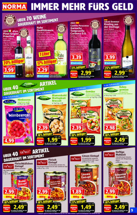 Bitte beachten Sie, dass dieser Text automatisch generiert wird und möglicherweise Fehler enthältNORMA IMMER MEHR FÜRS GELD > A el E QT ce te fil NA Al OR Garantiente Qualität Exddusiv | \u SI Tall ob Demmer 8 Ge = ua CL! EX Garantierte Wemel Cms 0 Pd PA Qualität 19 IE 4 Cm CL! Lj A oui JM 15 ki na == rs a A =) rs” r > 1 [A * M Nahe se Er 13 5: B allure he CT] & & A EEL 0 fj “ a 2,99 2,99 PATES 3 NE Auch online Paro (0021202) DAT ELU LE Nur gütig mit NORMA Plus App von 23.02. bis 01.03.2026 von 23.02. bis 01.03.2026 EE. ARTIKEL De ut Rahm- UBE NC Tiefkühltruhe: gemüse ORTIMENT DLL LL Gemüse Le Königsgemüse, DAUERH AFTIMS In der Tiefl einzeln zu portionieren — Broccoli & Blumenkohl, Bärlauch oder Noblesse Blumenkohl/ Gm Suppen-Gemüse je 750 9, je 750 g (1 kg = 3,97) In der Tiefkühltruhe: Blattspinat/ (kg 19) oder Kaiser-Gemüse je 1 kg (1 kg = 2,39) Himbeeren LC m tiefgefroren, gesüßt Broccoli [ ' Gélacech je 500 g (1 kg = 9,98) je 1 kg ( kg = 2,39) ns pl pen- à Ralungerriise a em üse À A Az ELS «3 VL Ch de = “#Himbeere ag Arn hi Moses N UE center ud u D ares wijde fl NT 1 y À ie y a (TE AE ME n = > 16% bil liger (kg =3,32) Er} Zu | | Ë 1,99” Eh 2,49" Ne) von 23.02. bis 01.03.2026 Nur gi mit NORMA Plus App von 23.02. bis 01.03.2026 Nur gi ig TES von 23.02. bis 01.03.2026 Nur gi CE it NORMA Plus App .. RTIKEL Deftige BE Mahlzeit mit gepökeltem, gegartem Linsen Eintopf Frikadellentopf, Schweine ET El Fleisch Schweinefleisch oder vegan Klopse Gulasch oder Königsberger AUERH je 800 g (1 kg = 2,36) je 800 g (1 kg = 3,74) Fleischbällchen Eintopf a Geschnetzeltes Züricher Art, Ce D) Eintopf je 800 g (1 kg = 3,74) Fleischragout Ratsherrren Art oder Gutsherren Topf oder Nudel Eintopf S E E Möhren, Kartoffel ® à kg on) | | N wei | EC | Er 3 Sj 5 | À g | 2 ] | 8 A a 7 Ar Zi 4 wit TR ee 4 er > IE > " re L 4 ; BL A) pilliger er CEE) CEE) nm (1kg = 1,86) 16% billig CE) VEN 2,49° Ua 149" VEN MEET Nur gütig mit NORMA Plus App von 23.02. bis 01.03.2026 PTT RTL von 23.02. bis 01.03.2026 L re von 23.02. bis 01.03.2026 Nur gütig mit NORMA Plus App TÉL registrierte Nutzer der NORMA Plus App. Nur in der Filiale einlösbar. Es gelten die Bedingungen in der NORMA Plus App